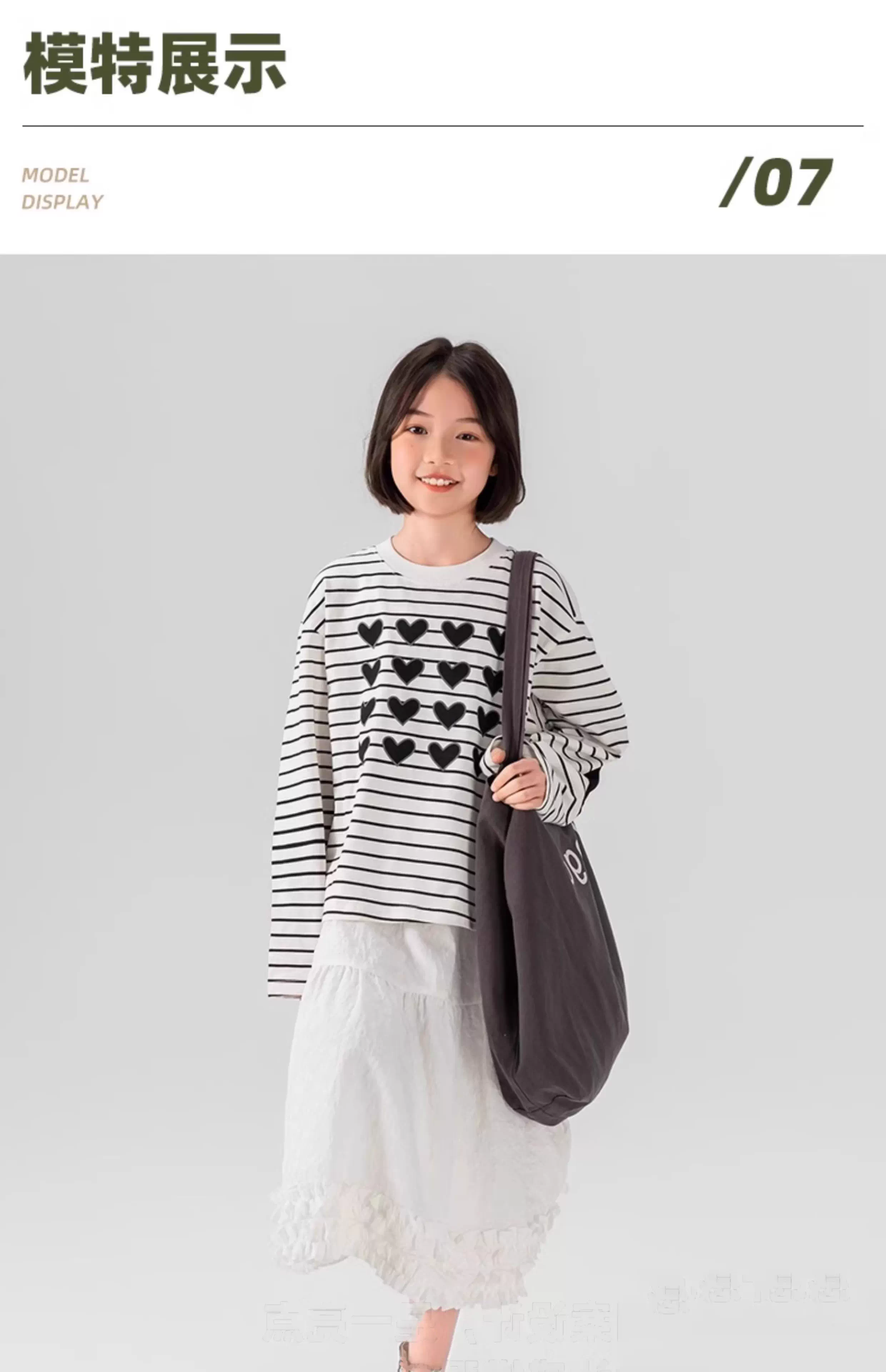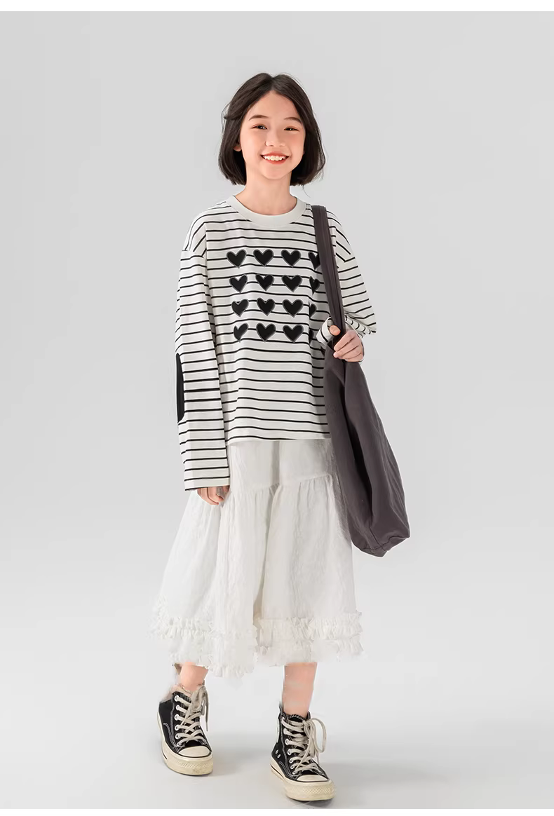 Áo thun dài tay in sọc cho bé gái lớn hơn, bộ sưu tập Xuân 25, kiểu dáng đa năng, phối màu chữ trái tim