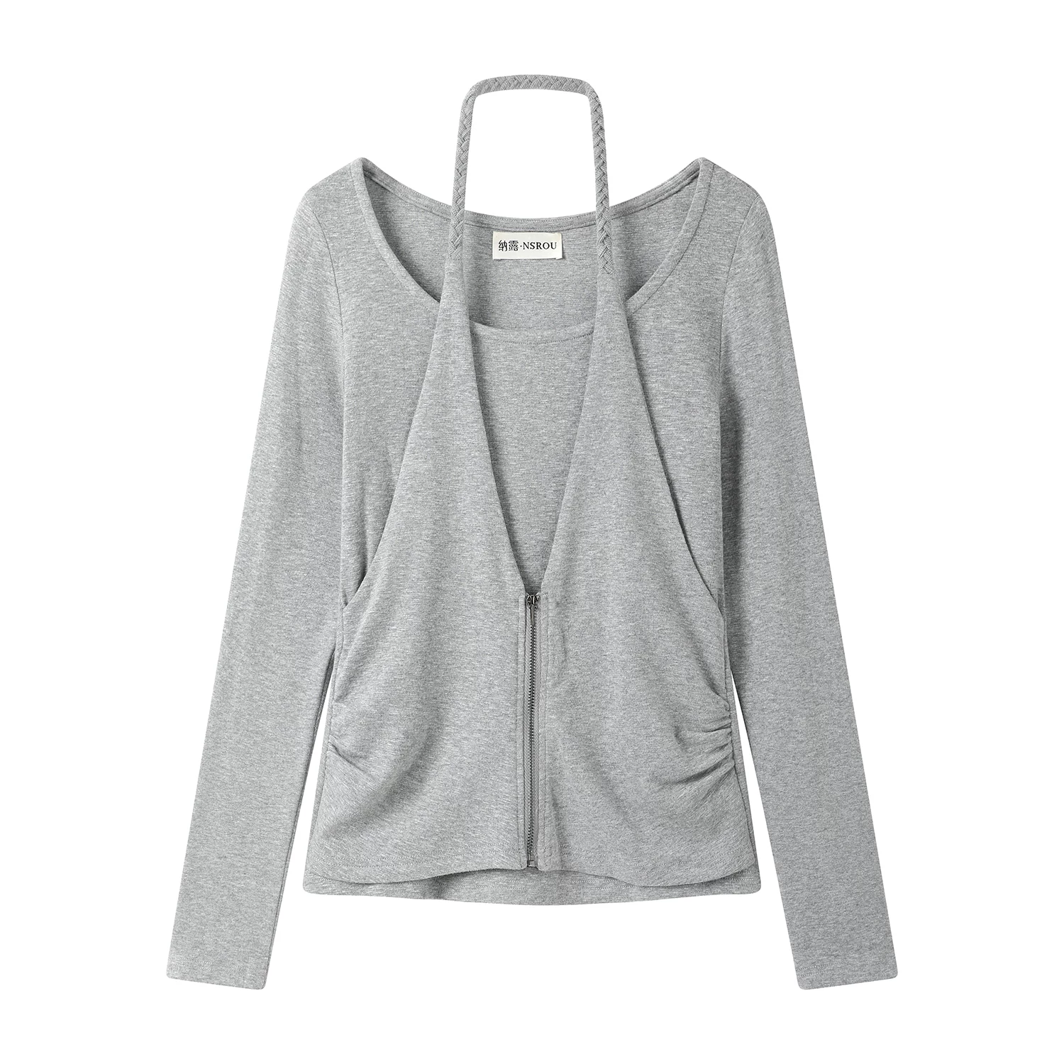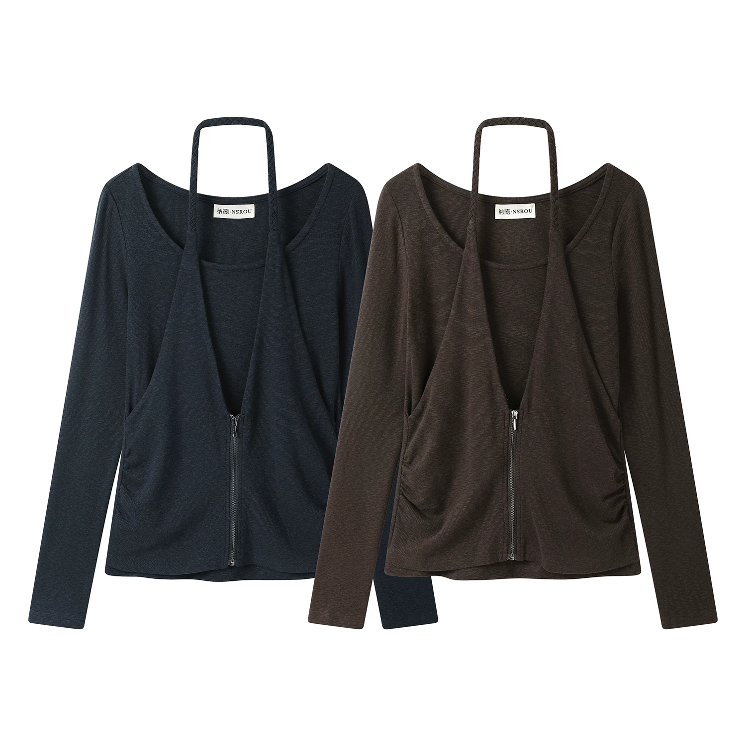- Áo thun dệt kim cổ yếm giả hai mảnh phối màu phong cách mới đầu thu dành cho nữ, áo dài tay ôm dáng đa năng cổ điển