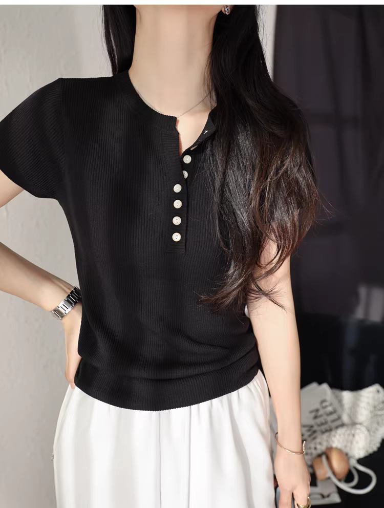 - Áo thun dệt kim ôm sát, chất liệu linen lyocell, thoáng mát, kiểu dáng đơn giản, nửa khóa kéo, chất liệu gân, dành cho nữ, mẫu mới mùa hè