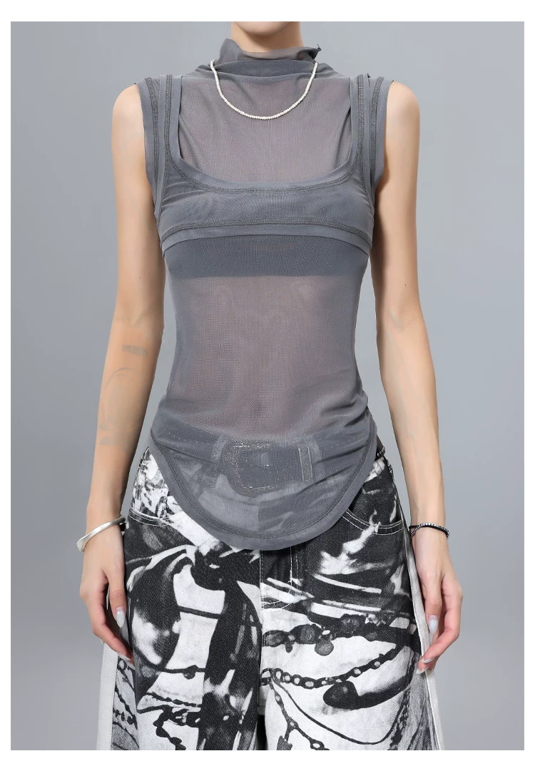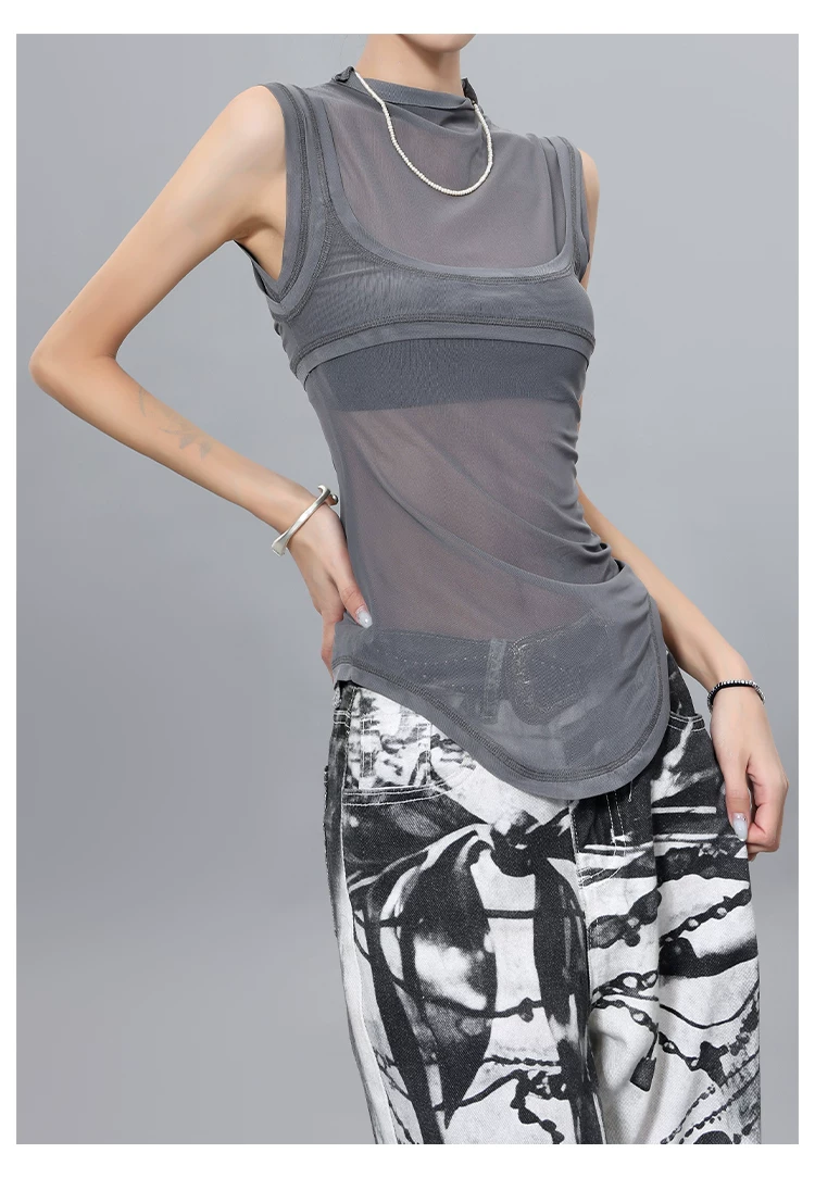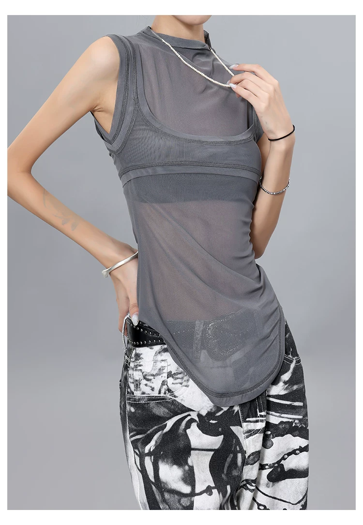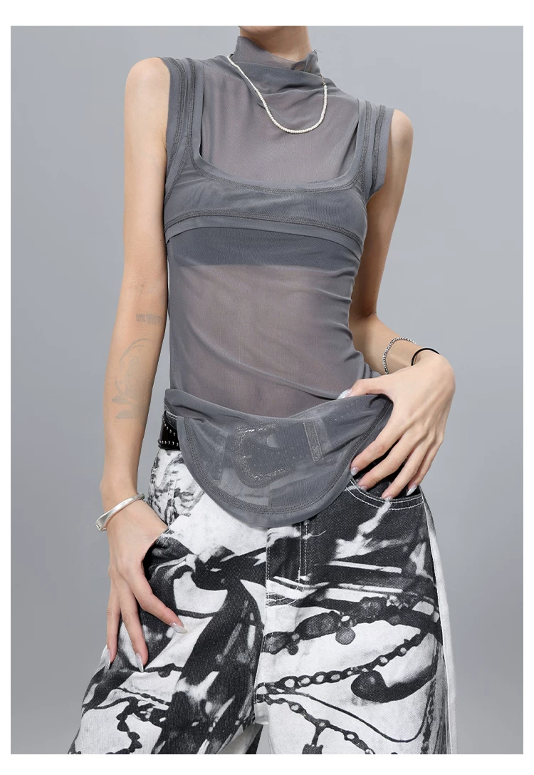 Áo thun hai mảnh giả hai mảnh kiểu lưới phong cách KEN STUDIO dành cho nữ, áo thun dáng ôm đa năng mùa hè mới