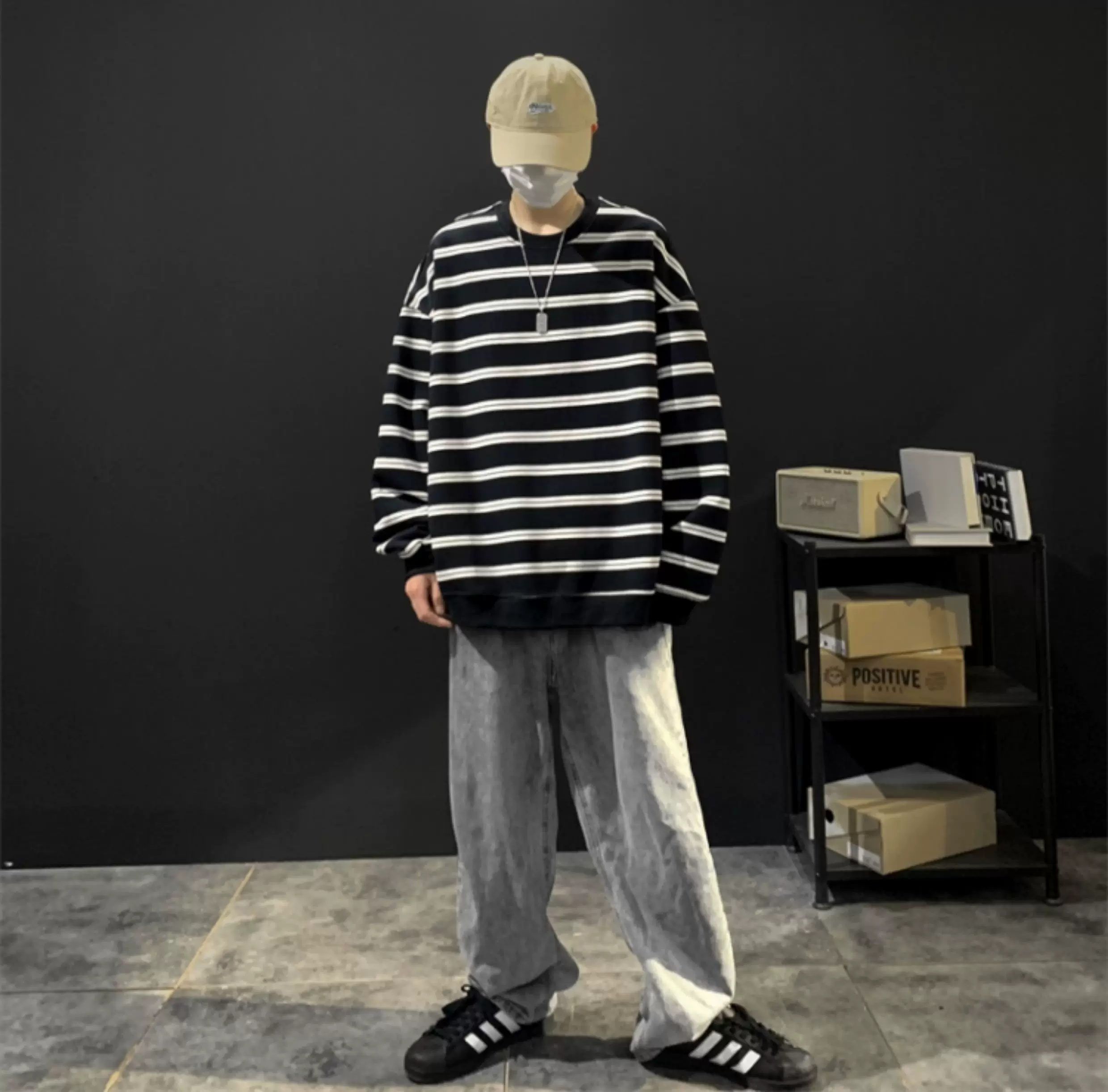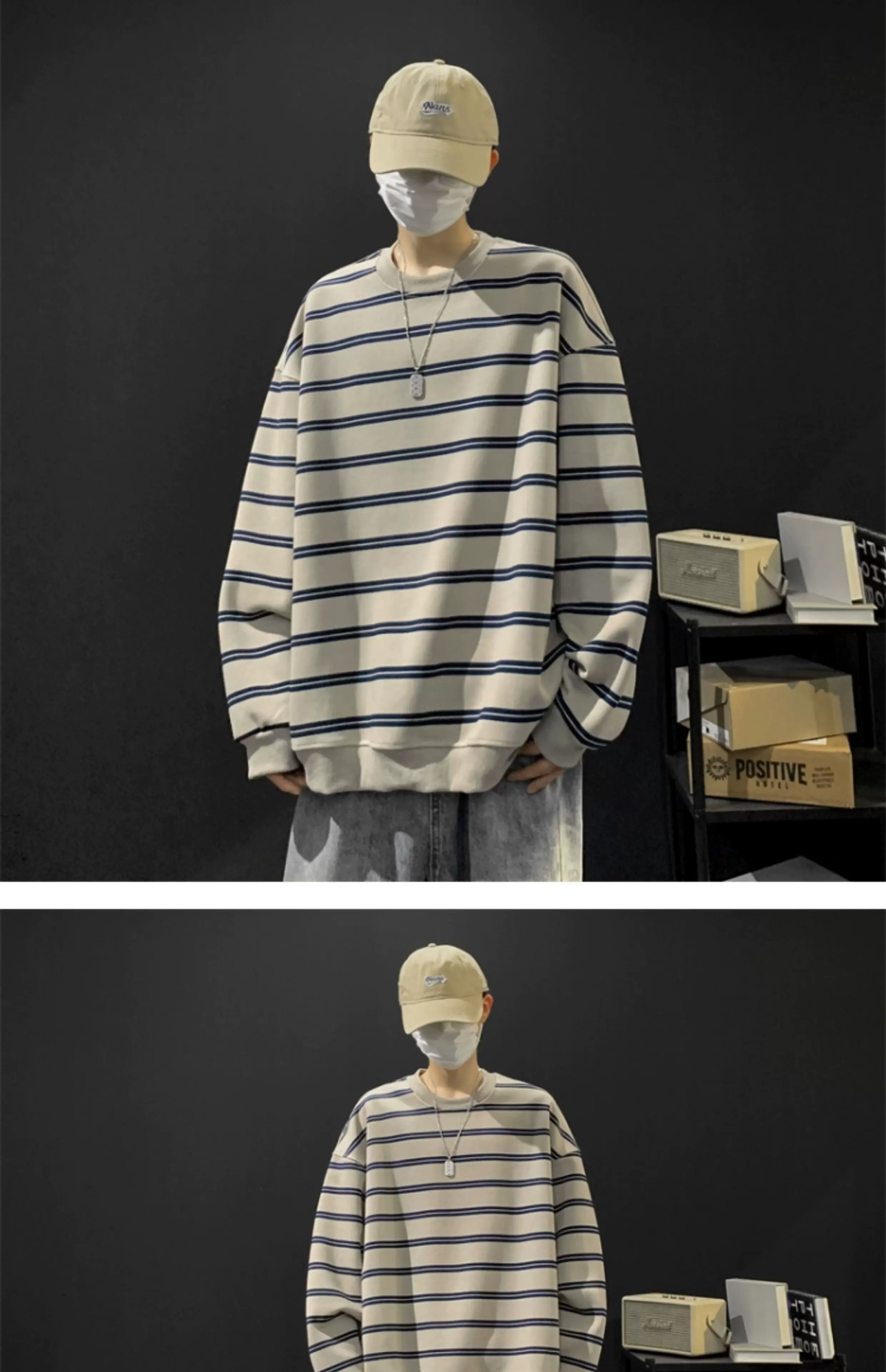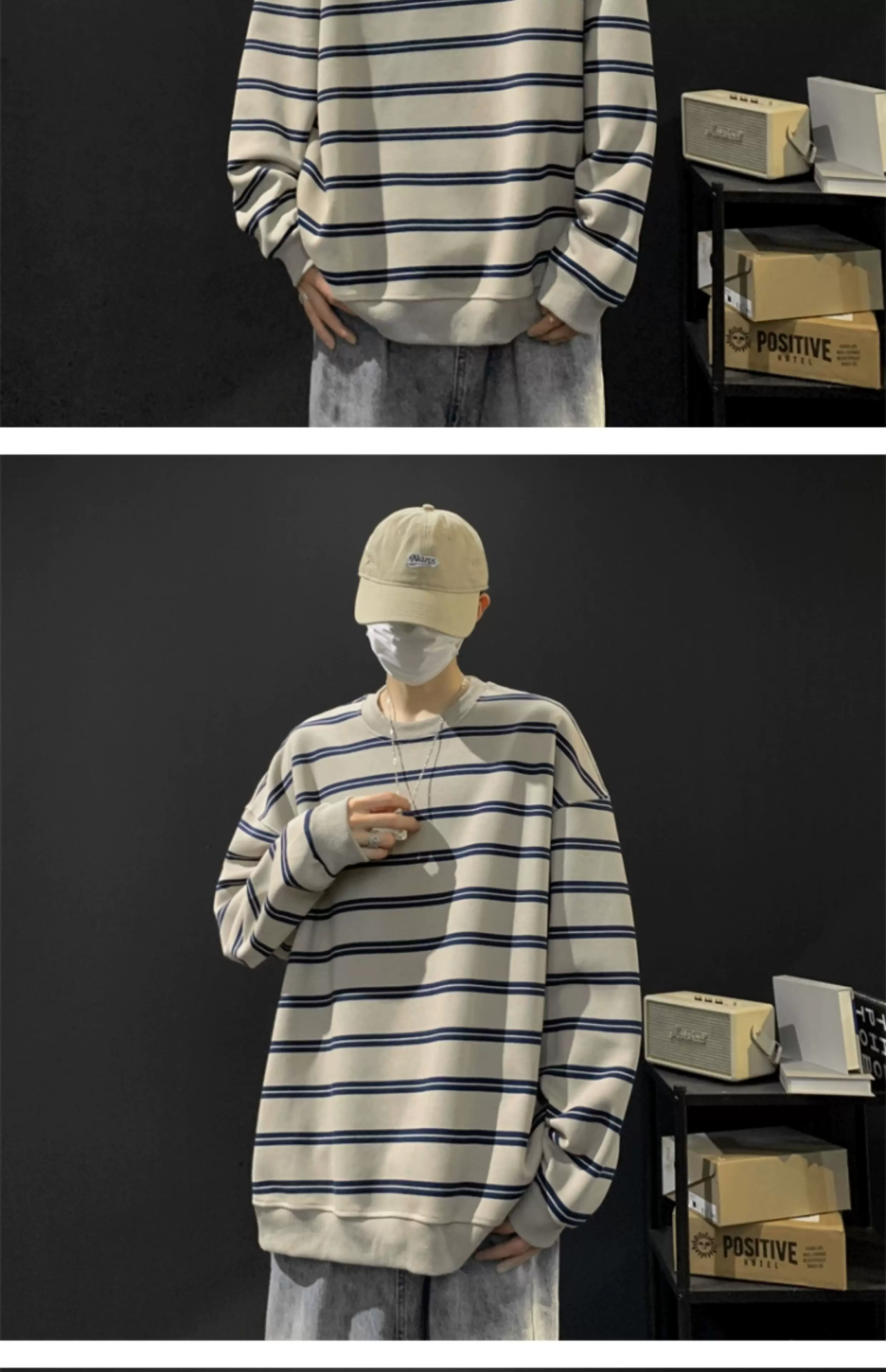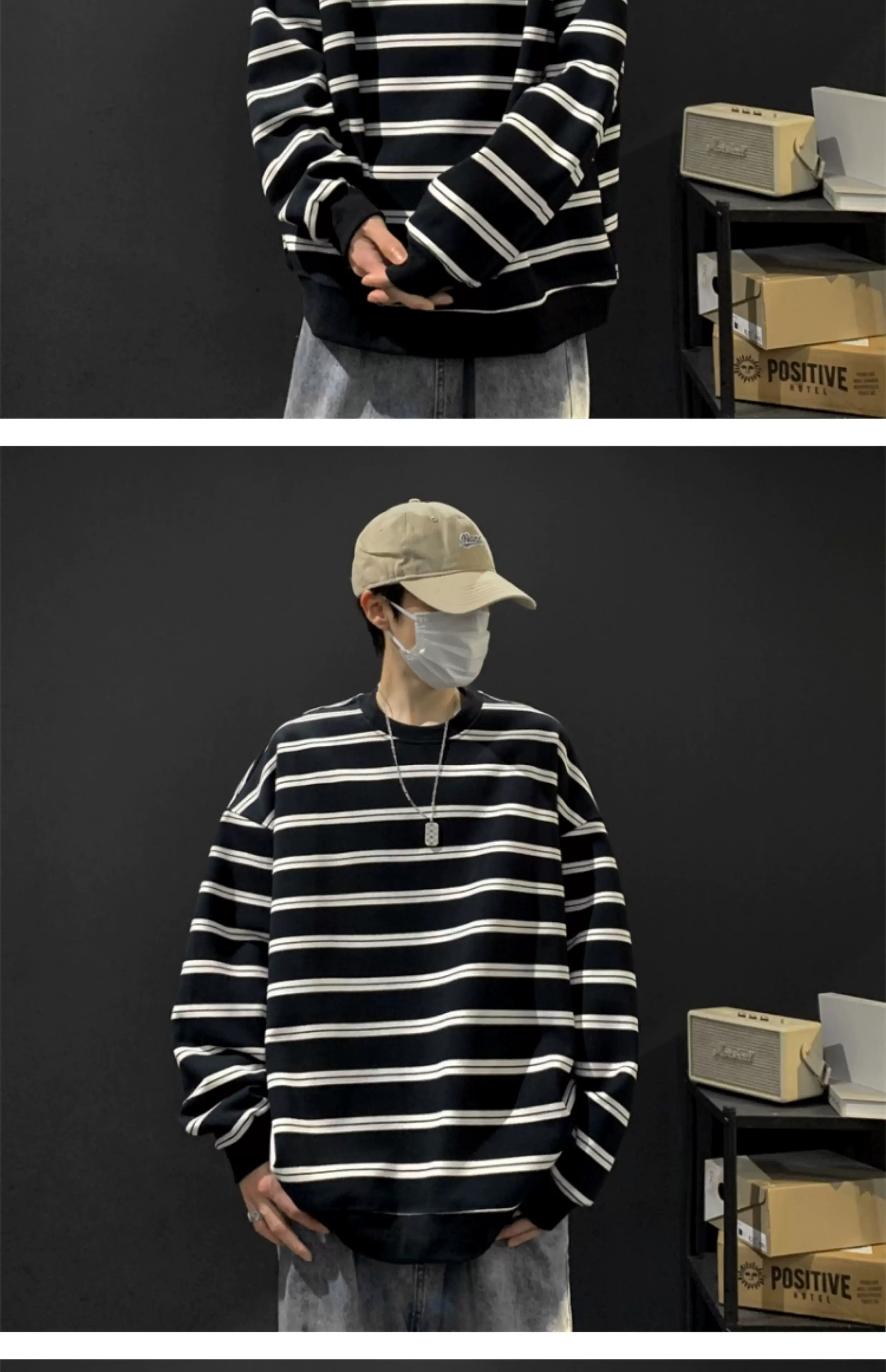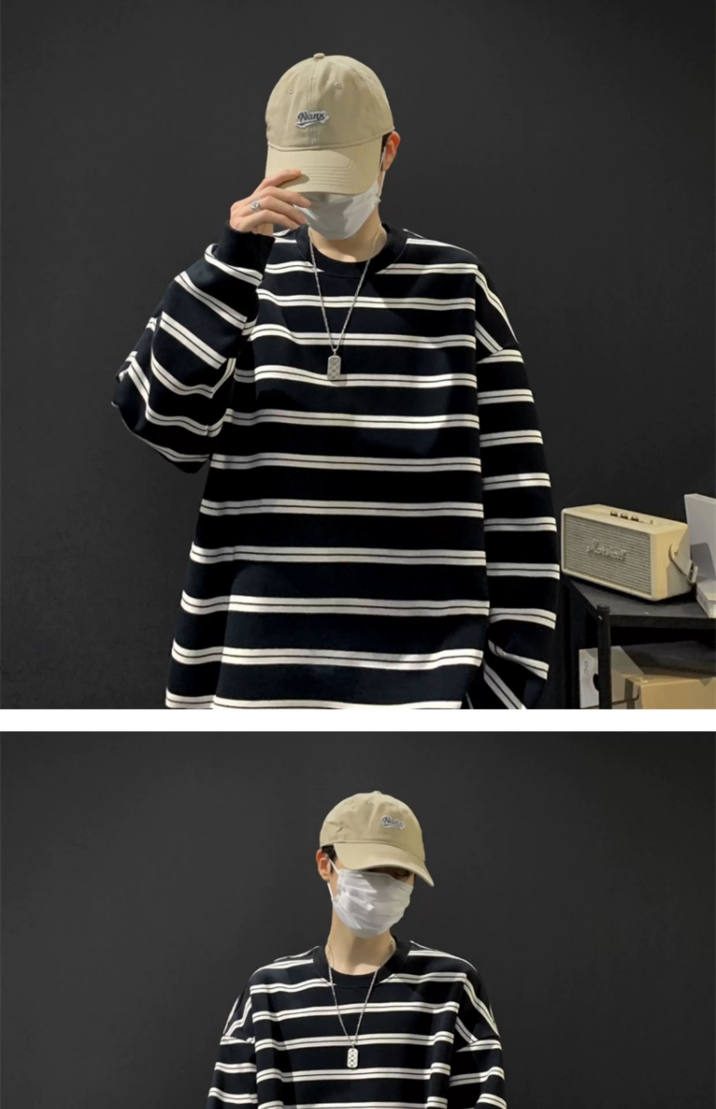 - Áo thun kẻ sọc dày dặn dành cho nam, kiểu dáng rộng rãi thời trang xuân thu, chất liệu cotton nguyên chất, áo thun tay dài phong cách Mỹ cổ điển dành cho cặp đôi.