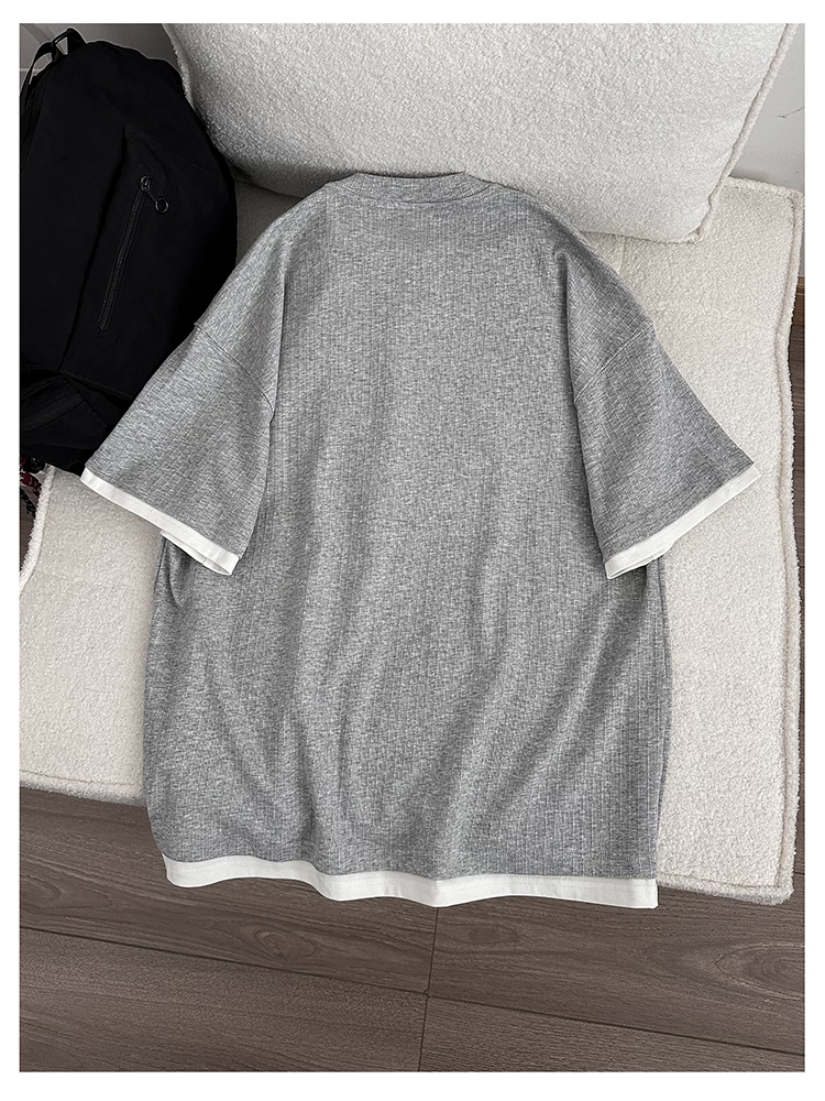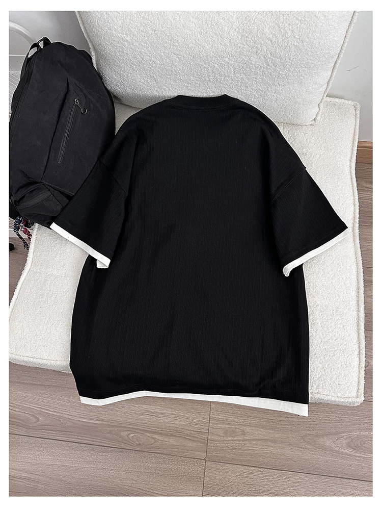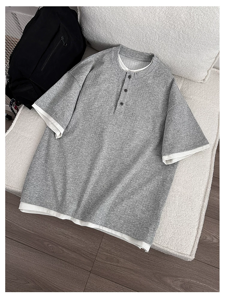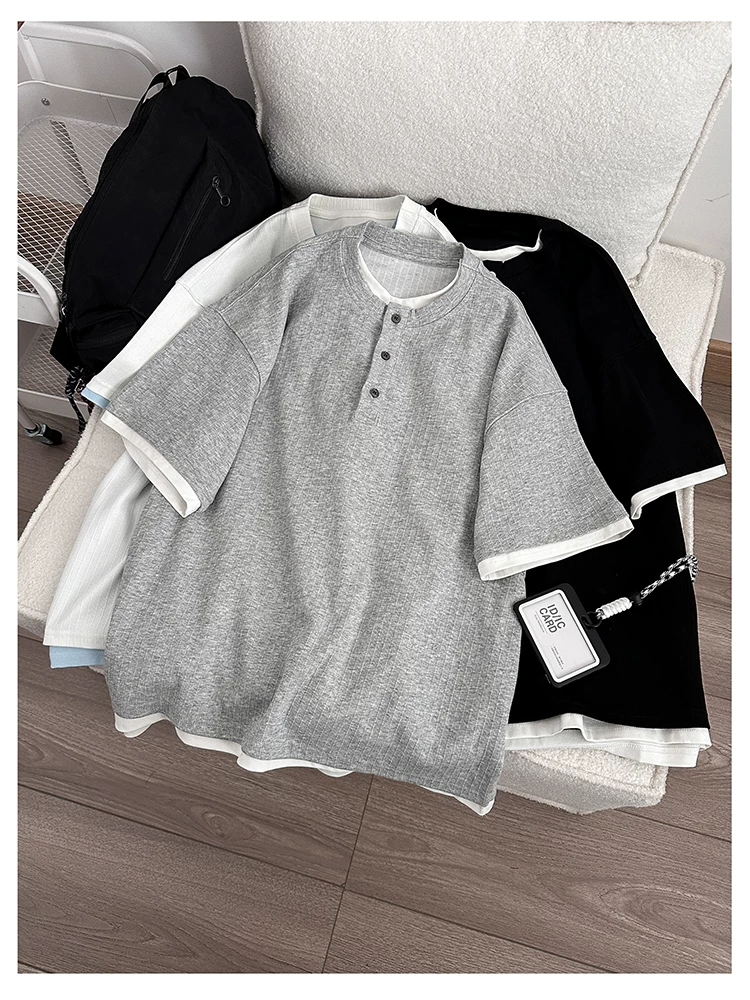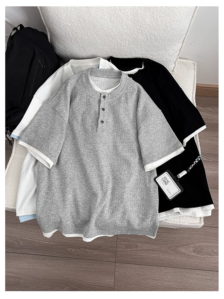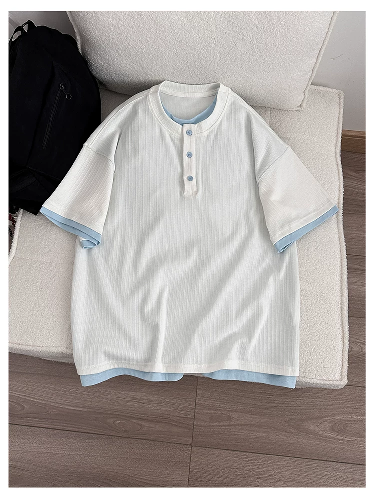 Áo thun nam cổ Henry kiểu Mỹ, áo thun tay ngắn phối màu hai mảnh mùa hè, áo kiểu rộng rãi thời trang.