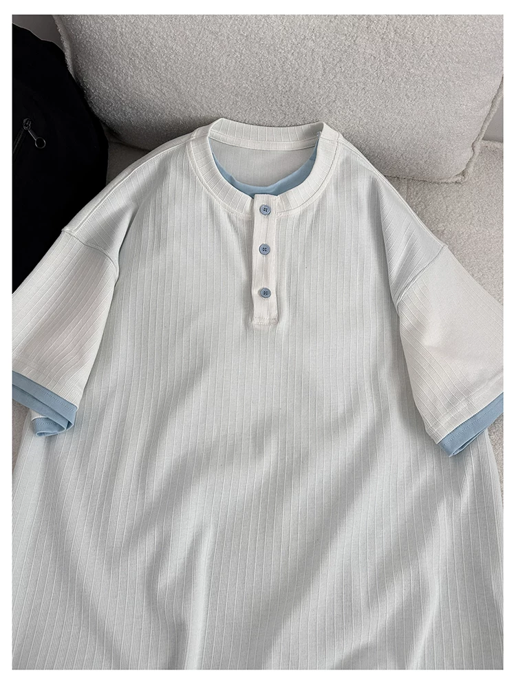 - Áo thun nam cổ Henry kiểu Mỹ, áo thun tay ngắn phối màu hai mảnh mùa hè, áo kiểu rộng rãi thời trang.