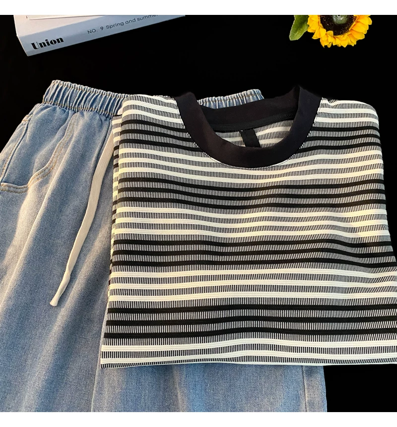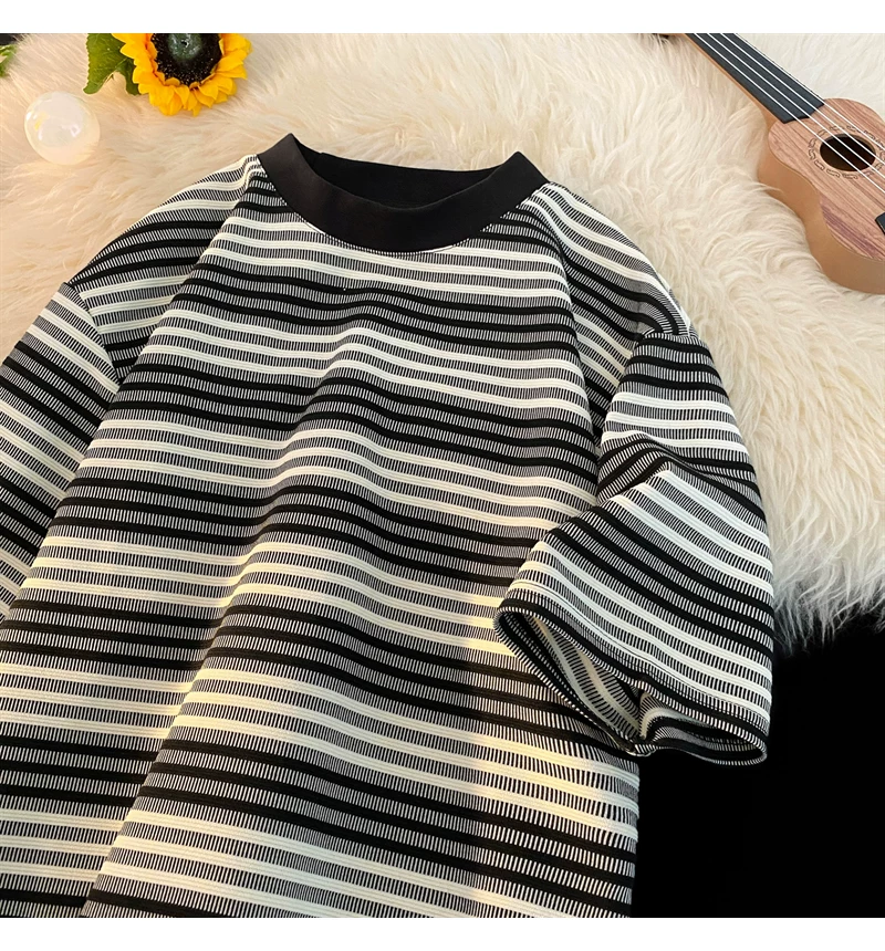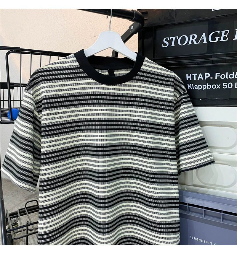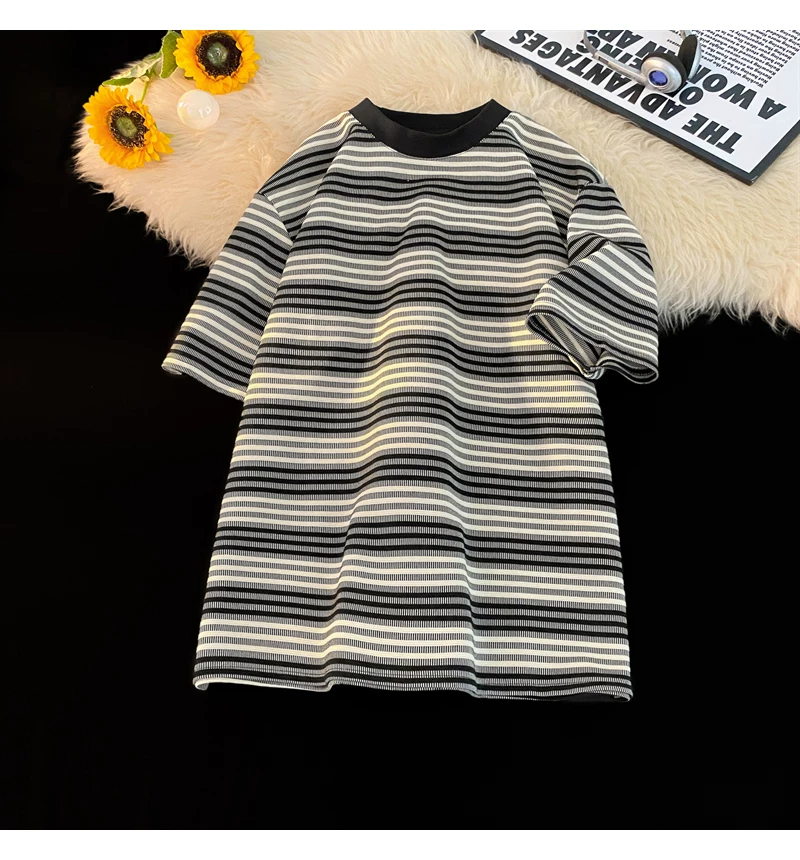 Áo thun nam sọc phối màu, tay ngắn, dáng rộng, chất liệu cotton dày dặn, phong cách retro Mỹ thời thượng mùa hè.