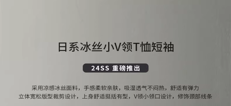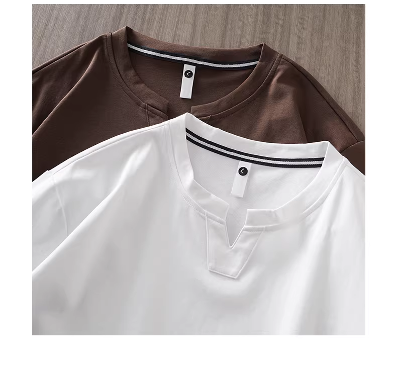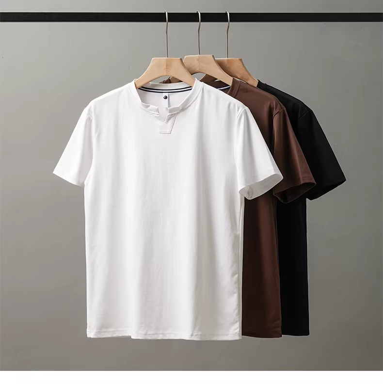 Áo thun nam tay ngắn cổ V chất liệu lụa đá mát mẻ, thiết kế độc đáo mùa hè 2024, màu trắng tinh khiết, kiểu nửa tay.