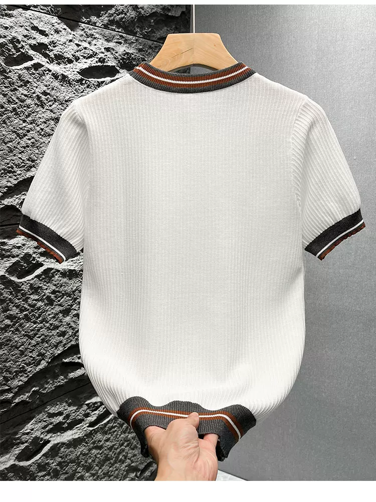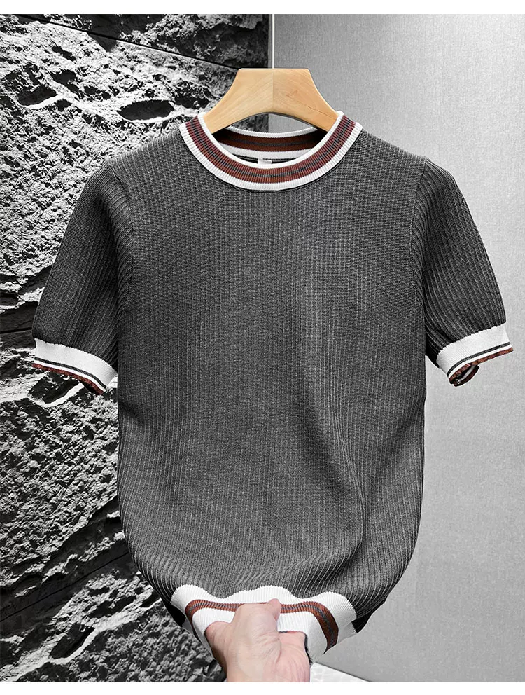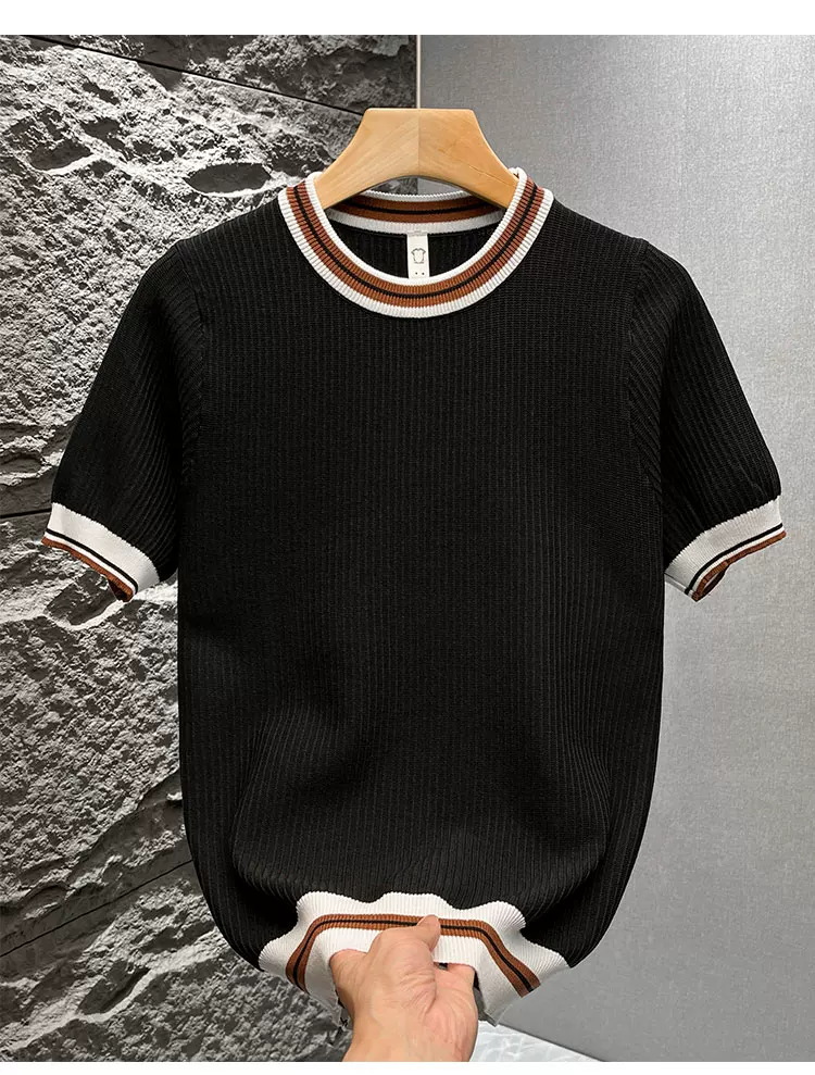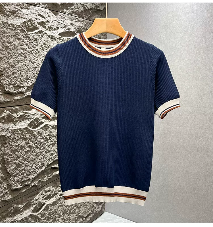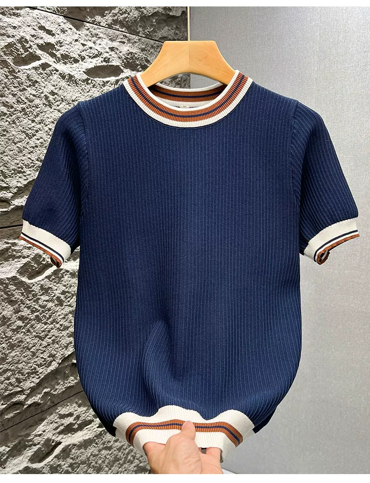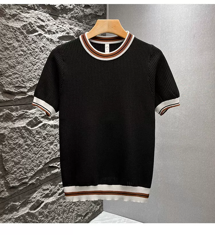 Áo thun nam tay ngắn dệt kim phối màu kiểu Mỹ, áo thun mùa hè mới chất liệu lụa băng thoáng khí, cảm giác cao cấp, kiểu dáng rộng rãi.