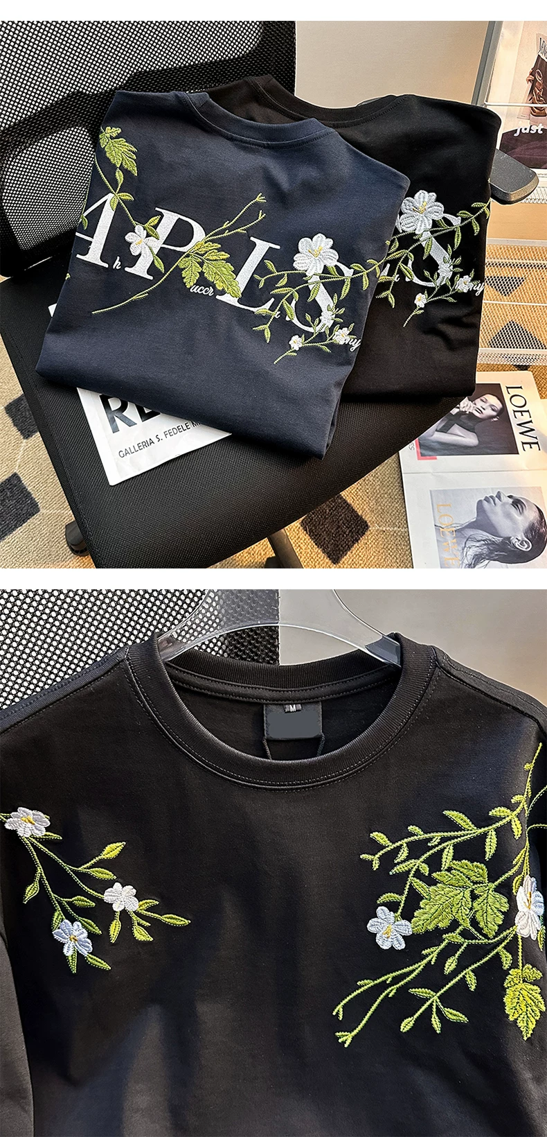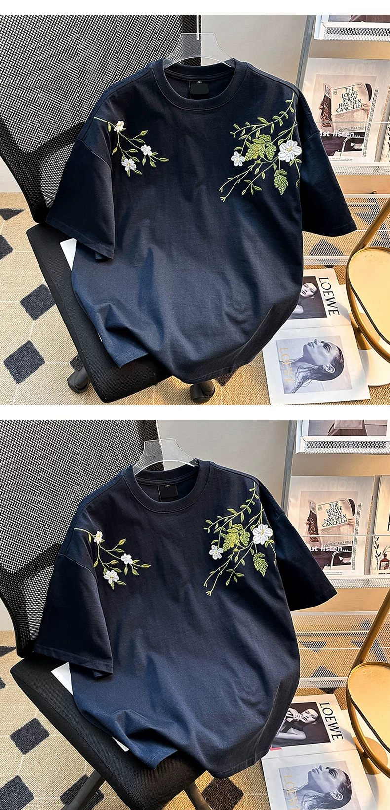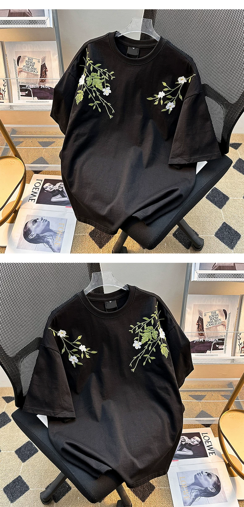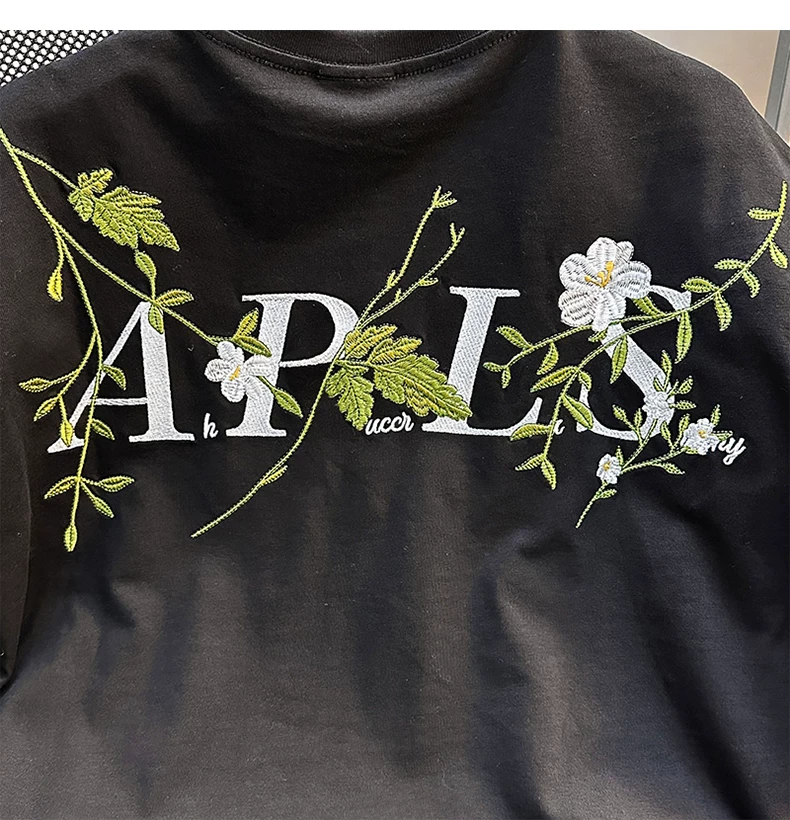 - Áo thun nam tay ngắn họa tiết hoa, kiểu Mỹ thời trang, dáng rộng, cặp đôi, mùa hè 2025, áo thun thêu mới