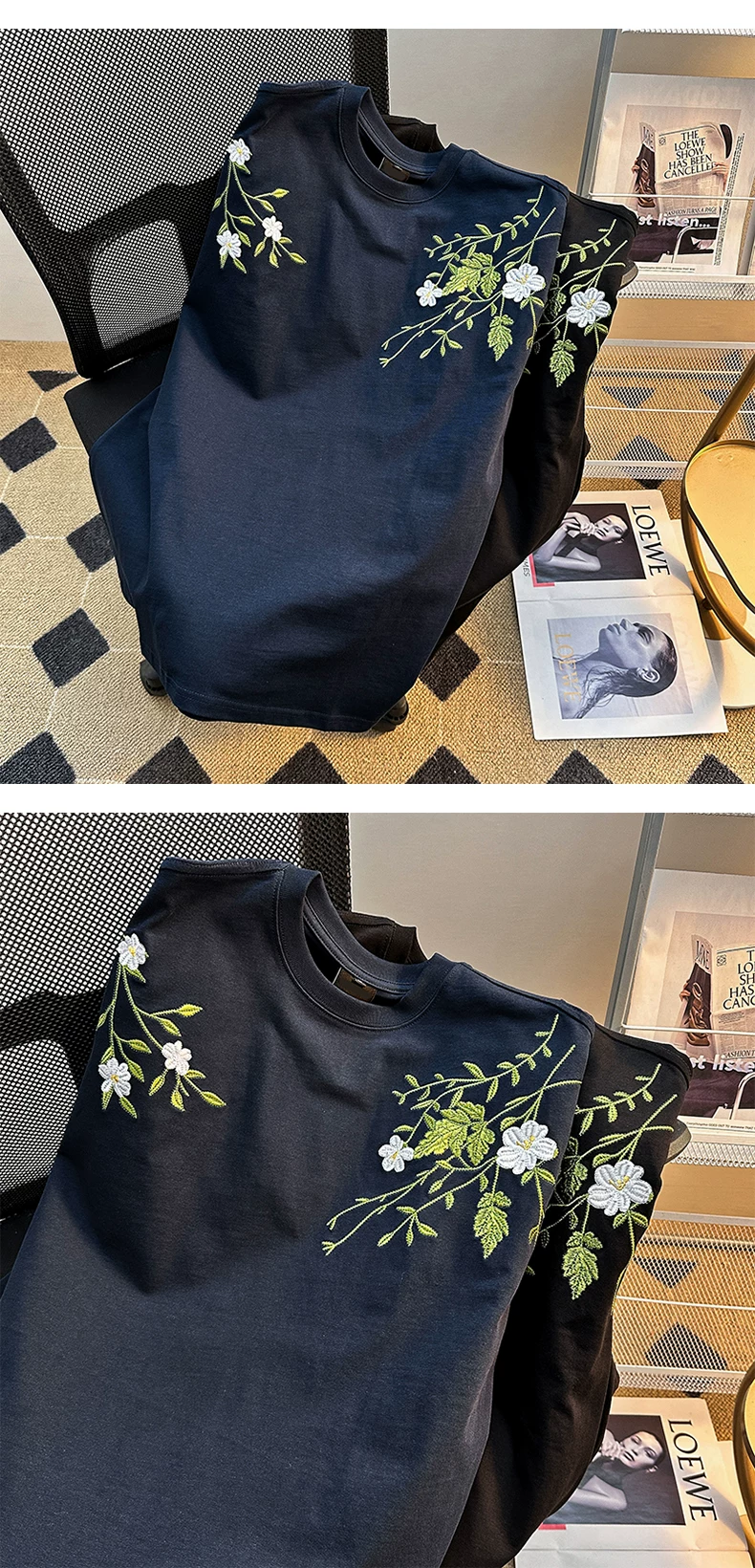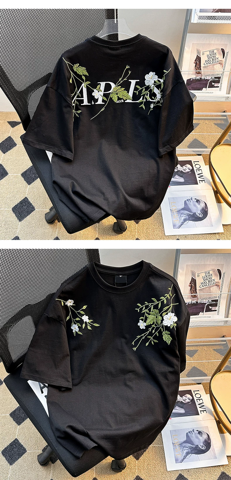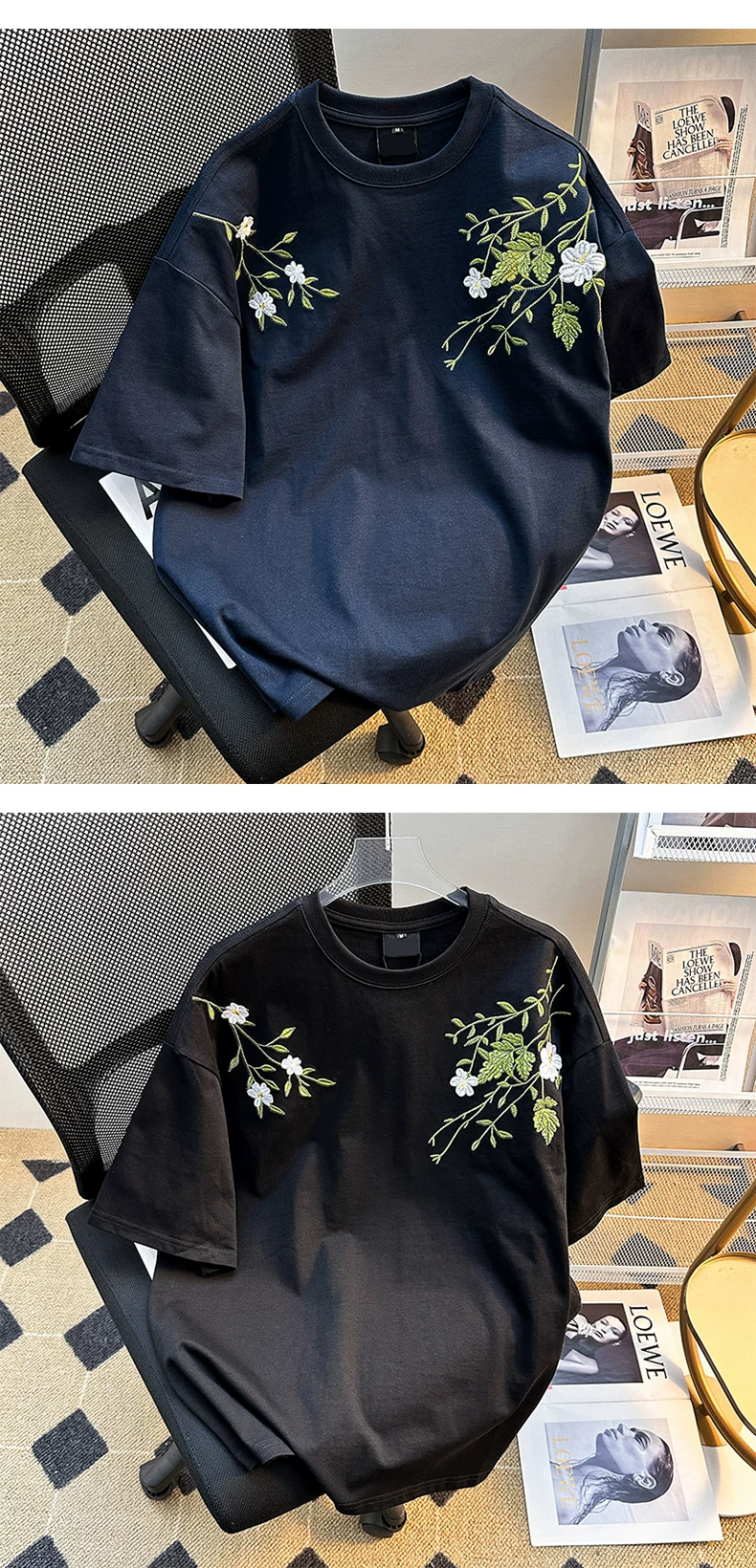 - Áo thun nam tay ngắn họa tiết hoa, kiểu Mỹ thời trang, dáng rộng, cặp đôi, mùa hè 2025, áo thun thêu mới
