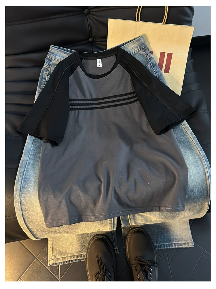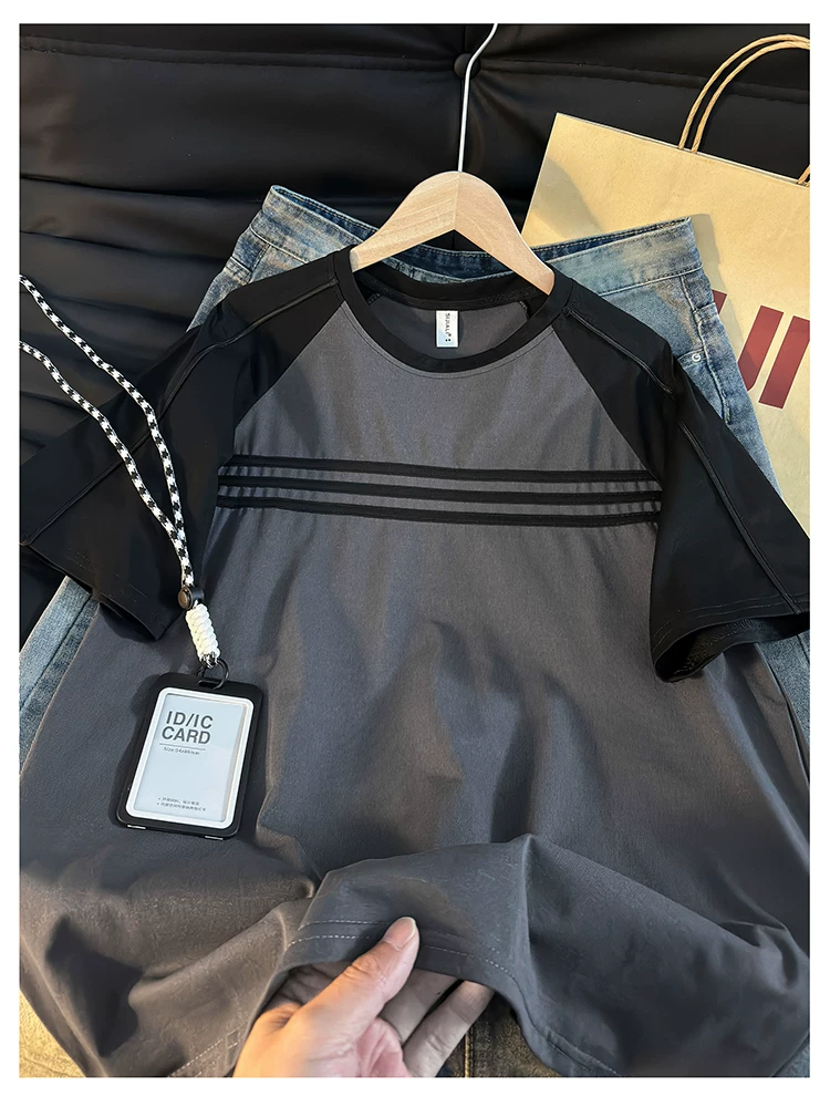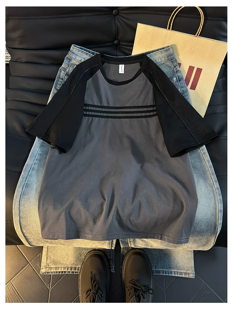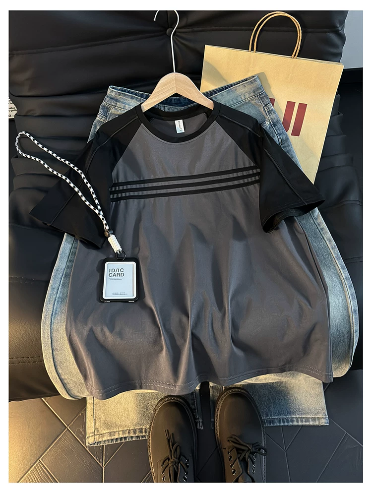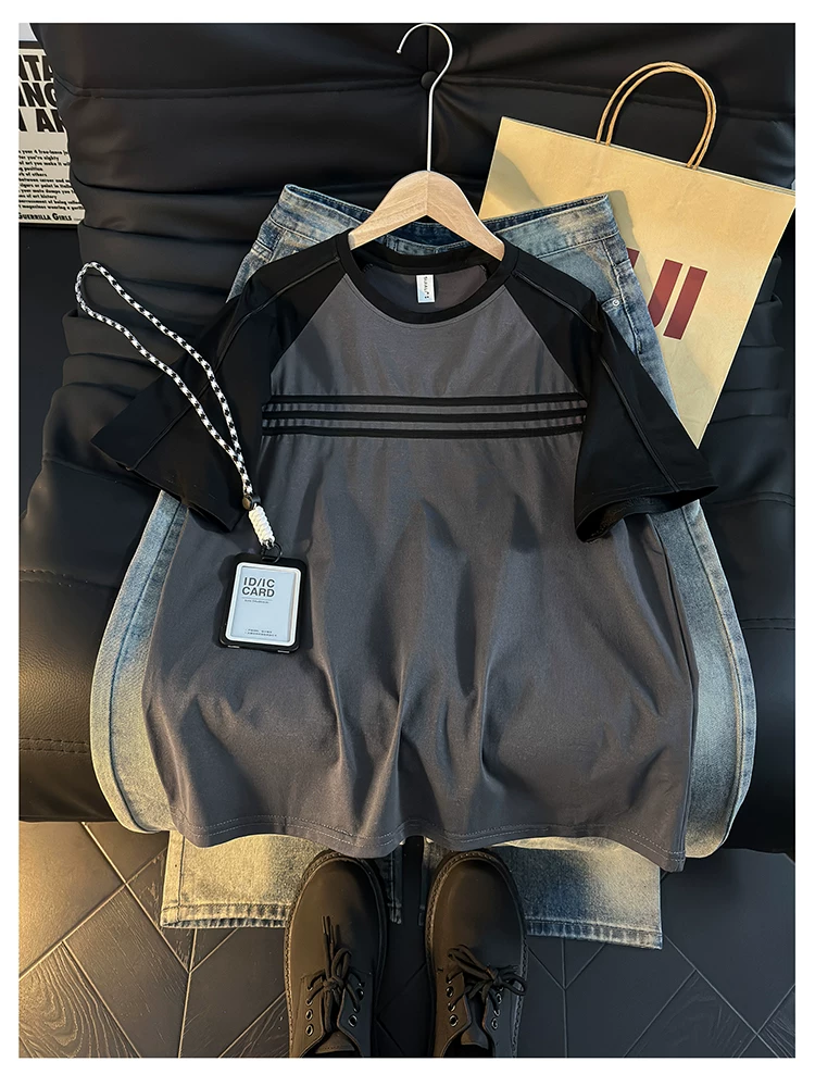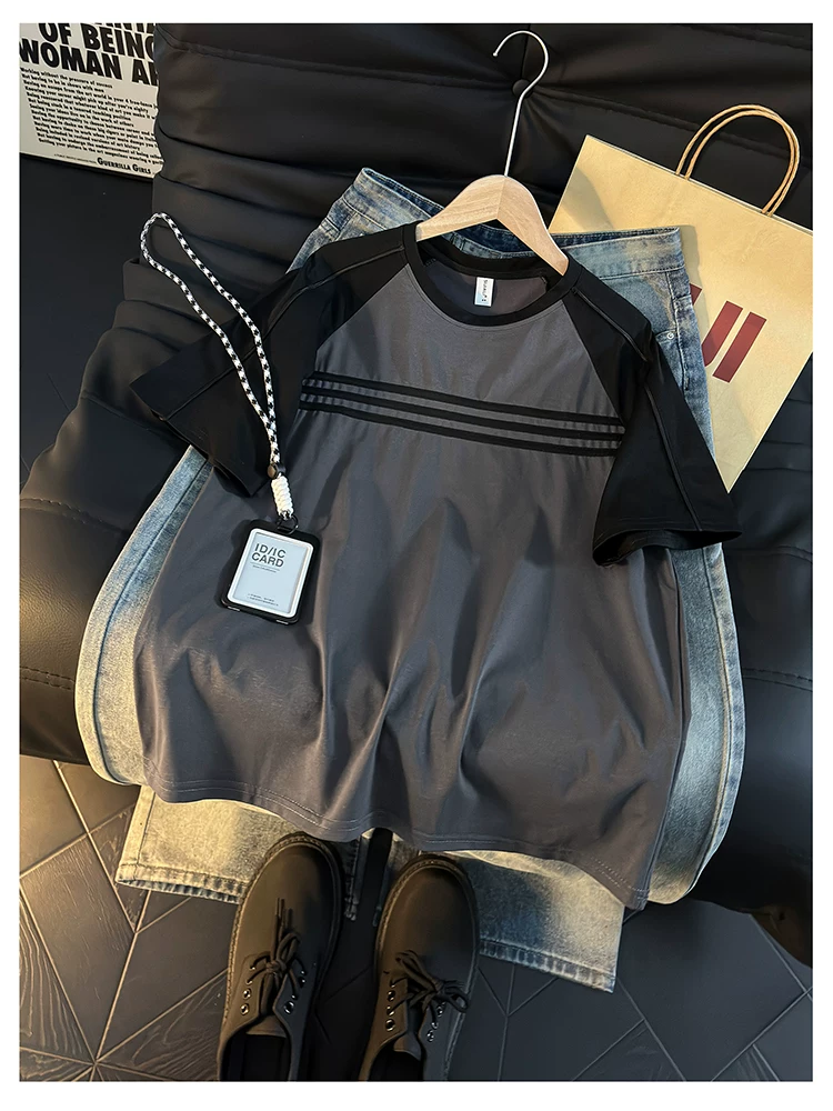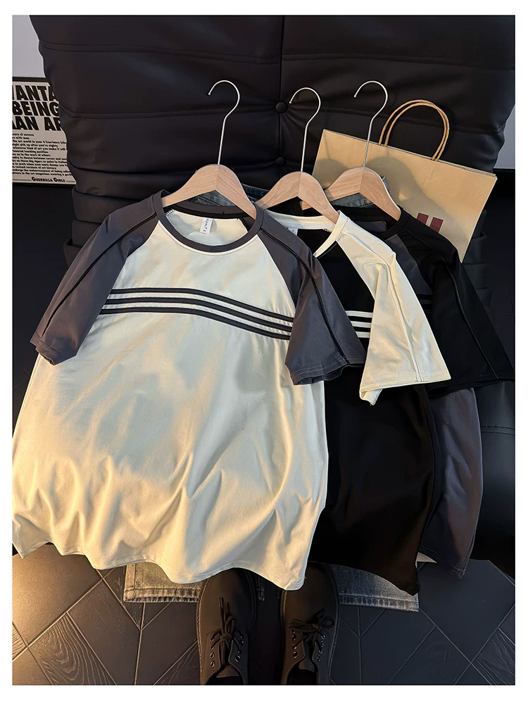 Áo thun nam tay ngắn phối màu sọc đơn giản, kiểu dáng thời trang mùa hè, form rộng, phong cách retro Mỹ.