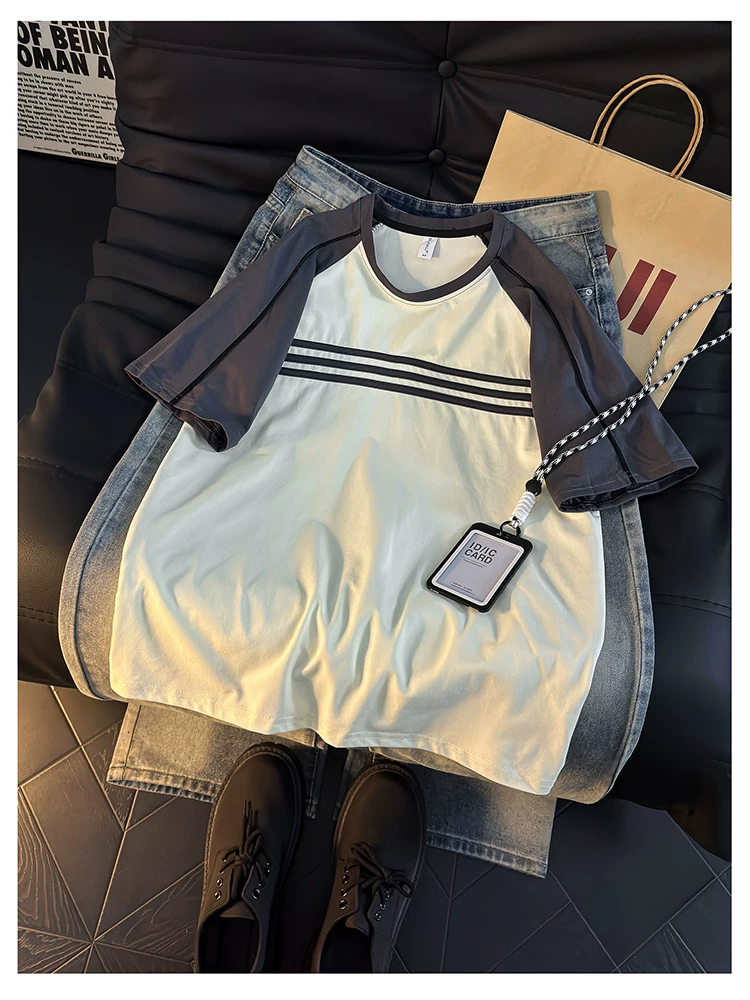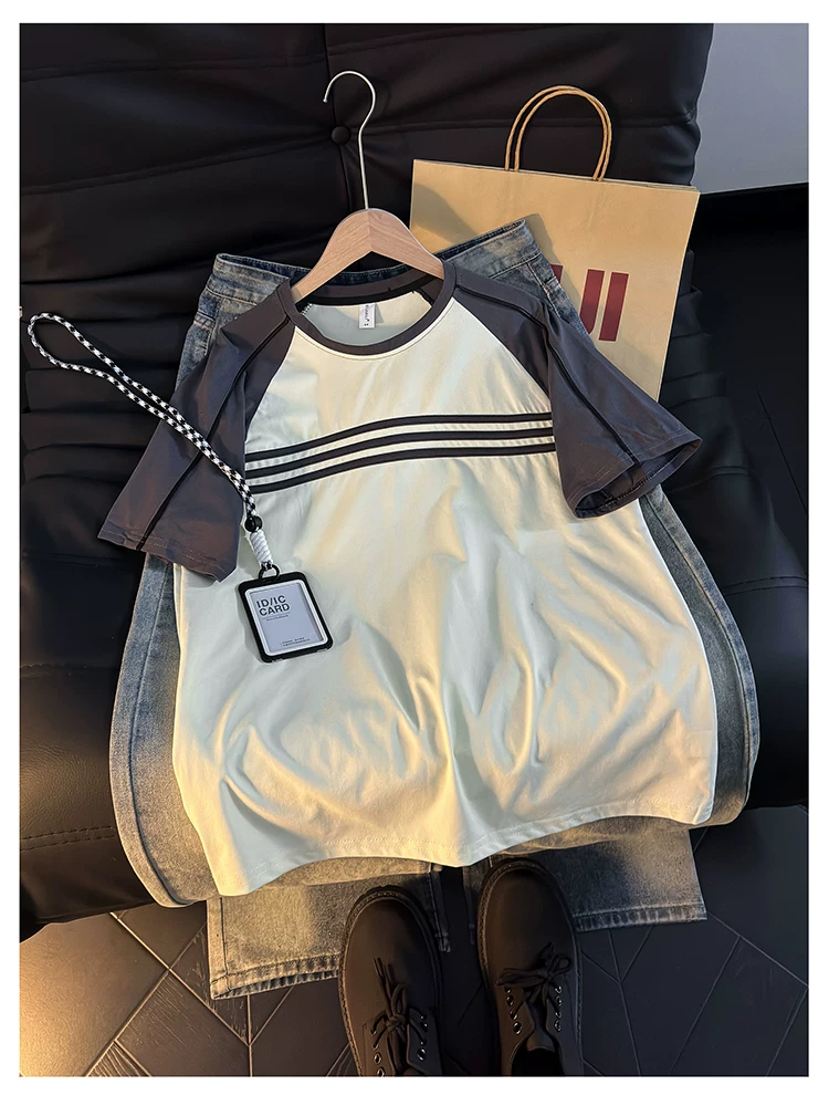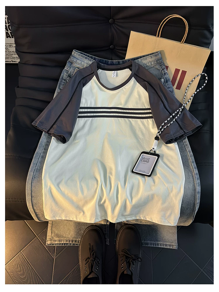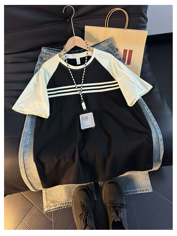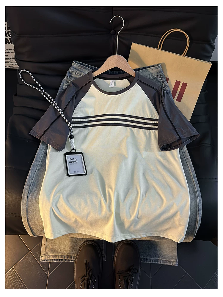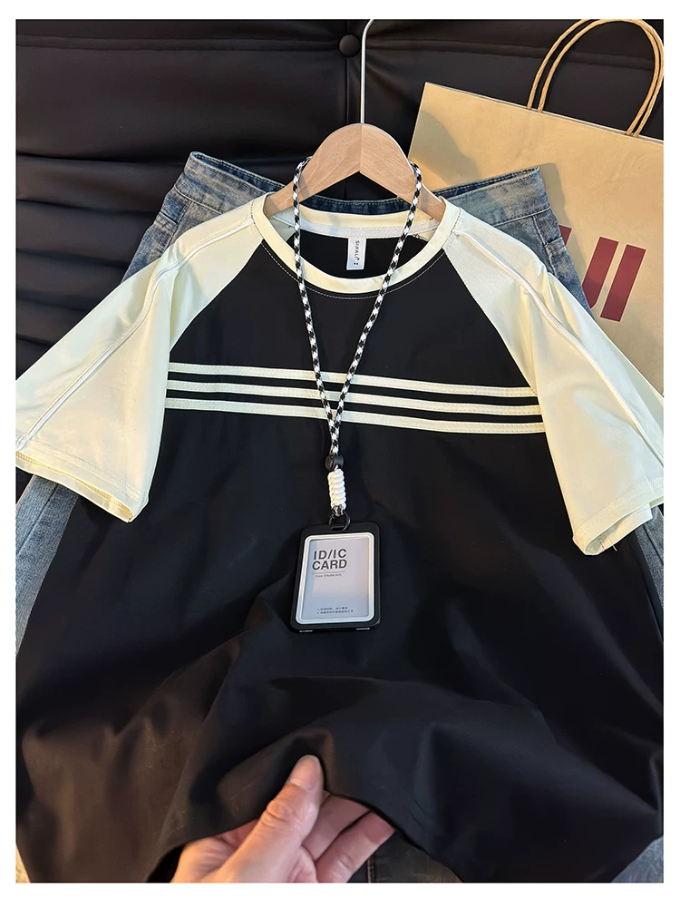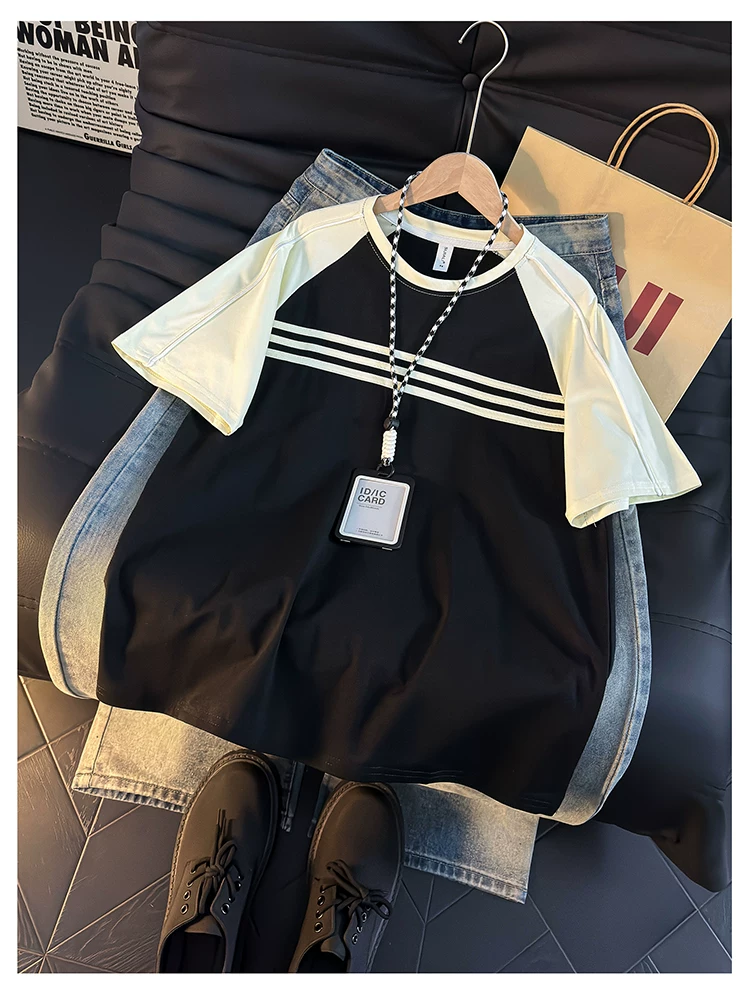 - Áo thun nam tay ngắn phối màu sọc đơn giản, kiểu dáng thời trang mùa hè, form rộng, phong cách retro Mỹ.