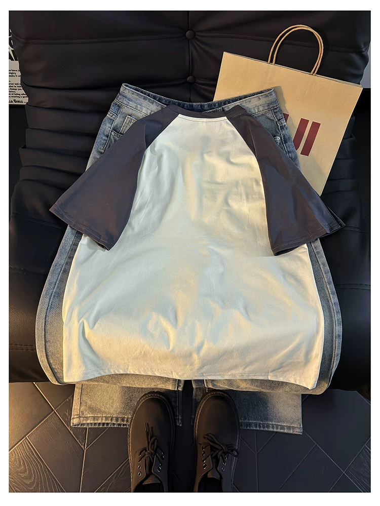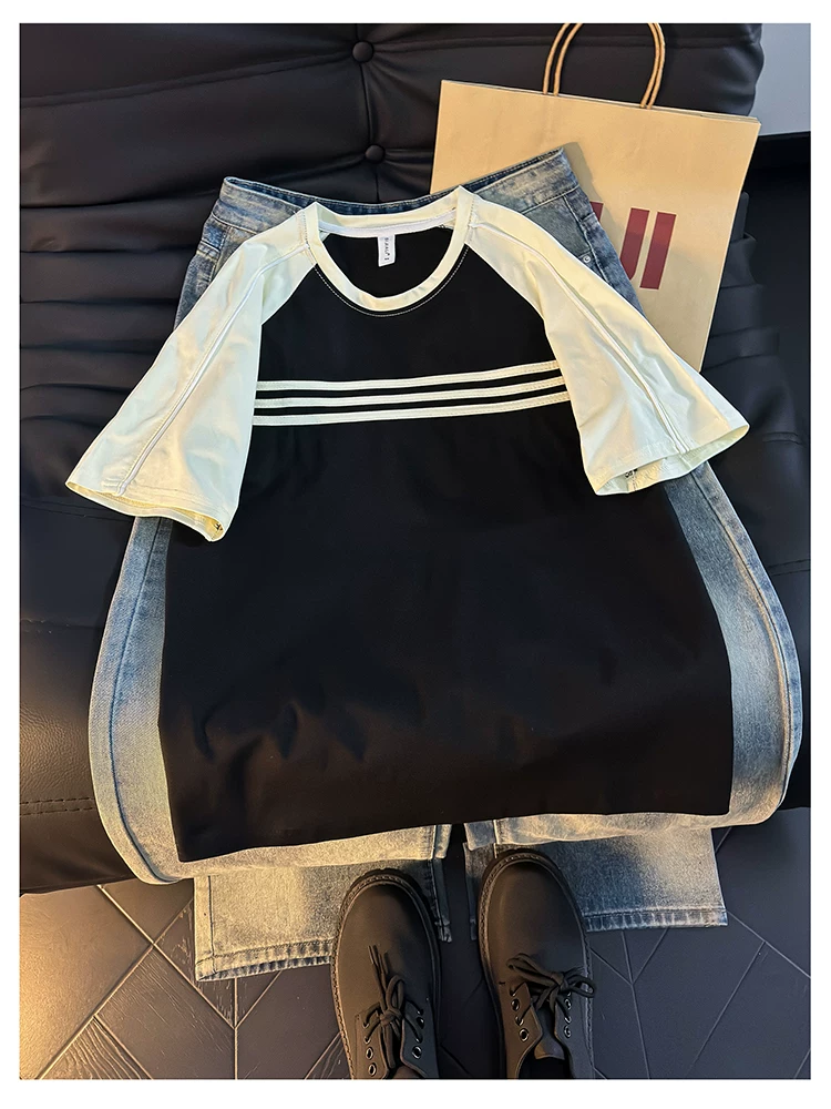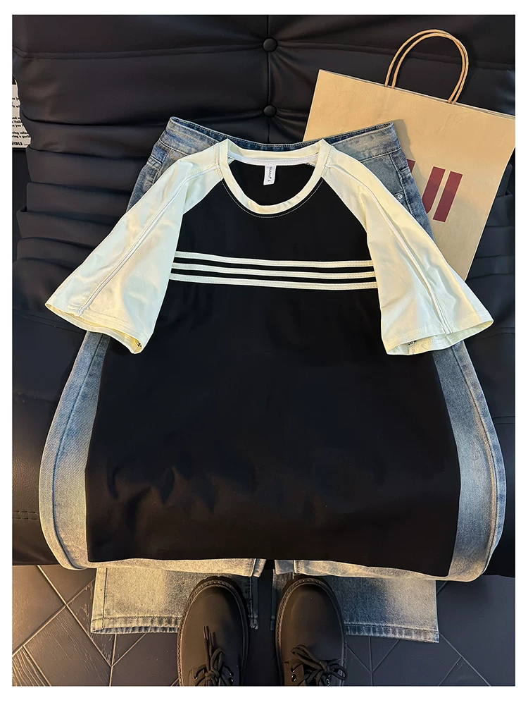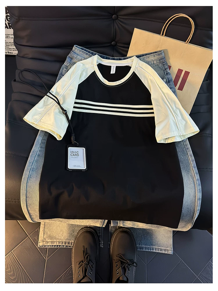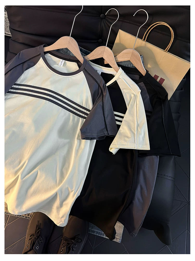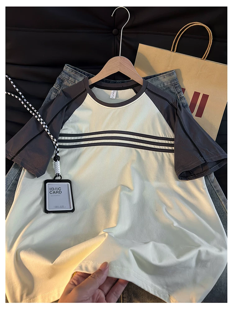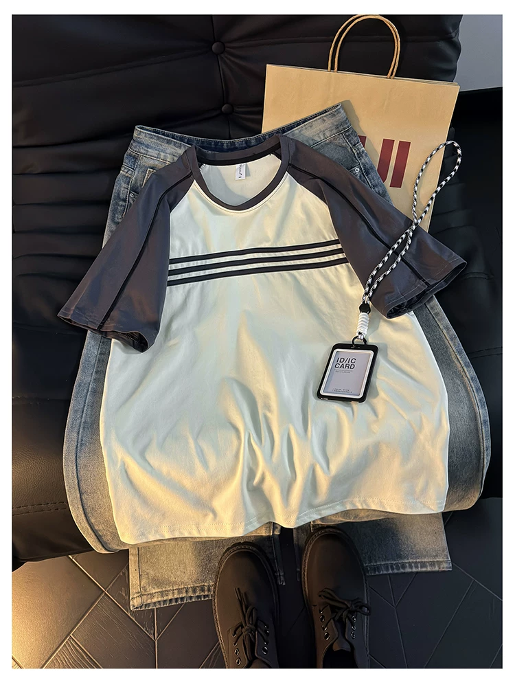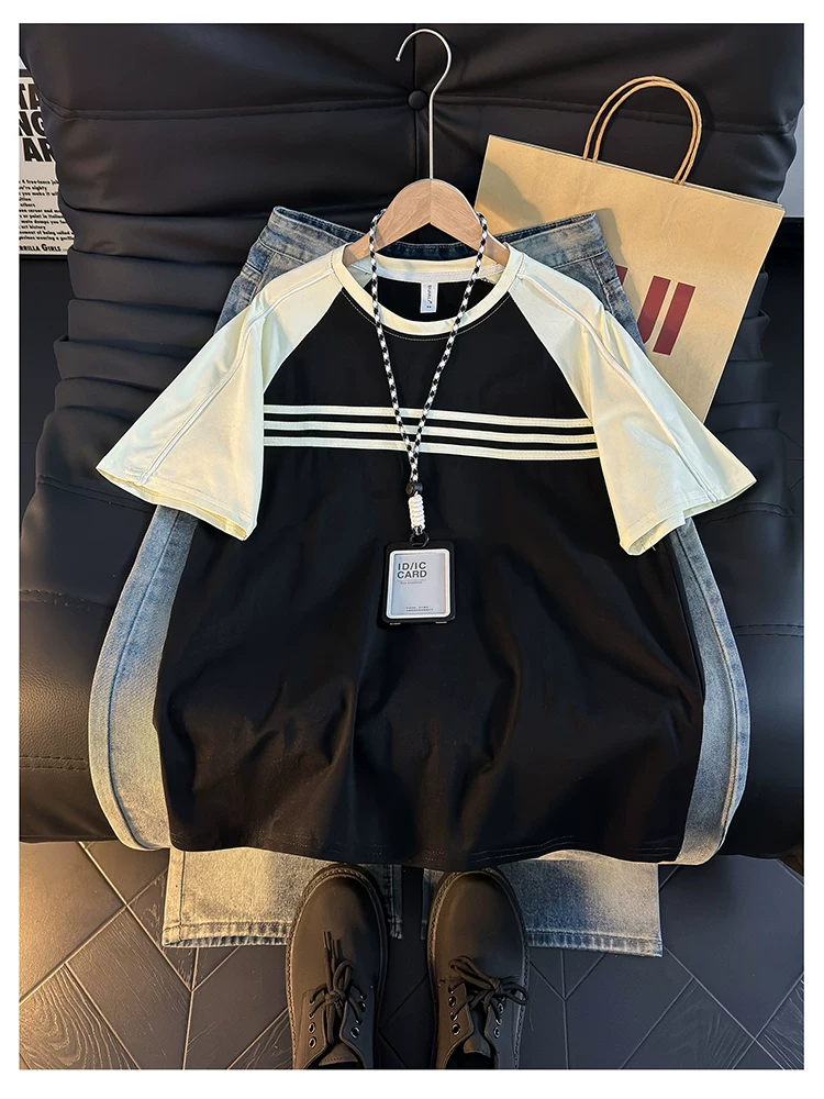 - Áo thun nam tay ngắn phối màu sọc đơn giản, kiểu dáng thời trang mùa hè, form rộng, phong cách retro Mỹ.