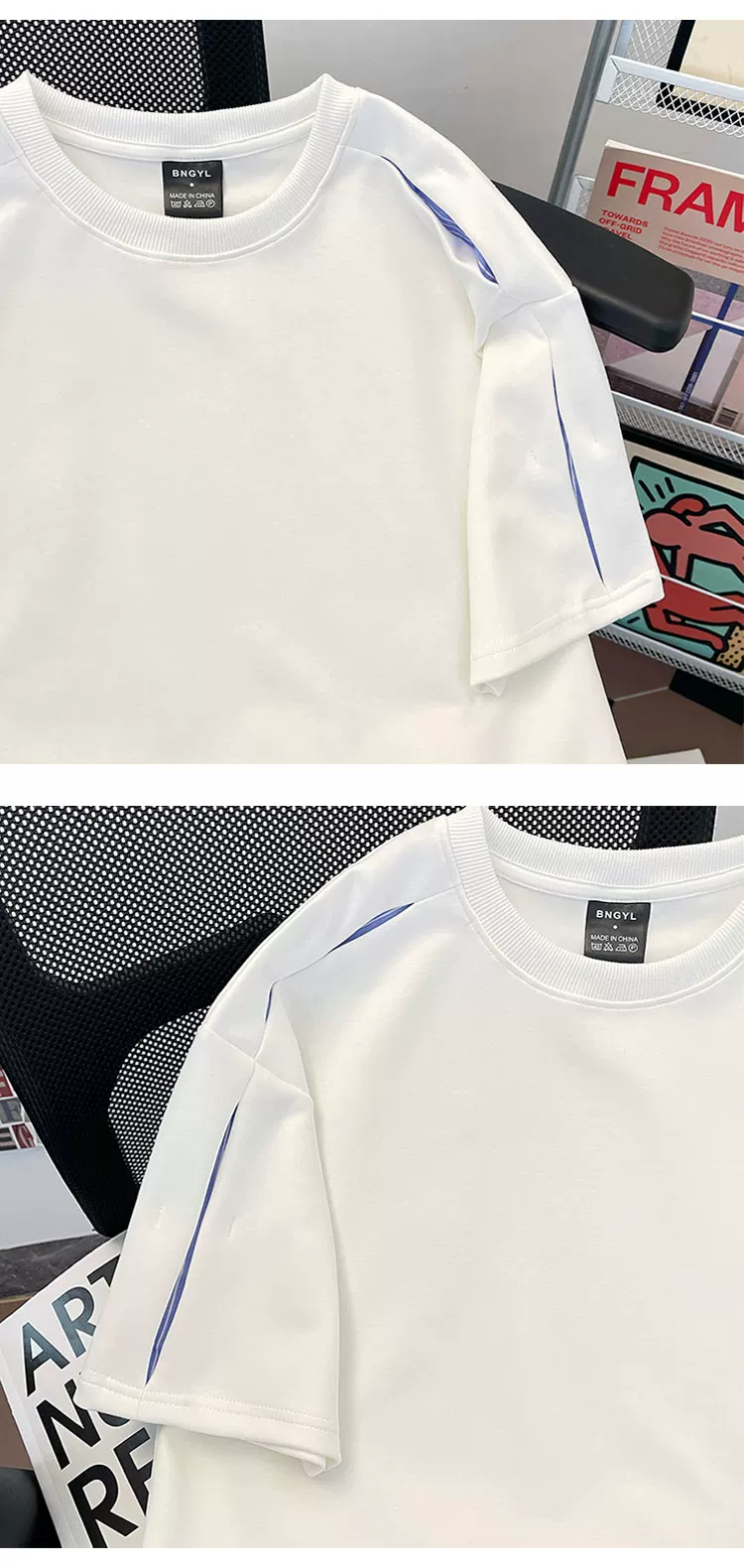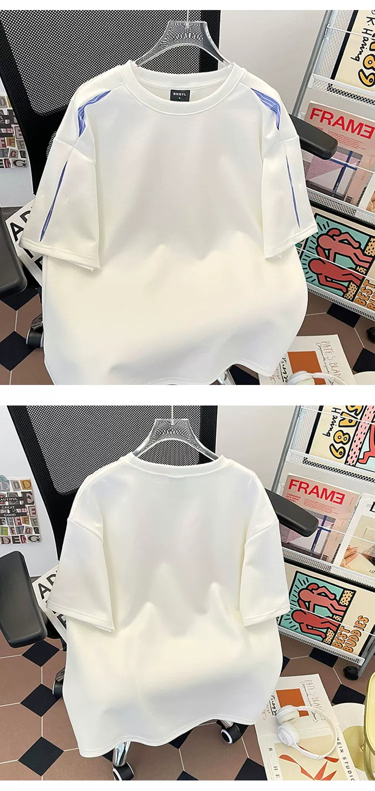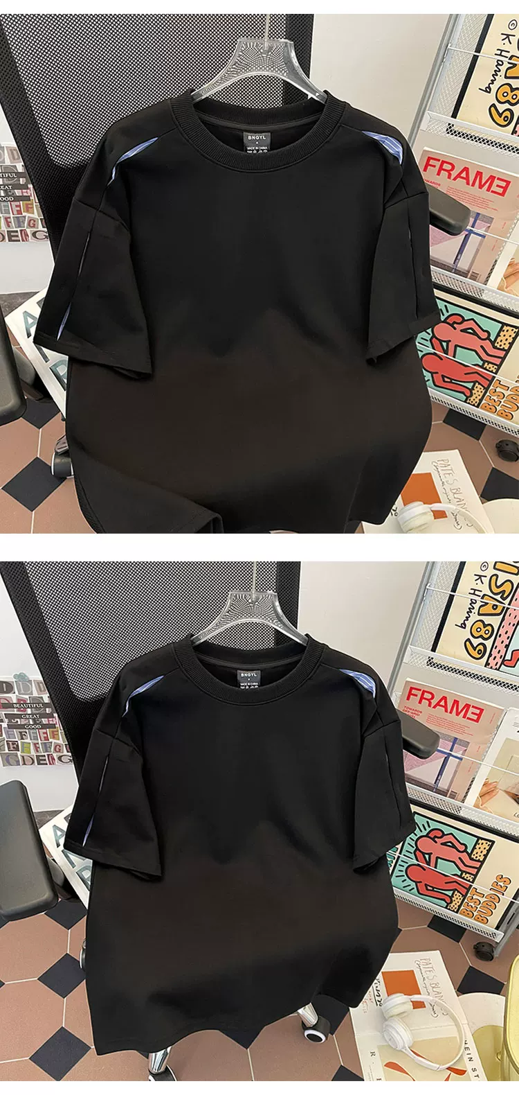 - Áo thun nam tay ngắn phối vải sọc nặng, kiểu dáng phá cách, chất liệu mát mẻ, phong cách Mỹ, cổ tròn, mùa hè.