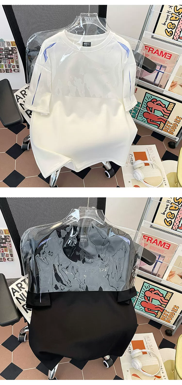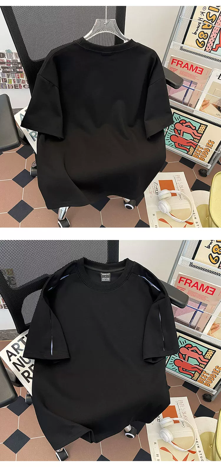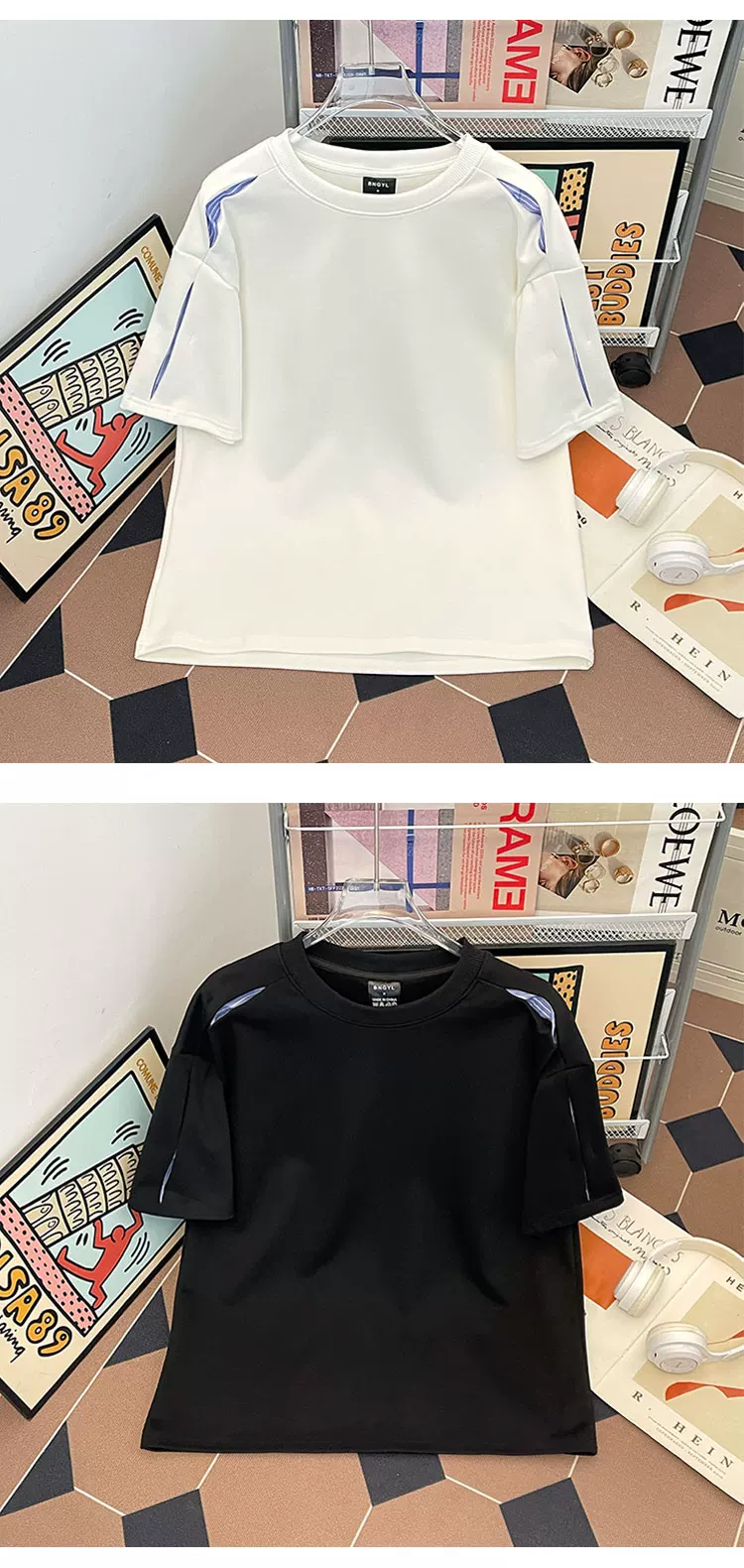 - Áo thun nam tay ngắn phối vải sọc nặng, kiểu dáng phá cách, chất liệu mát mẻ, phong cách Mỹ, cổ tròn, mùa hè.