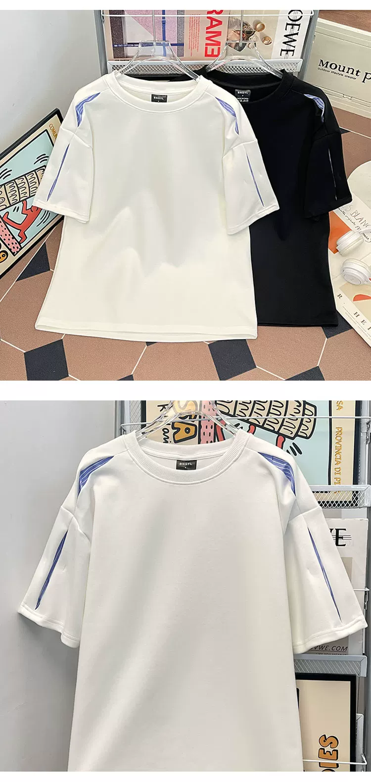 Áo thun nam tay ngắn phối vải sọc nặng, kiểu dáng phá cách, chất liệu mát mẻ, phong cách Mỹ, cổ tròn, mùa hè.