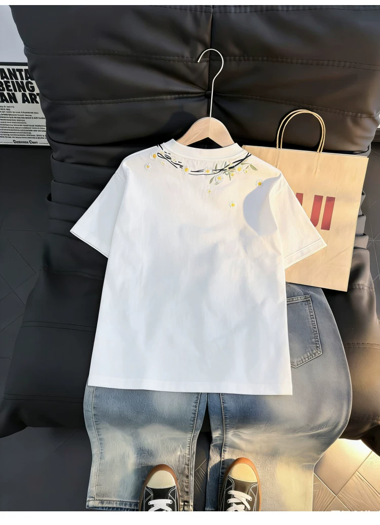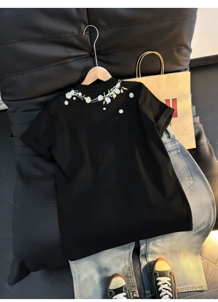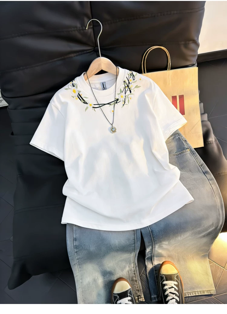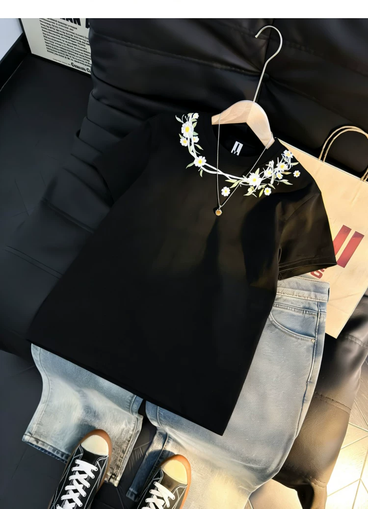 - Áo thun nam tay ngắn thêu hoa, áo phông cổ tròn rộng rãi thời trang mùa hè, áo kiểu Mỹ năng động chất liệu Sorona.