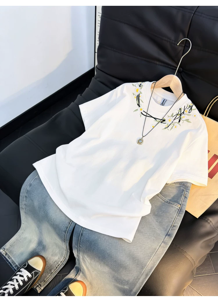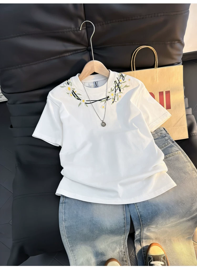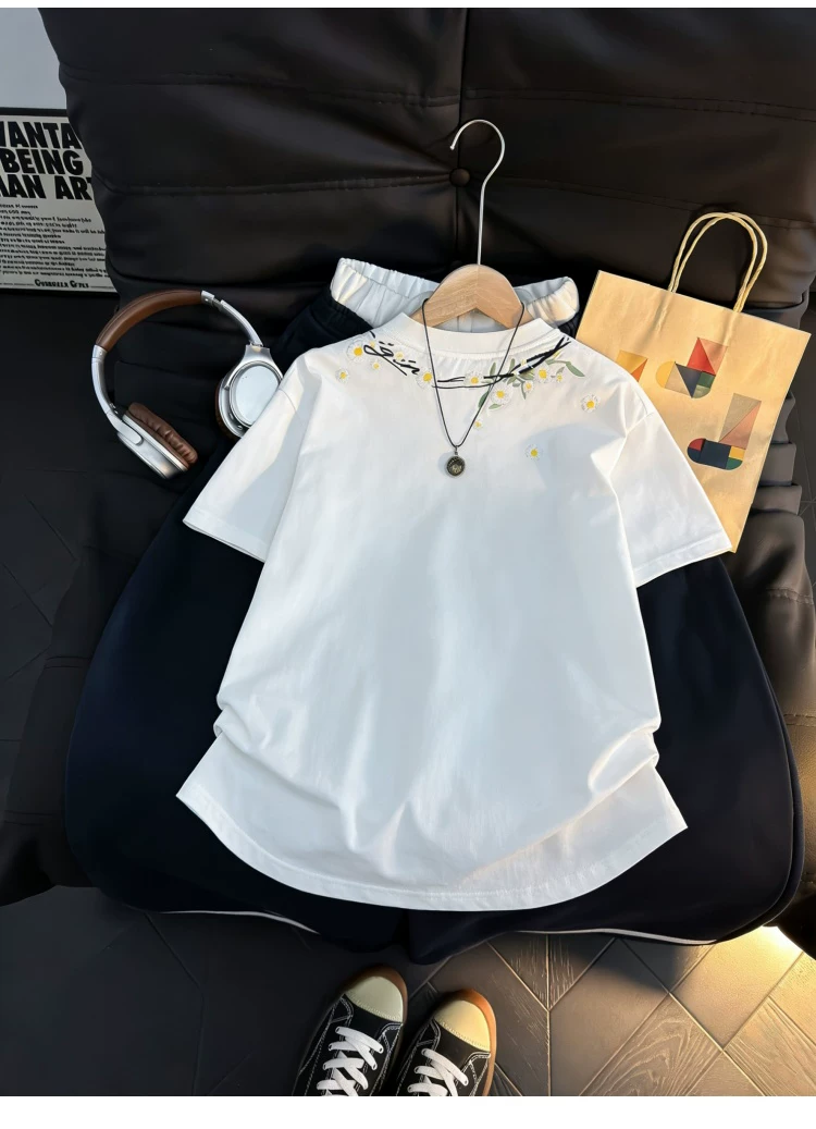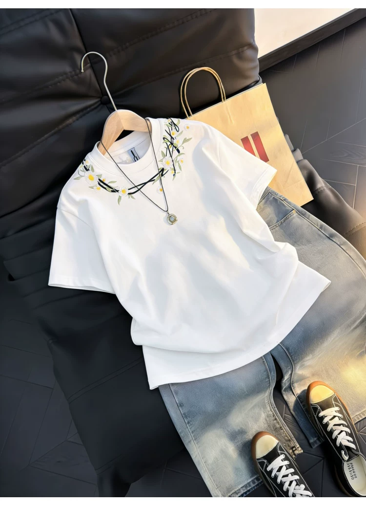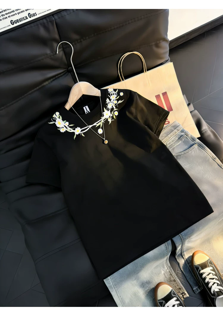 Áo thun nam tay ngắn thêu hoa, áo phông cổ tròn rộng rãi thời trang mùa hè, áo kiểu Mỹ năng động chất liệu Sorona.