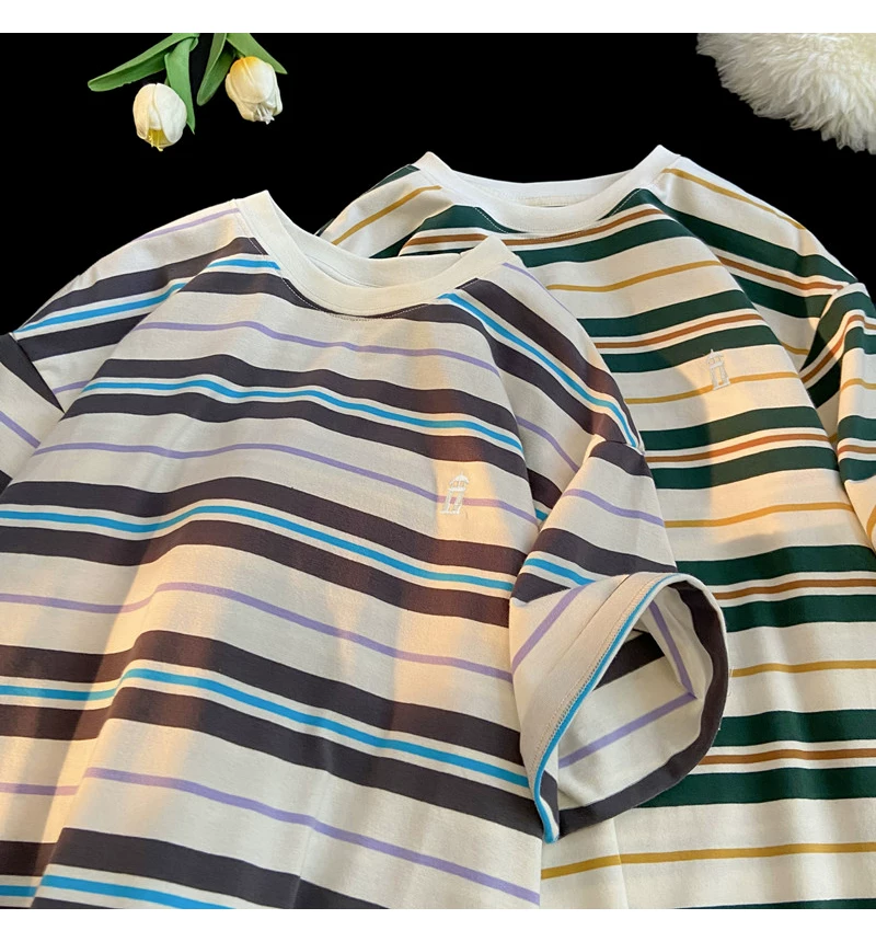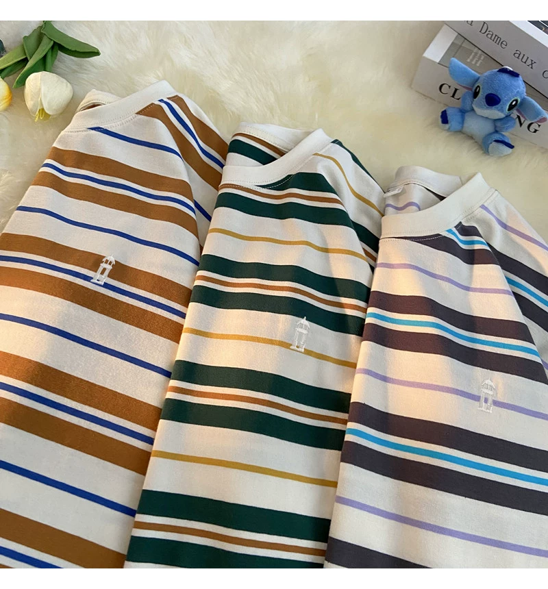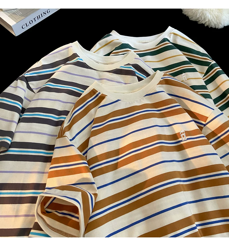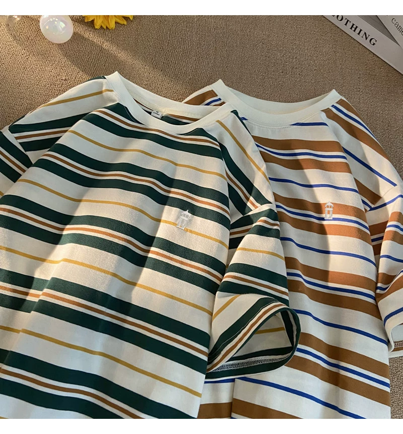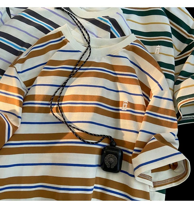 - Áo thun nam tay ngắn thêu sọc, áo thun cotton nguyên chất mùa hè dáng rộng, áo thun phong cách đại học retro Mỹ thời thượng.