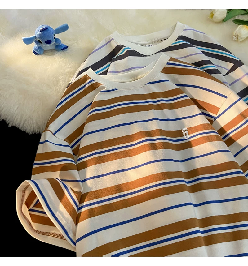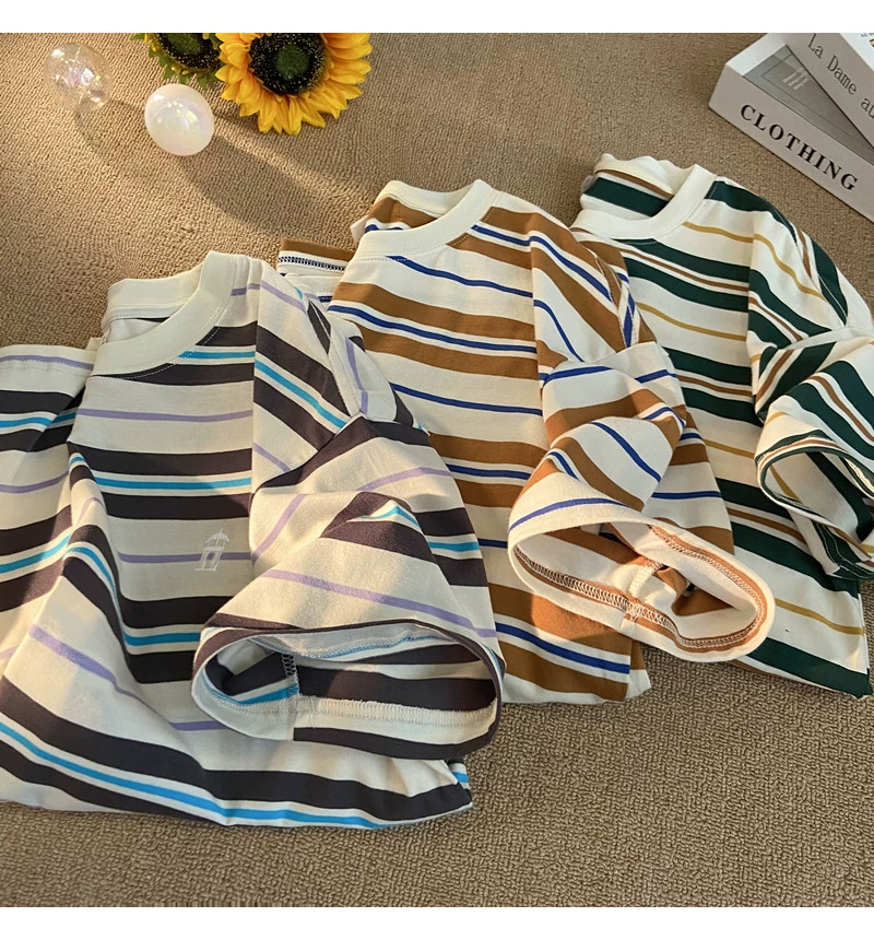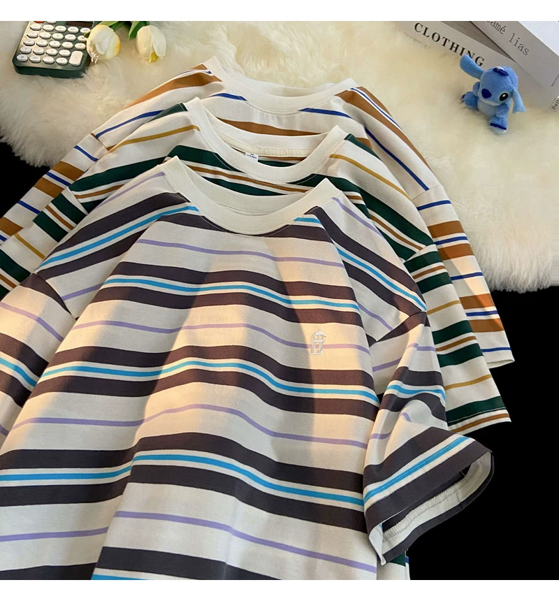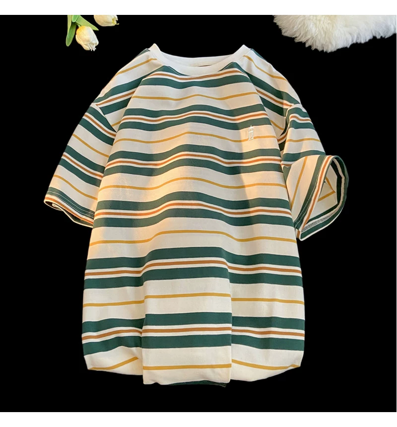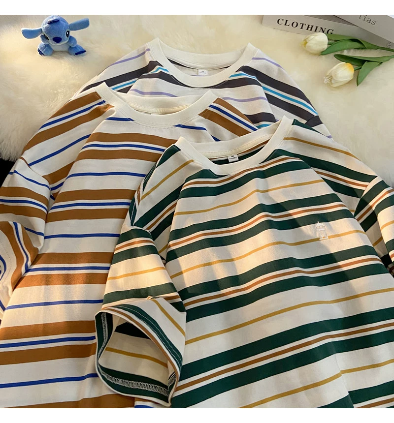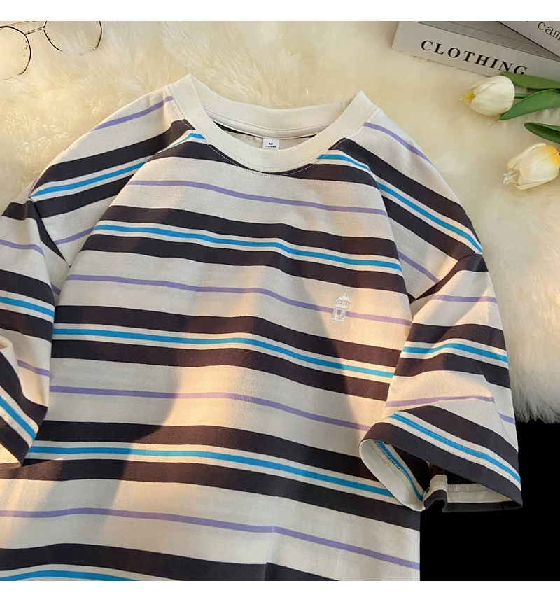 - Áo thun nam tay ngắn thêu sọc, áo thun cotton nguyên chất mùa hè dáng rộng, áo thun phong cách đại học retro Mỹ thời thượng.
