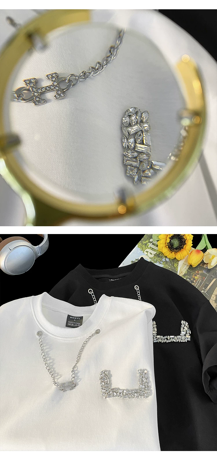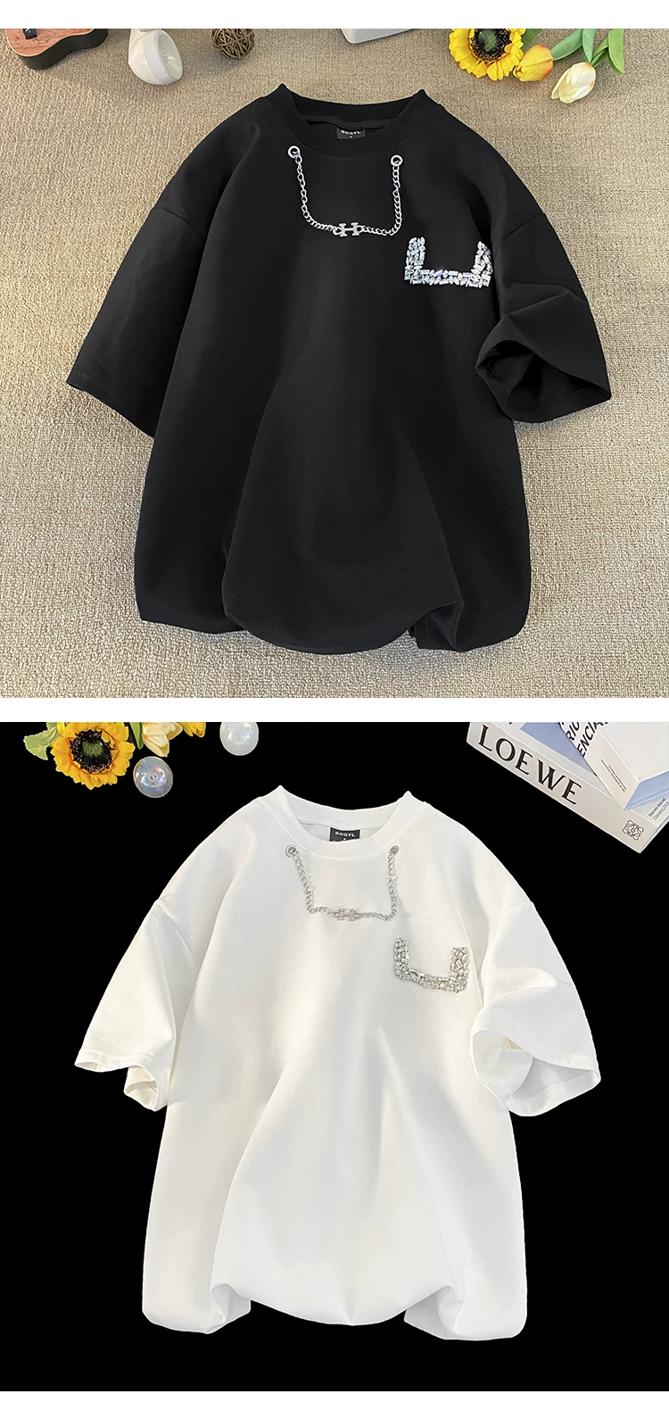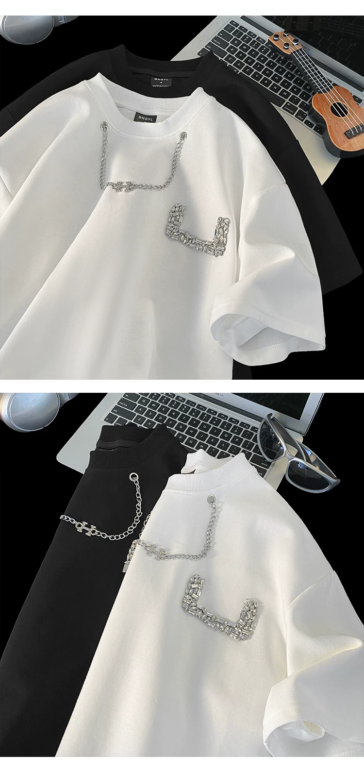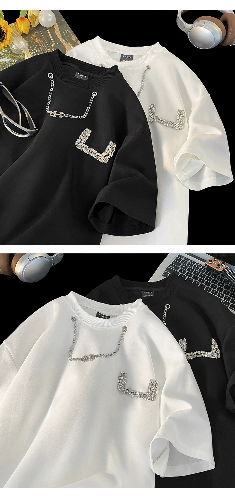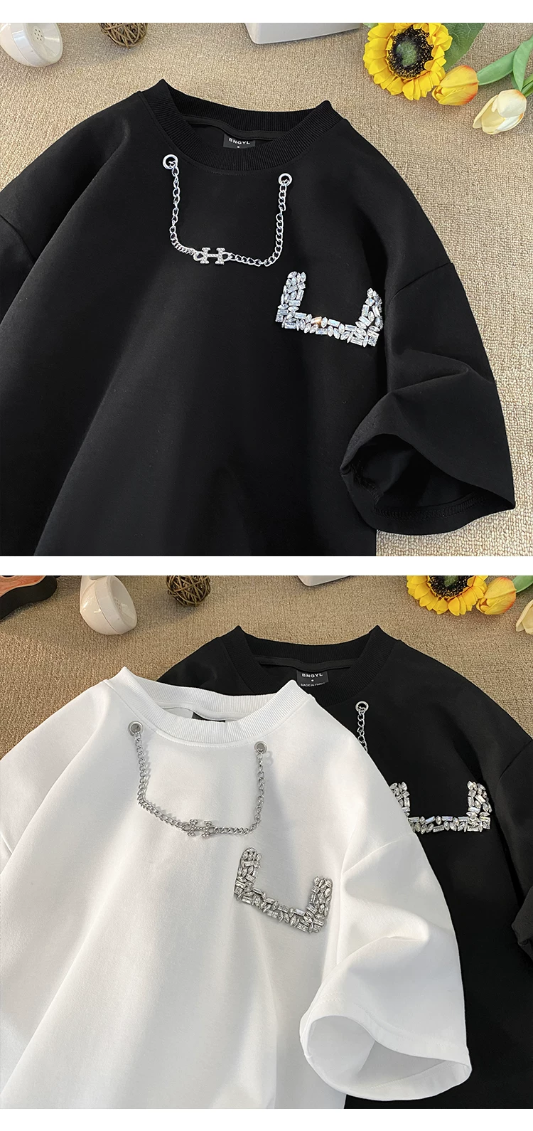 - Áo thun nam tay ngắn thiết kế thời trang đính đá, kiểu dáng cổ tròn rộng rãi, chất liệu dày dặn, thích hợp cho mùa hè.