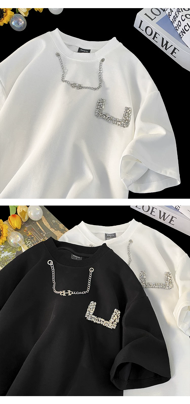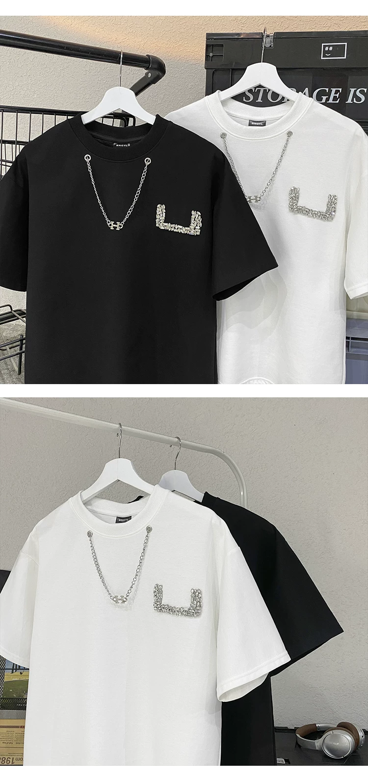 Áo thun nam tay ngắn thiết kế thời trang đính đá, kiểu dáng cổ tròn rộng rãi, chất liệu dày dặn, thích hợp cho mùa hè.