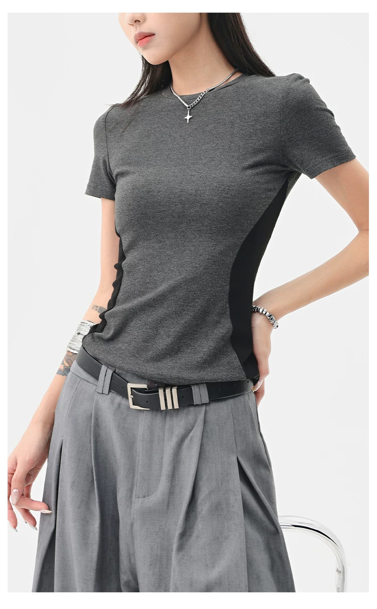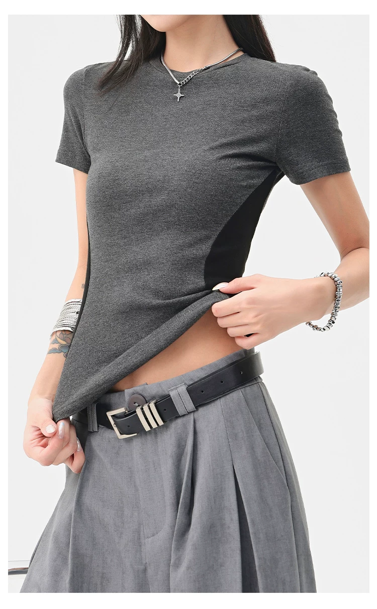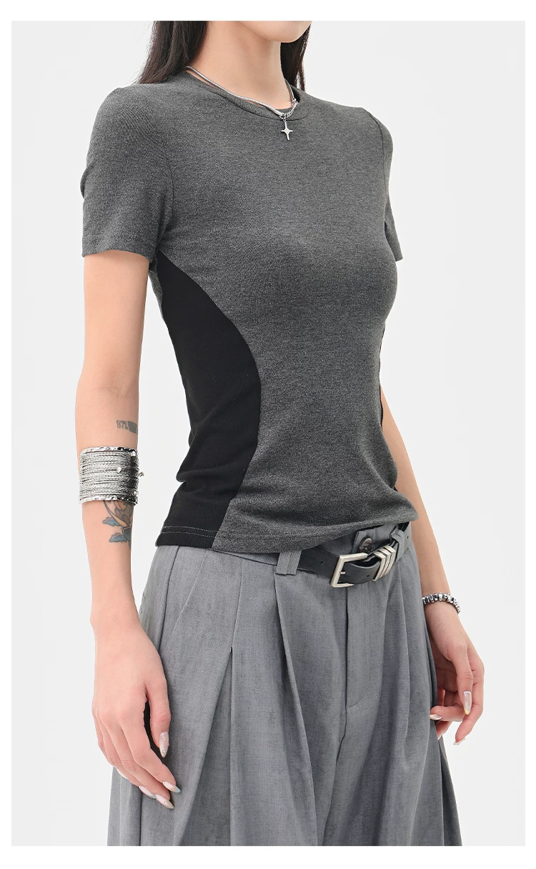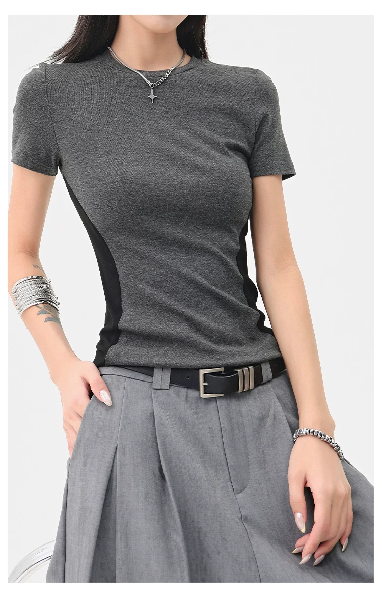 Áo thun ngắn tay cổ tròn màu tương phản cổ điển của KEN STUDIO dành cho nữ mùa hè mới áo thon gọn eo thon gọn