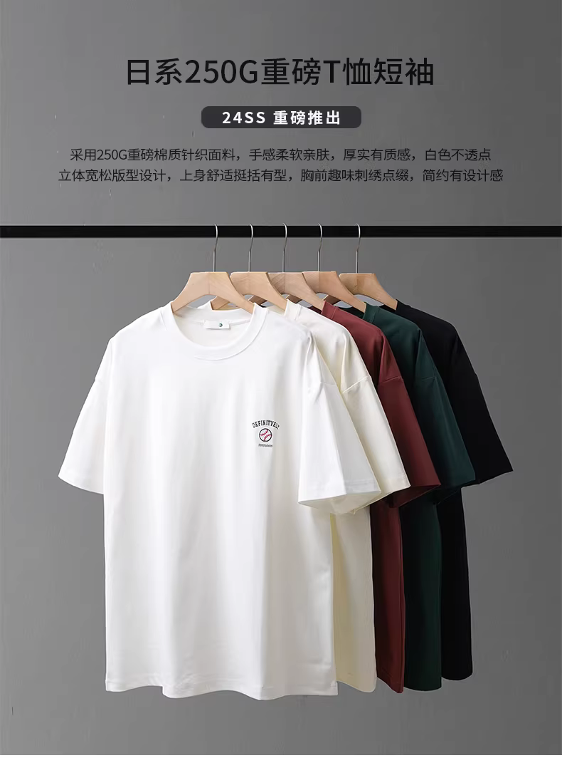 Áo thun ngắn tay hạng nặng Pure Group 260G dành cho nam, cổ tròn mùa hè, dáng rộng, thêu bóng chày cổ điển, áo sơ mi cơ bản màu trơn.