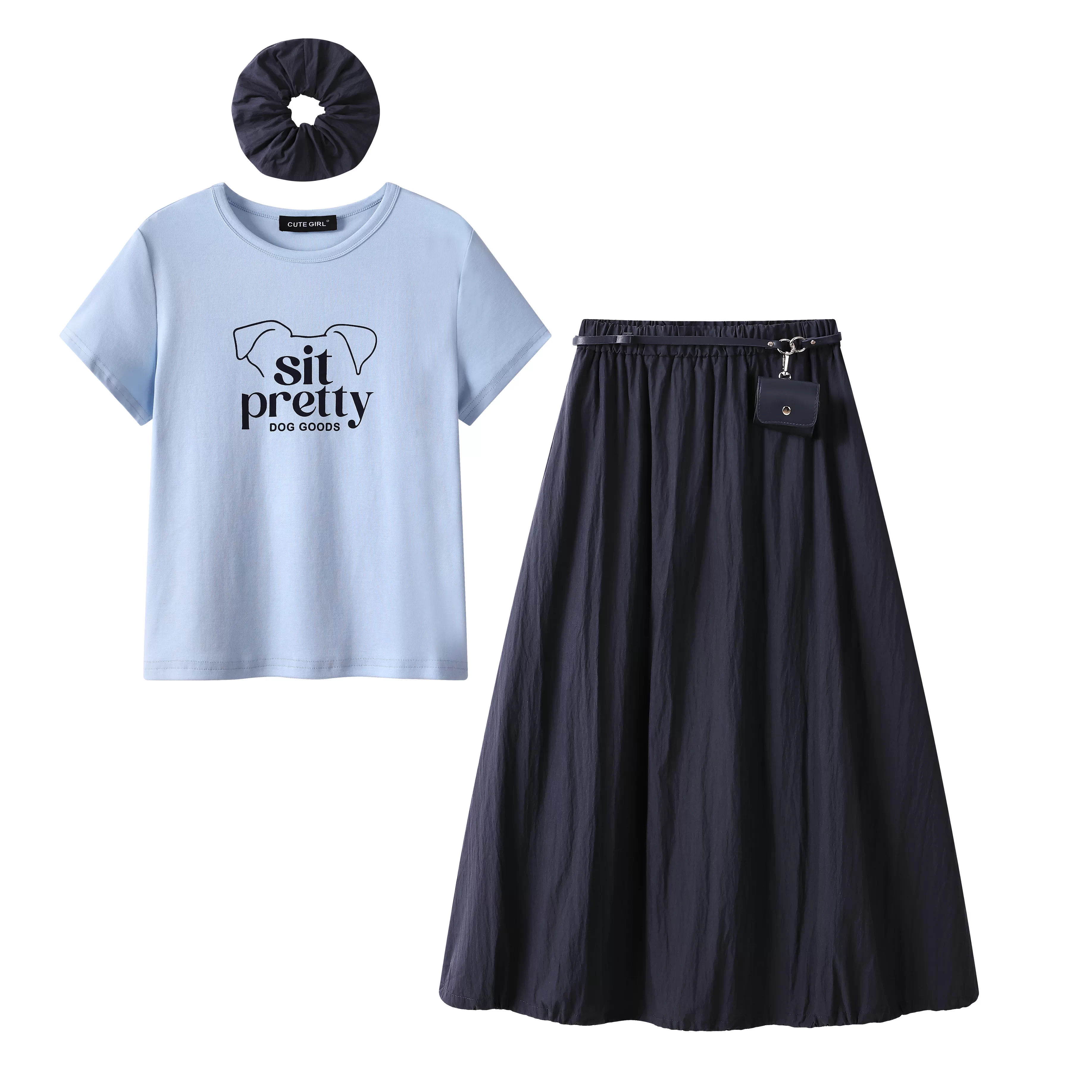 Áo thun ngắn tay in chữ giảm tuổi theo phong cách Hàn Quốc dễ thương dành cho nữ mùa hè váy xòe màu xám cạp cao bộ hai món