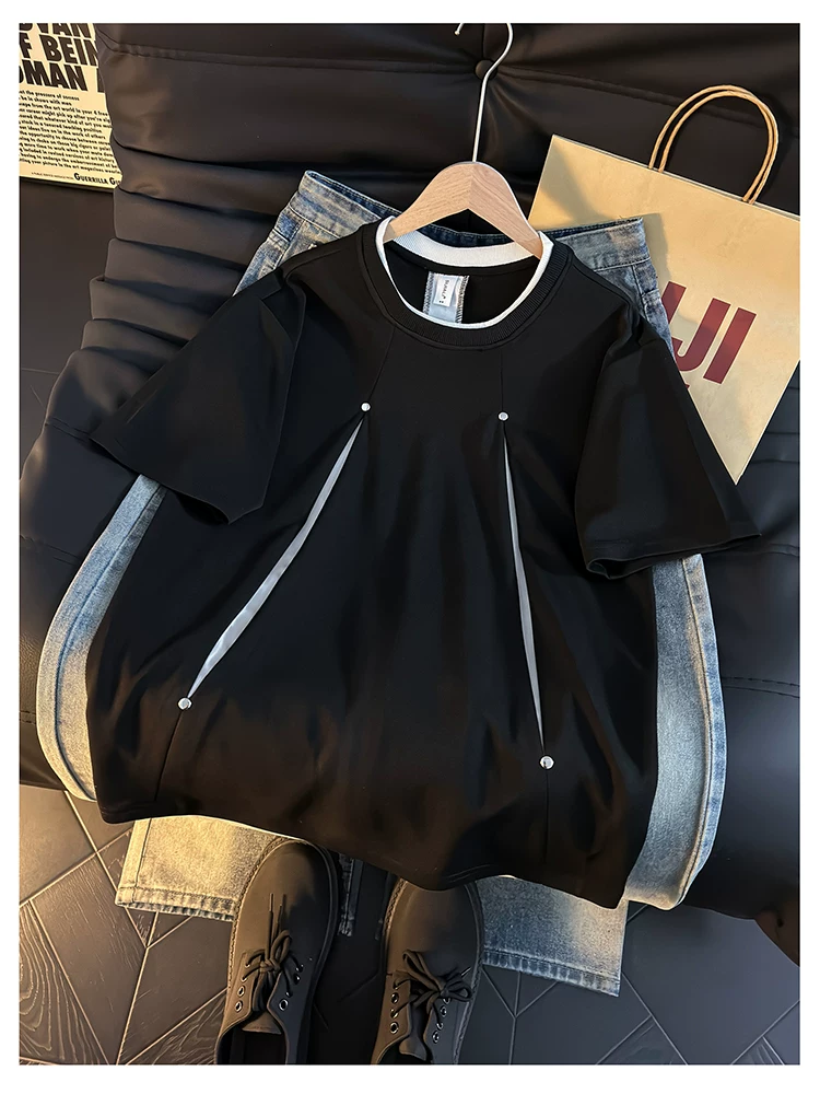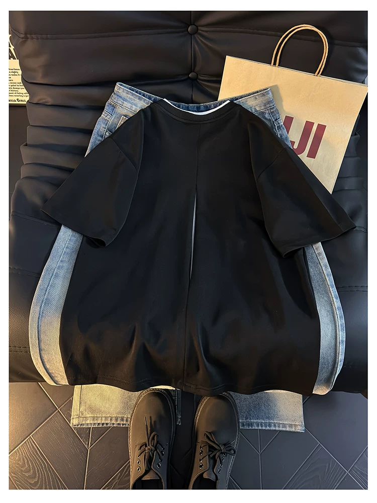 Áo thun ngắn tay kiểu Mỹ dành cho nam và nữ, áo thun cổ tròn dáng rộng hợp thời trang, áo thiết kế chắp vá mùa xuân thu.