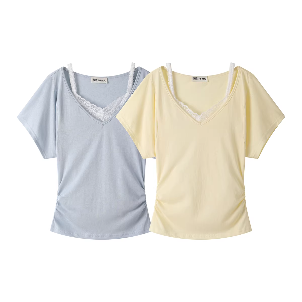 Áo thun ngắn tay phối ren phong cách sang trọng và thuần khiết của Hàn Quốc dành cho nữ, áo ngắn mùa hè gợi cảm cho cô gái nóng bỏng