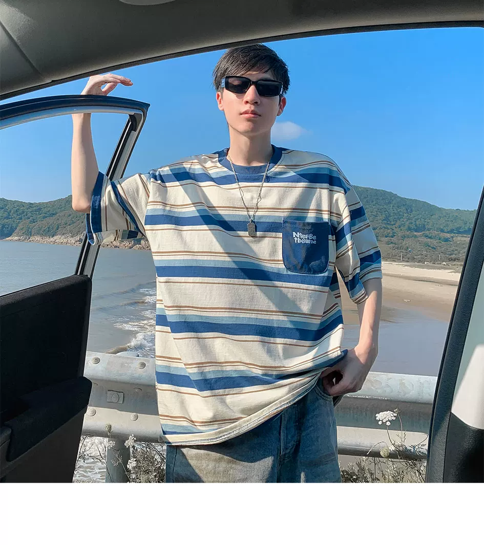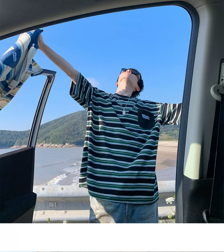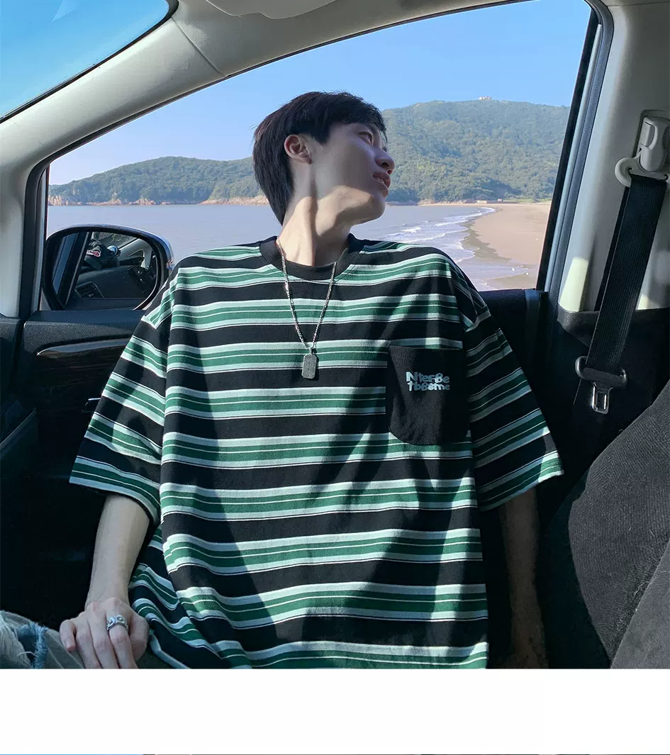 - Áo thun ngắn tay sọc kiểu Mỹ dành cho nam và nữ, thiết kế hợp thời trang, áo đôi cổ tròn dáng rộng.