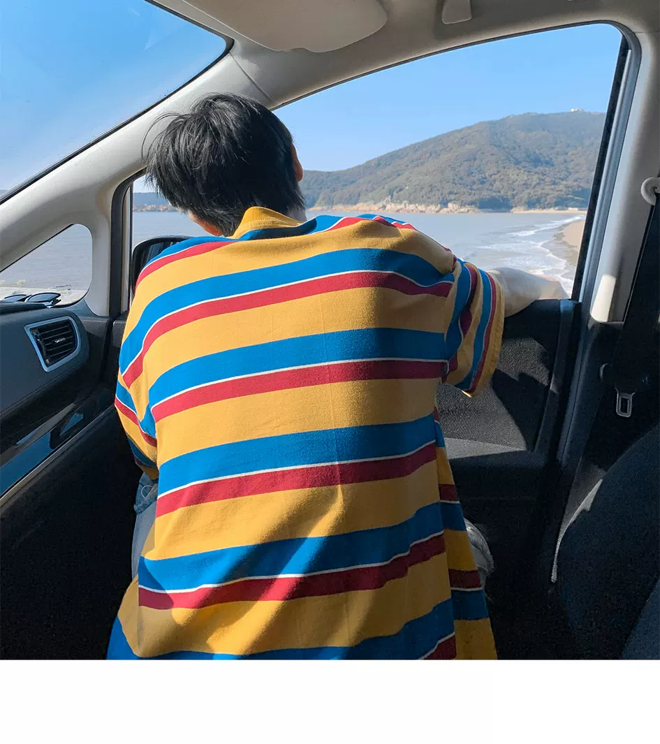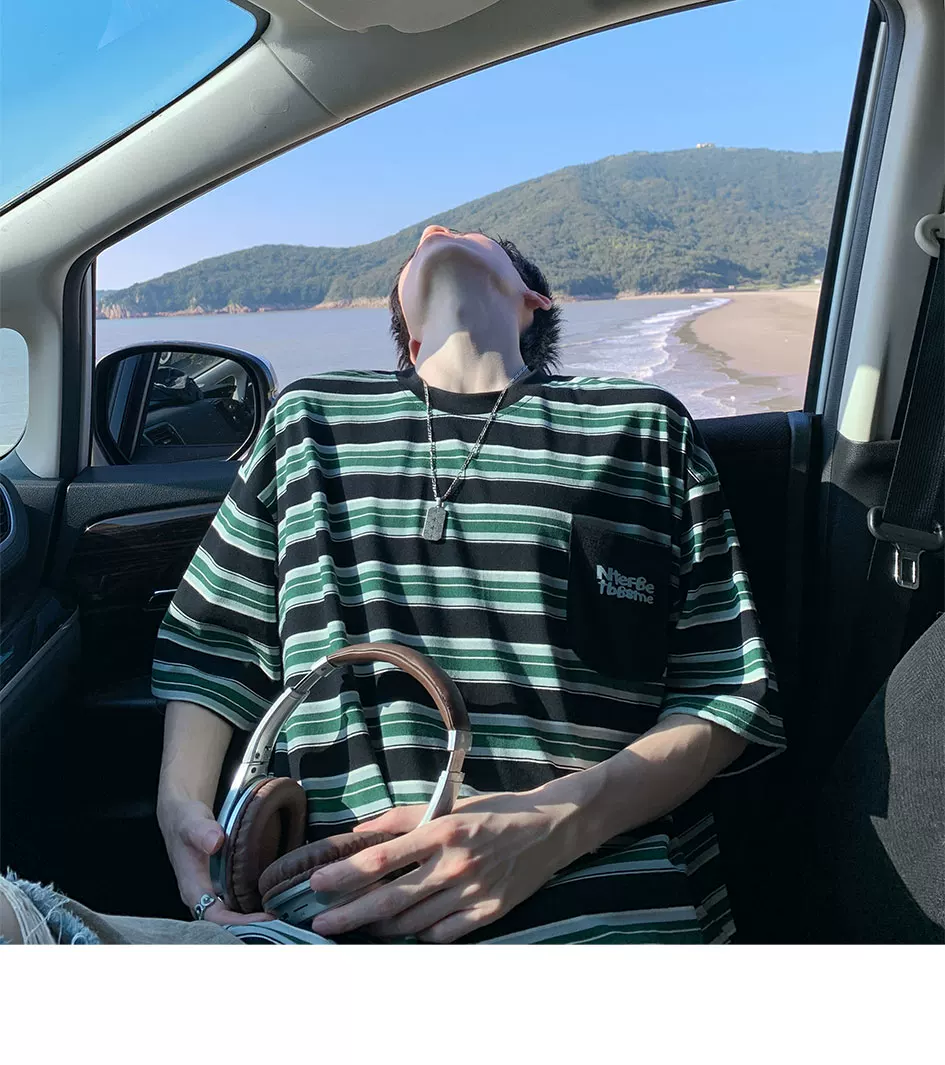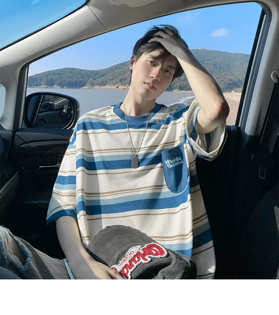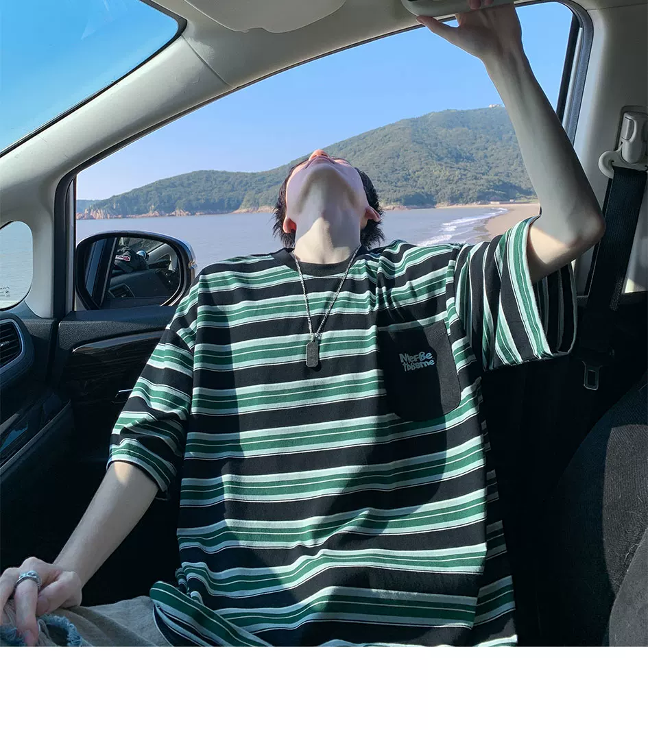 - Áo thun ngắn tay sọc kiểu Mỹ dành cho nam và nữ, thiết kế hợp thời trang, áo đôi cổ tròn dáng rộng.