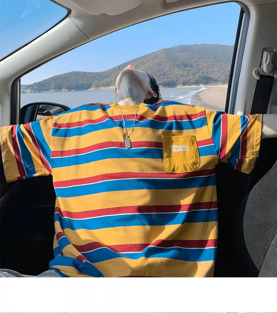Áo thun ngắn tay sọc kiểu Mỹ dành cho nam và nữ, thiết kế hợp thời trang, áo đôi cổ tròn dáng rộng.