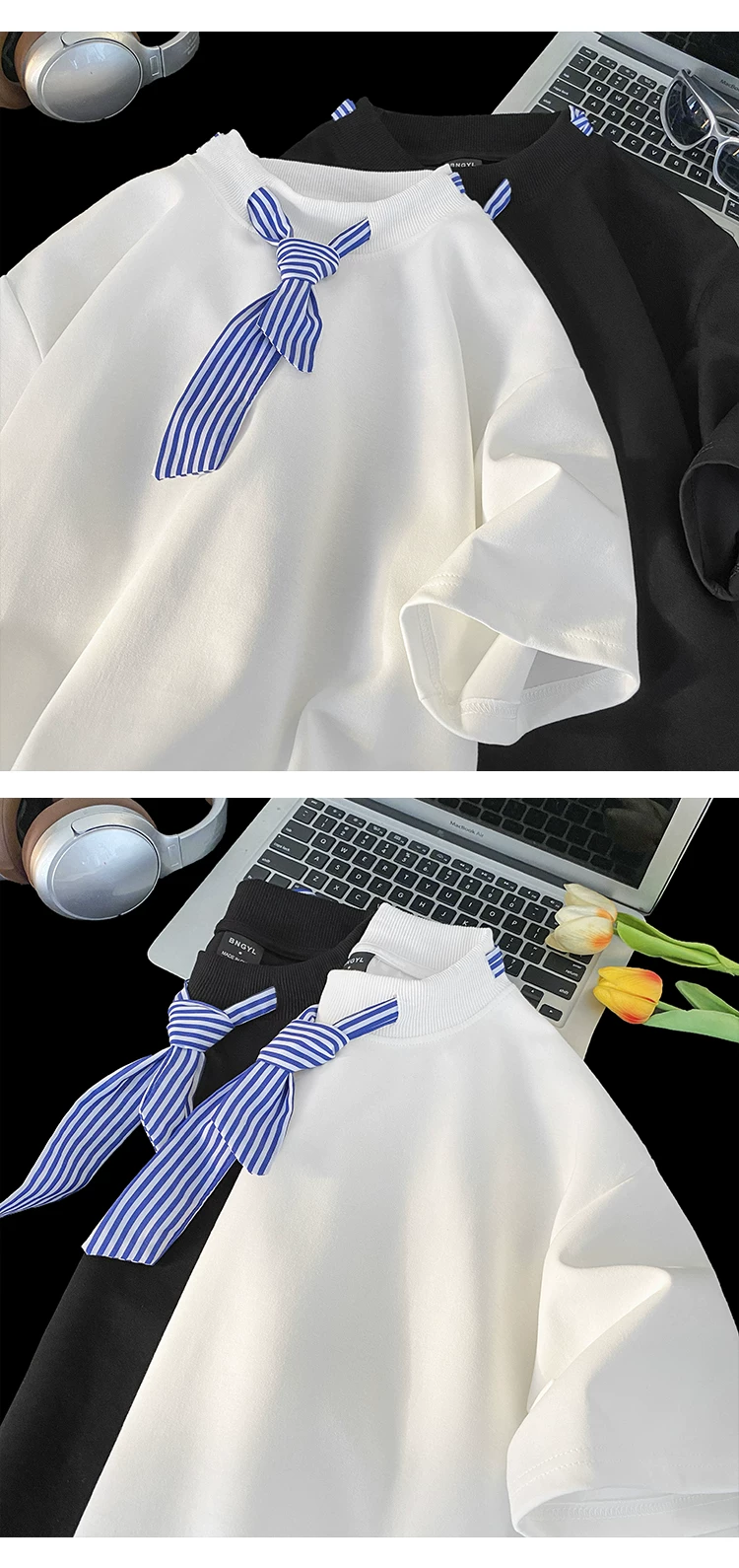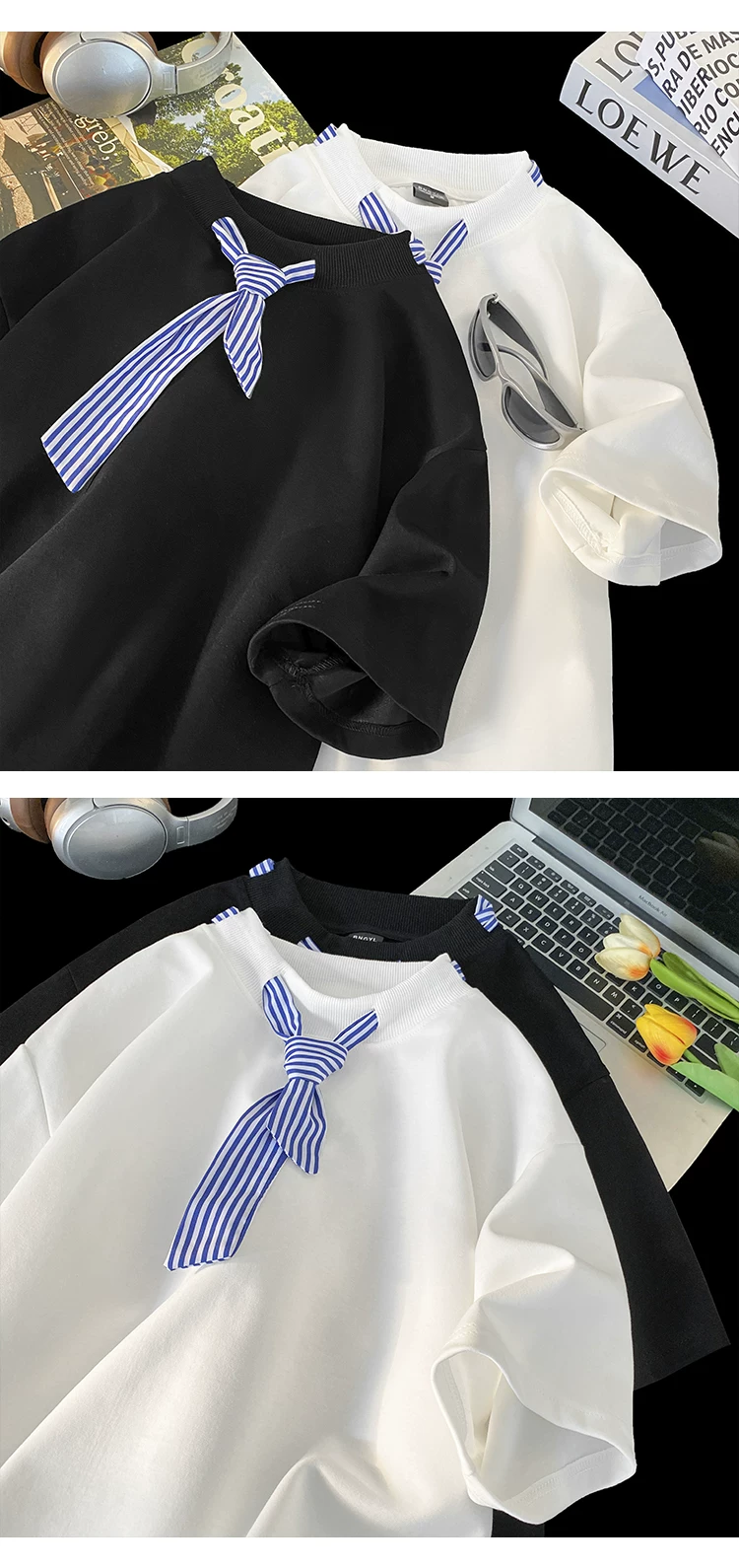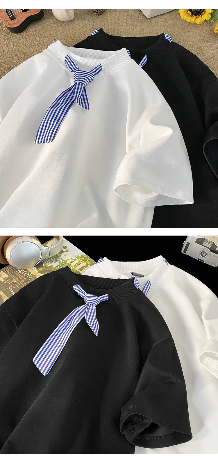 - Áo thun ngắn tay sọc kiểu Nhật dành cho nam, áo thun cổ tròn dáng rộng hợp thời trang mùa hè kiểu Mỹ.