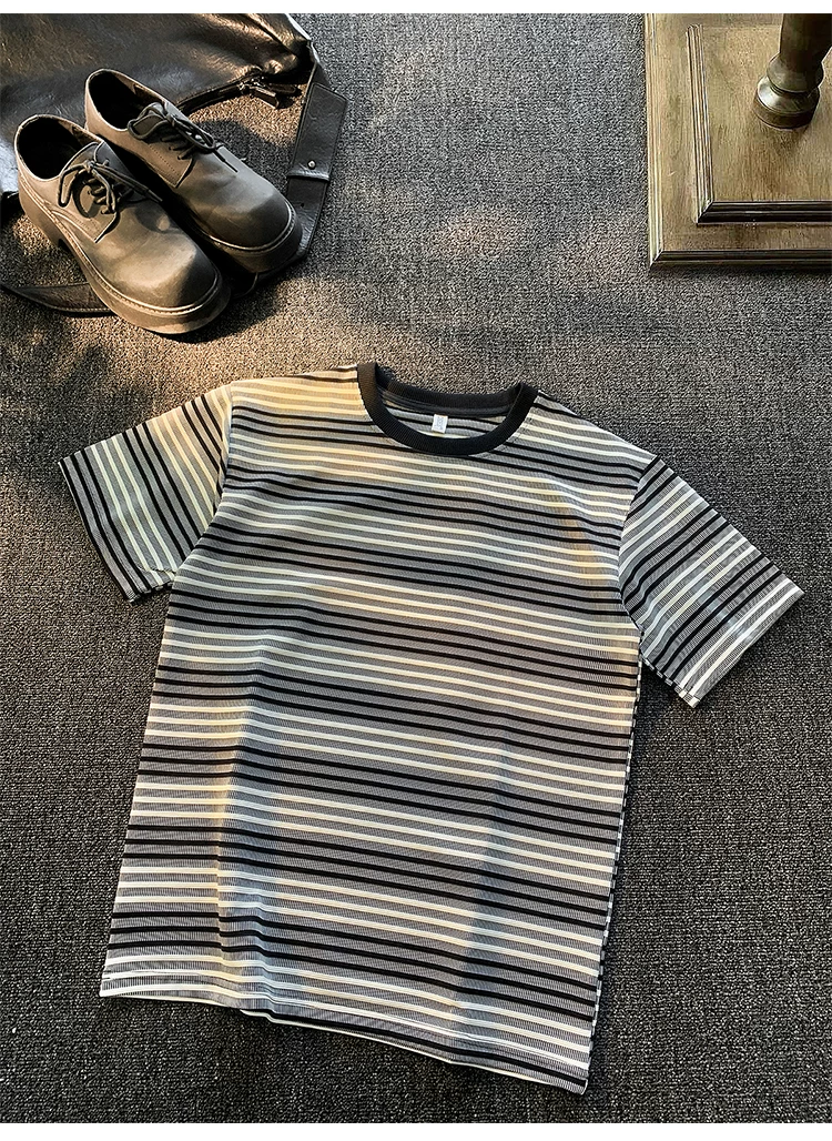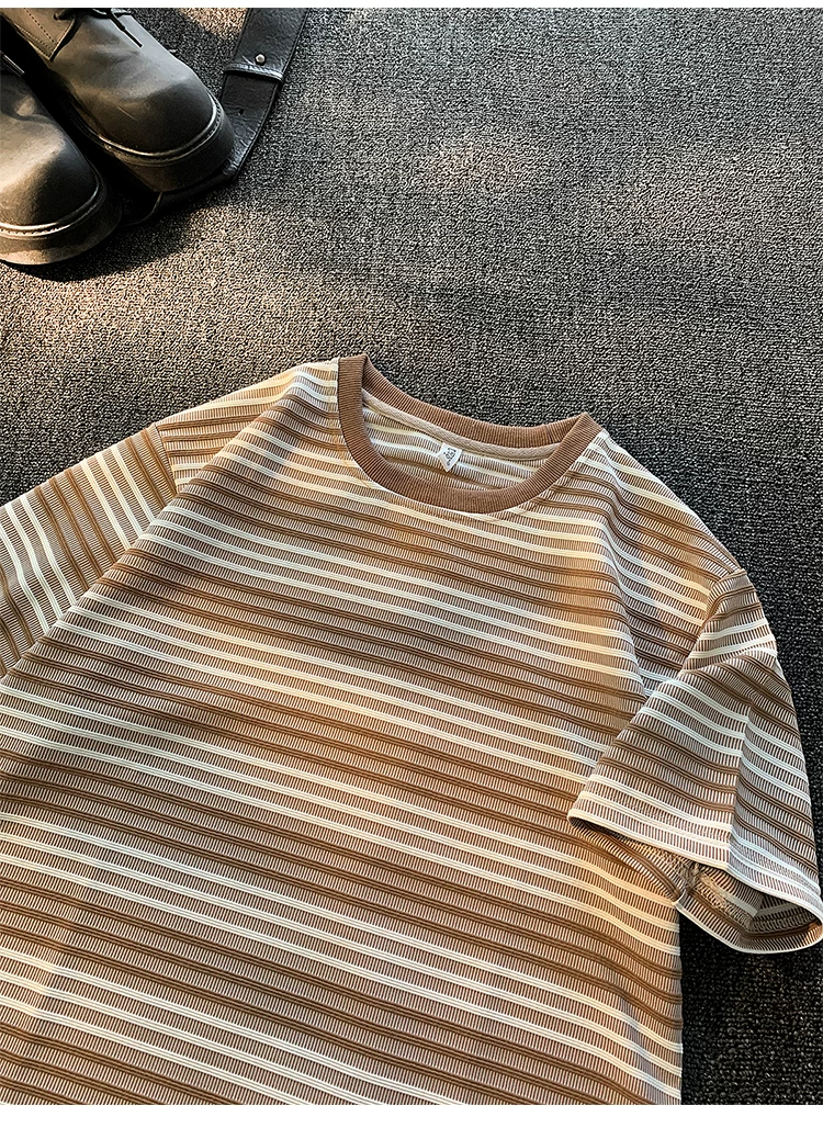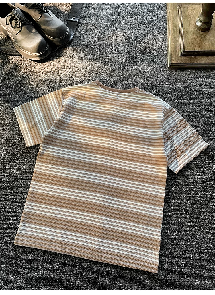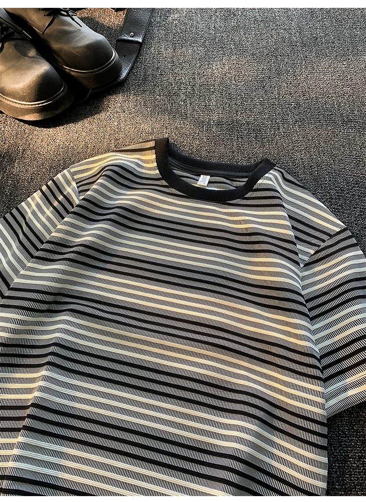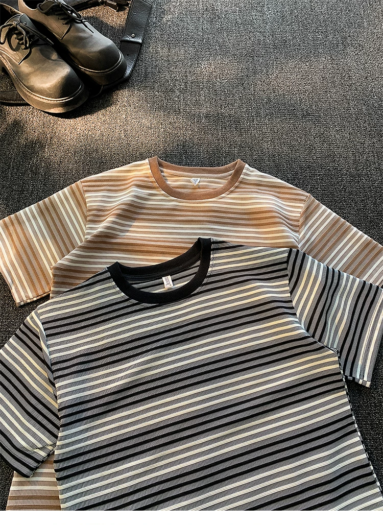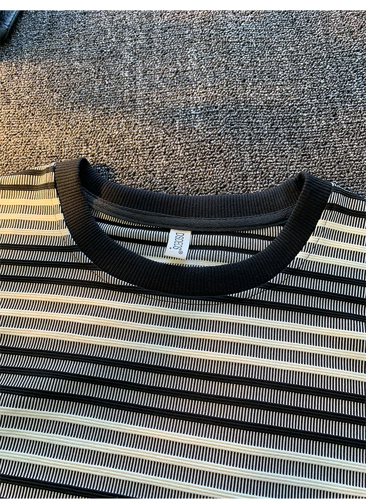 - Áo thun ngắn tay sọc kiểu Nhật dành cho nam và nữ, áo phối màu mùa hè, thương hiệu thời thượng, áo thun nửa tay dáng rộng, chất liệu dày dặn.
