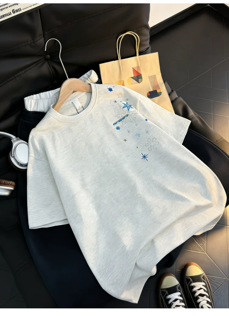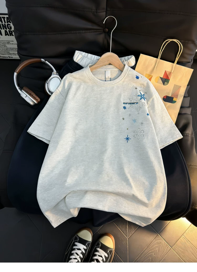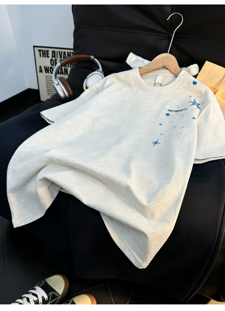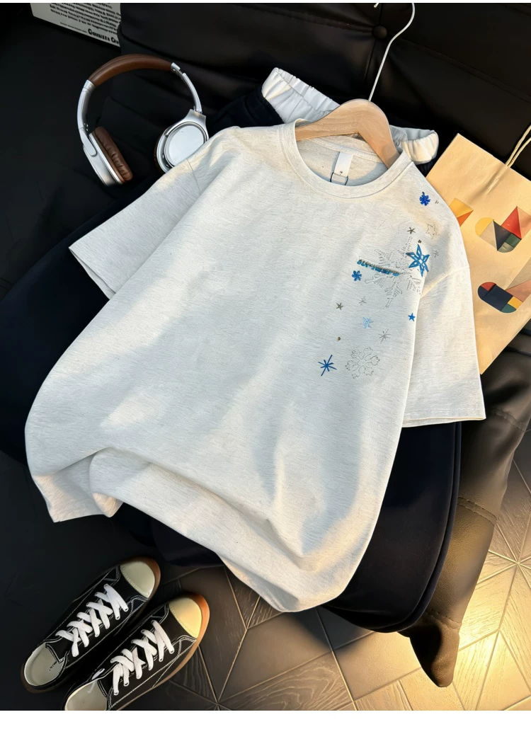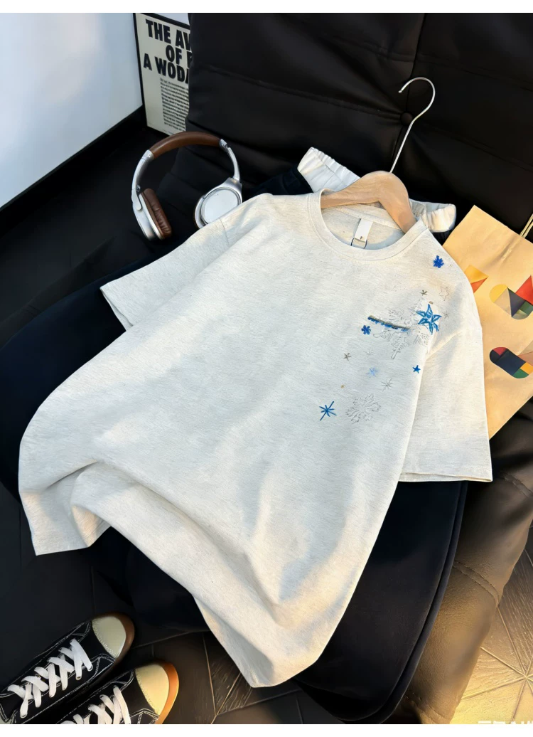 Áo thun ngắn tay thêu họa tiết retro Mỹ dành cho nam và nữ, áo sơ mi cổ tròn dáng rộng mùa hè, áo kiểu cặp đôi thời trang, phong cách giản dị.