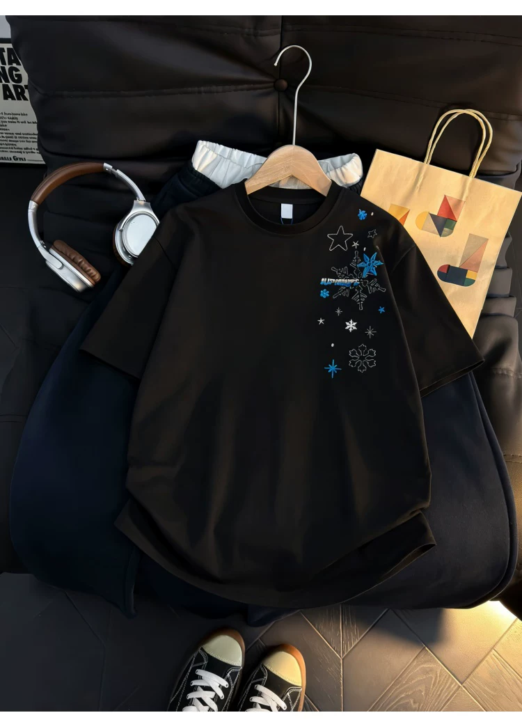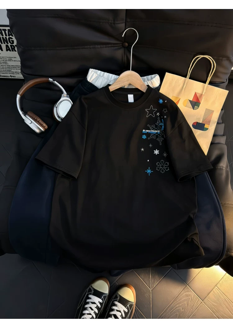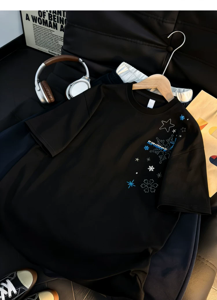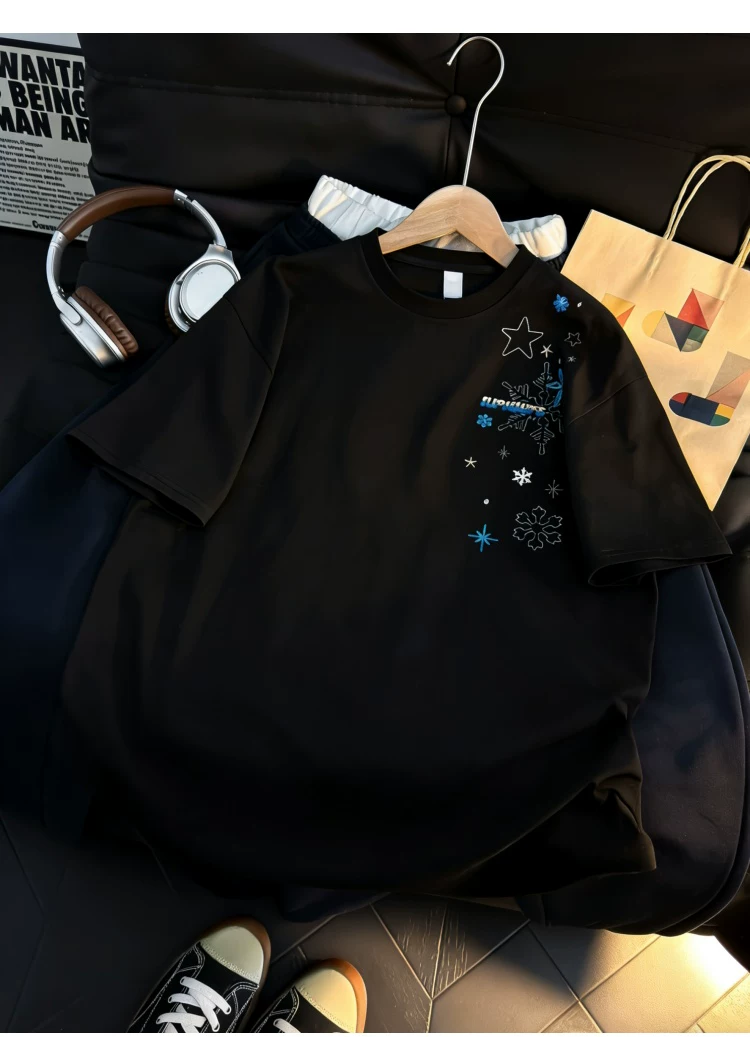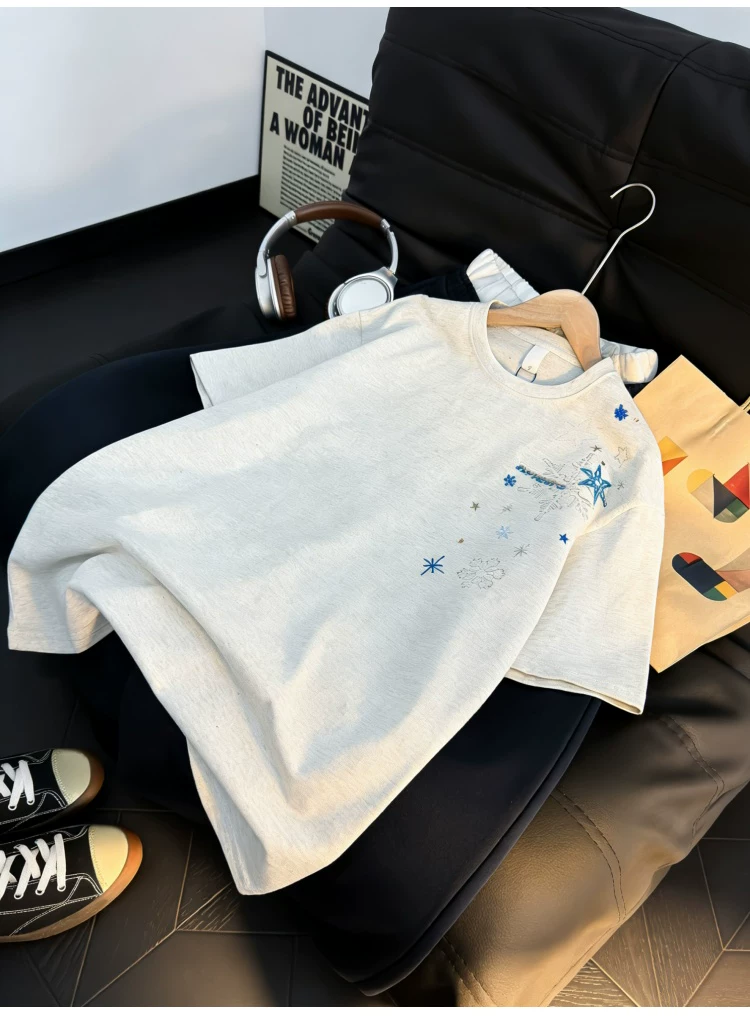 - Áo thun ngắn tay thêu họa tiết retro Mỹ dành cho nam và nữ, áo sơ mi cổ tròn dáng rộng mùa hè, áo kiểu cặp đôi thời trang, phong cách giản dị.