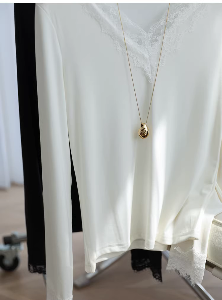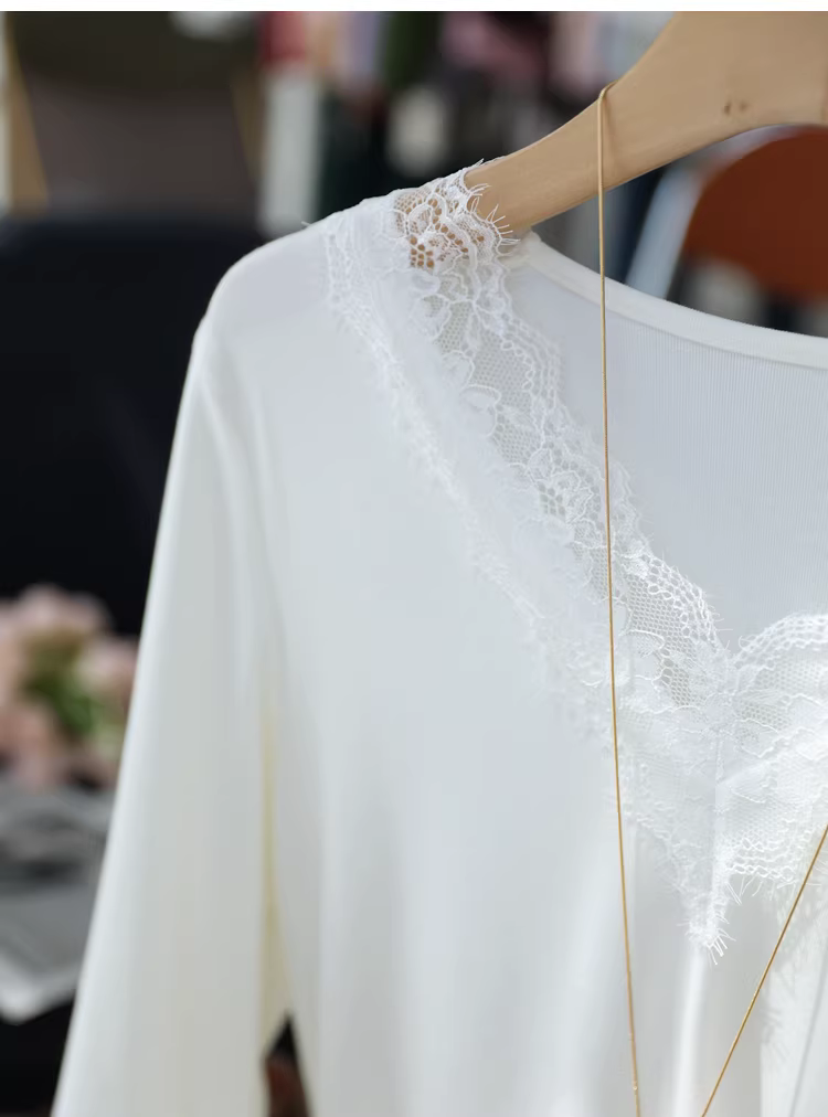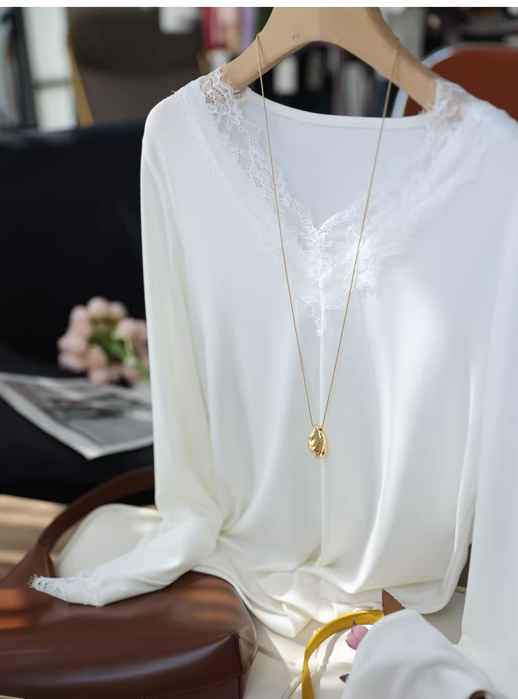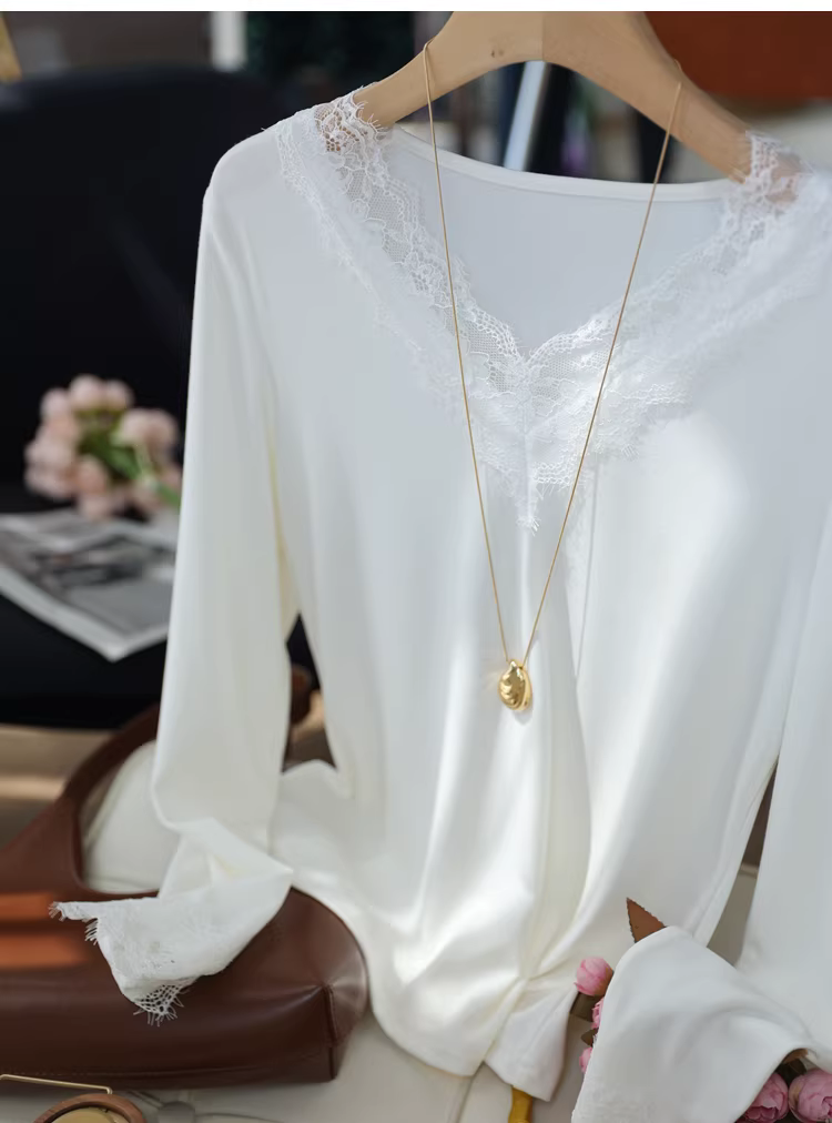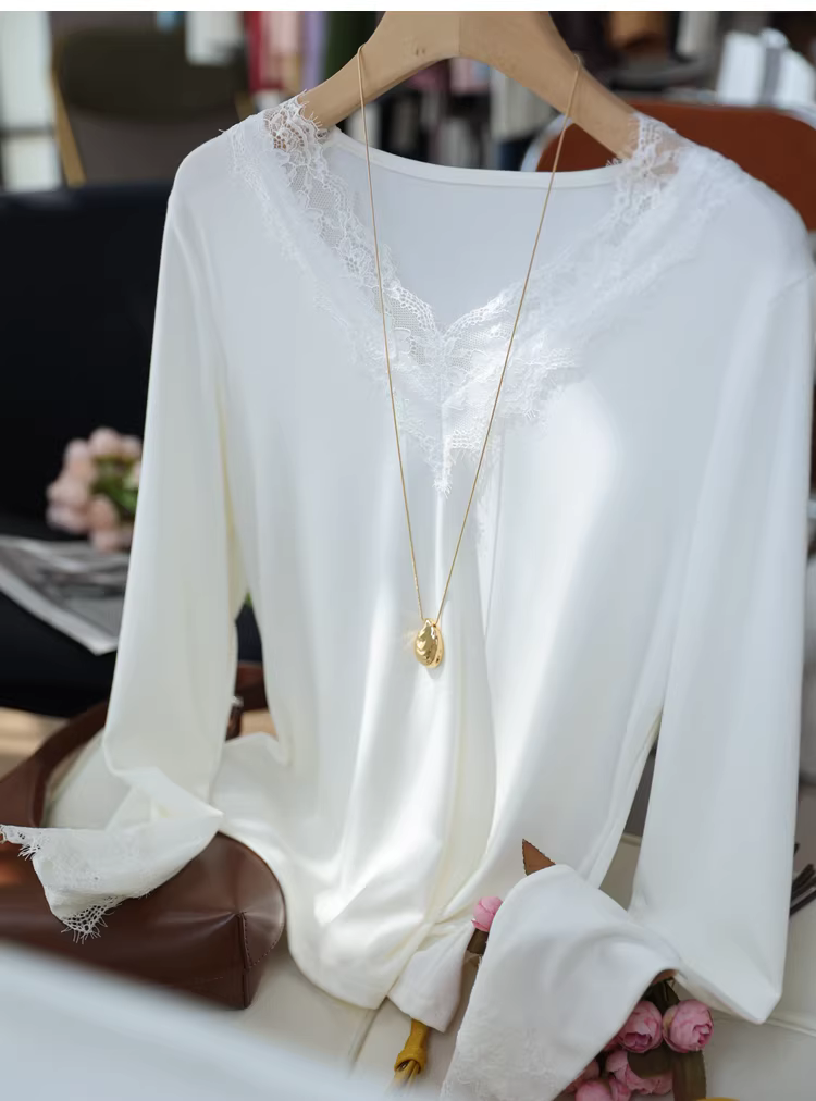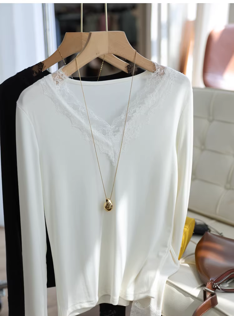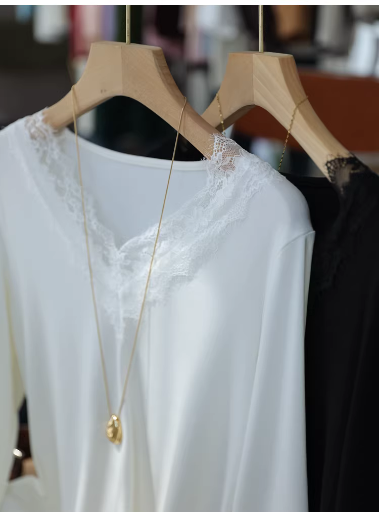- Áo thun nữ cổ V phối ren kiểu dáng ôm dáng tay dài chất liệu ren lưới, màu trơn, mặc trong mùa thu