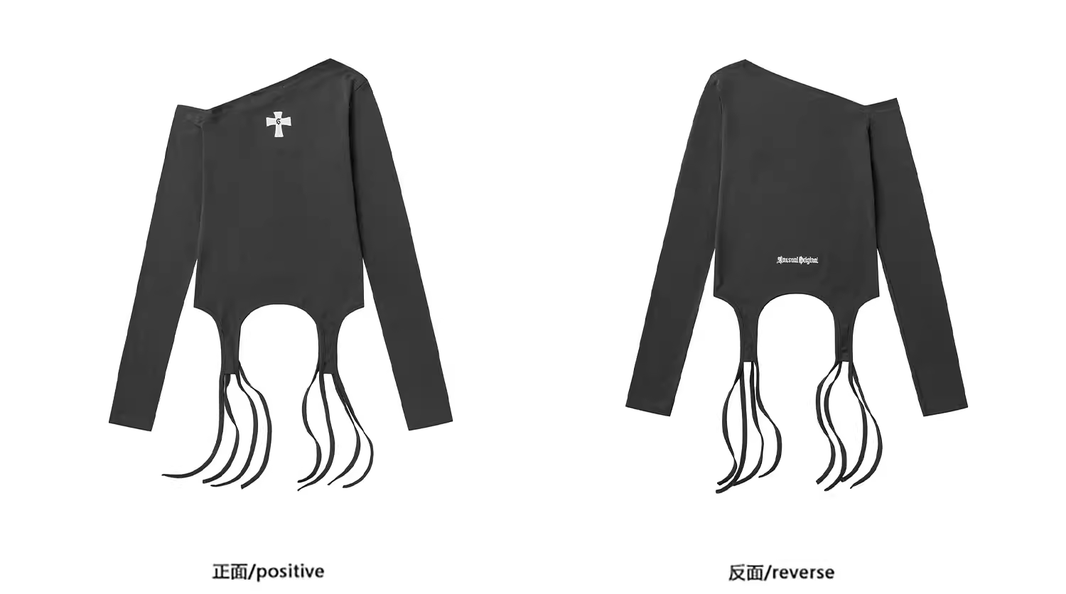 Áo thun nữ tay dài, cổ trễ vai, thêu chữ thập họa tiết K787, kiểu dáng ôm sát, vạt áo bất đối xứng.