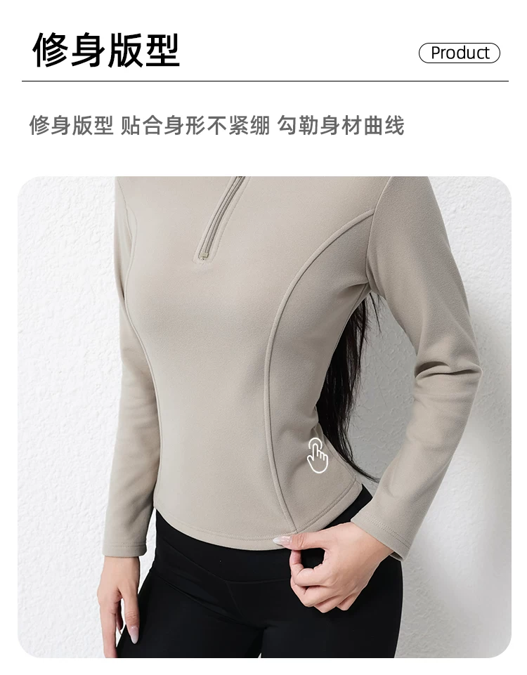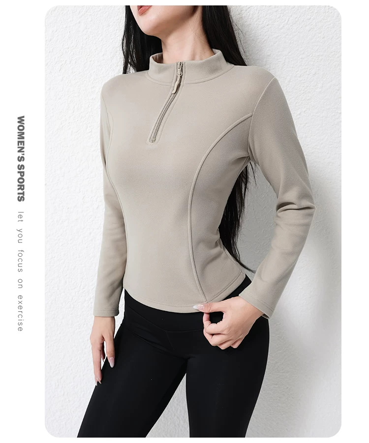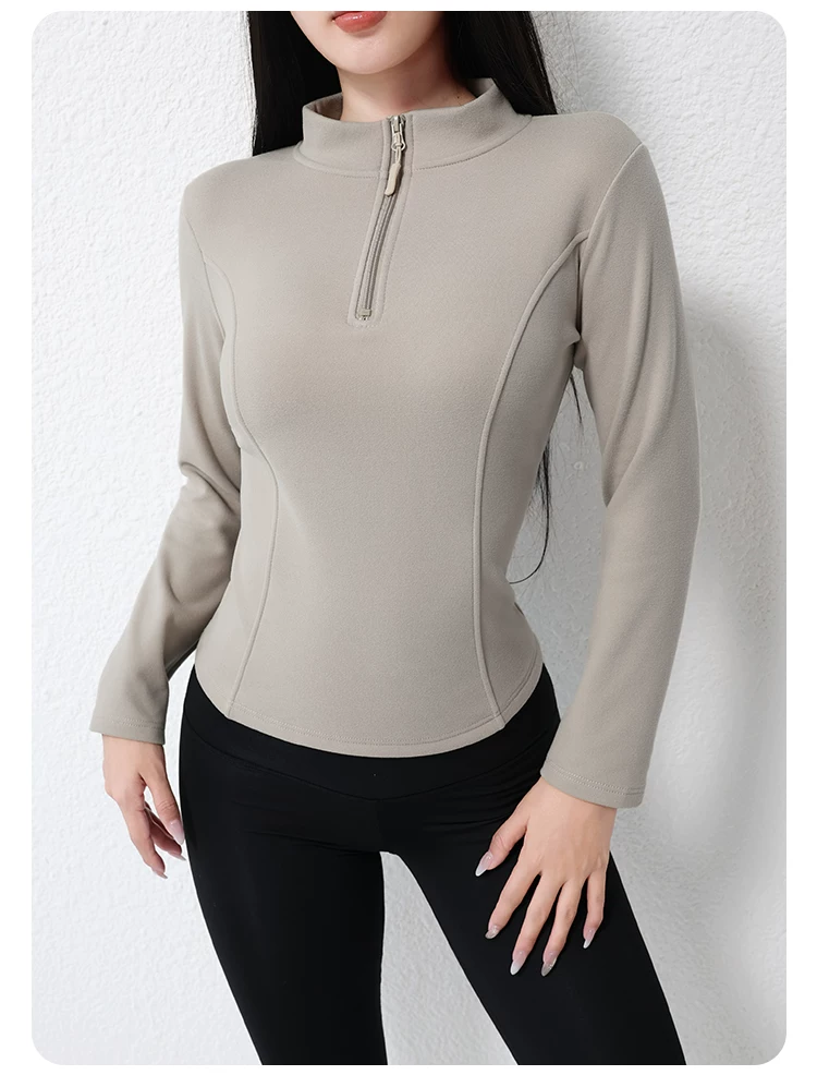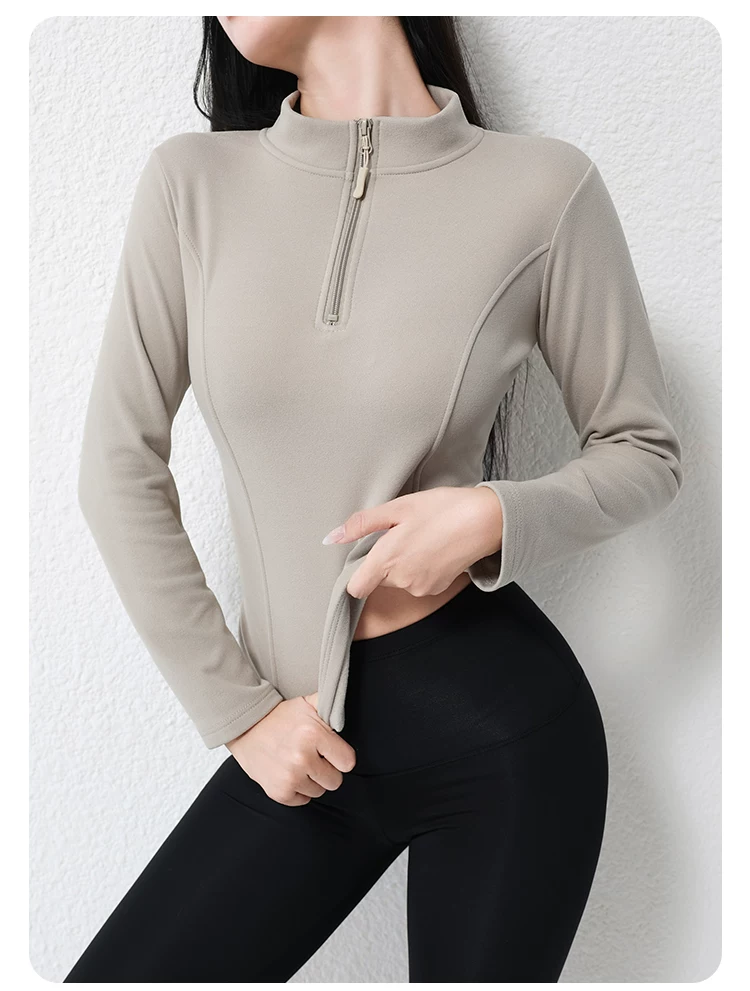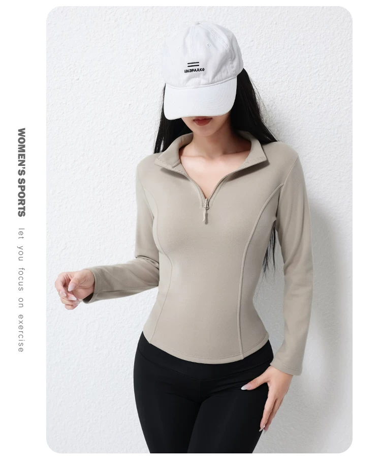 Áo thun nữ tay dài kiểu Mỹ cổ đứng nửa khóa kéo thời trang thiết kế xương cá ôm dáng năm 2026