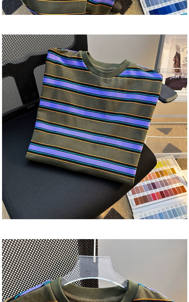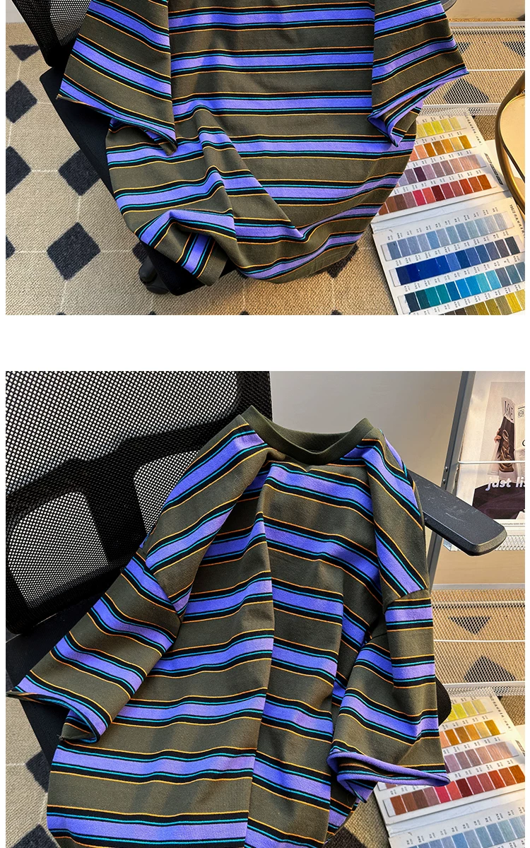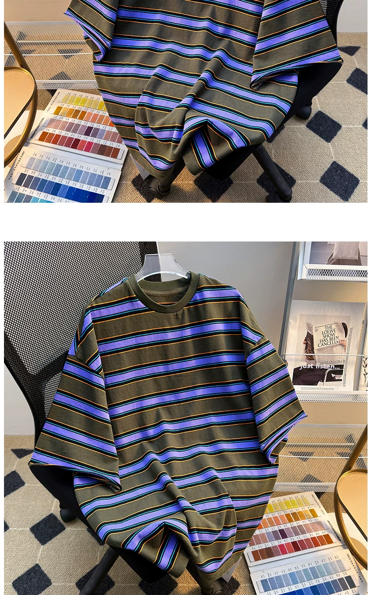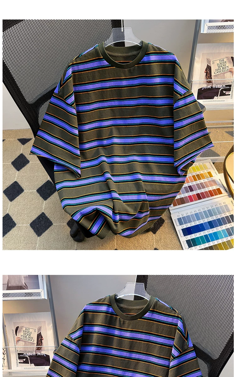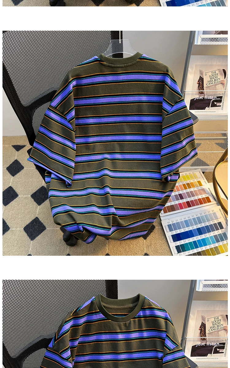 - Áo thun sọc ngắn tay cho nam, thương hiệu thời trang mùa hè, dáng rộng, áo thun nửa tay cho cặp đôi, áo đôi phong cách retro Mỹ.