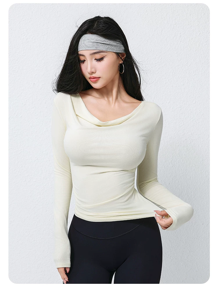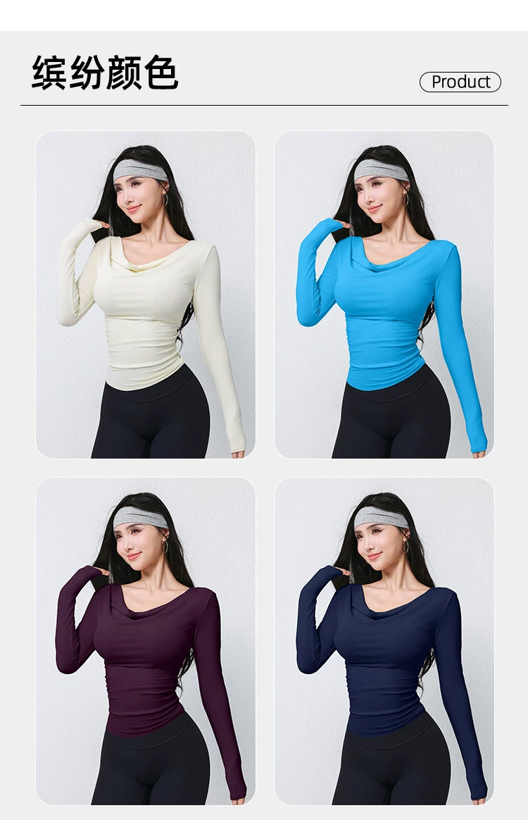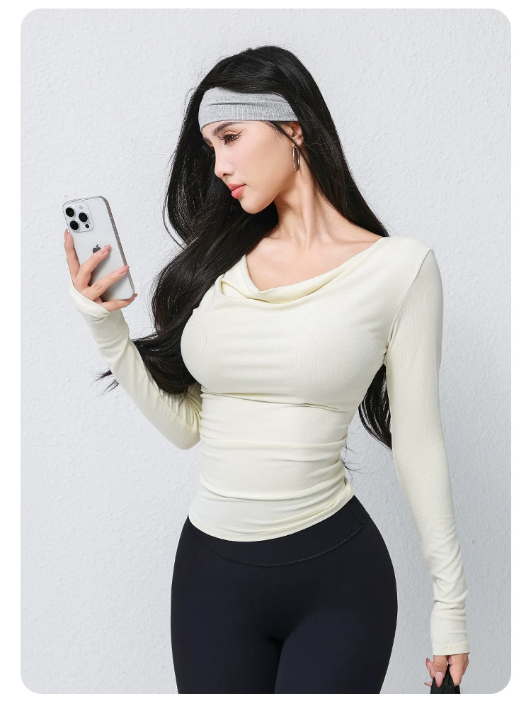Áo thun thể thao dài tay mùa thu dành cho nữ, cổ áo xếp nếp, áo tập yoga ôm dáng thời trang, áo tập thể dục ôm sát dài ngang vai.