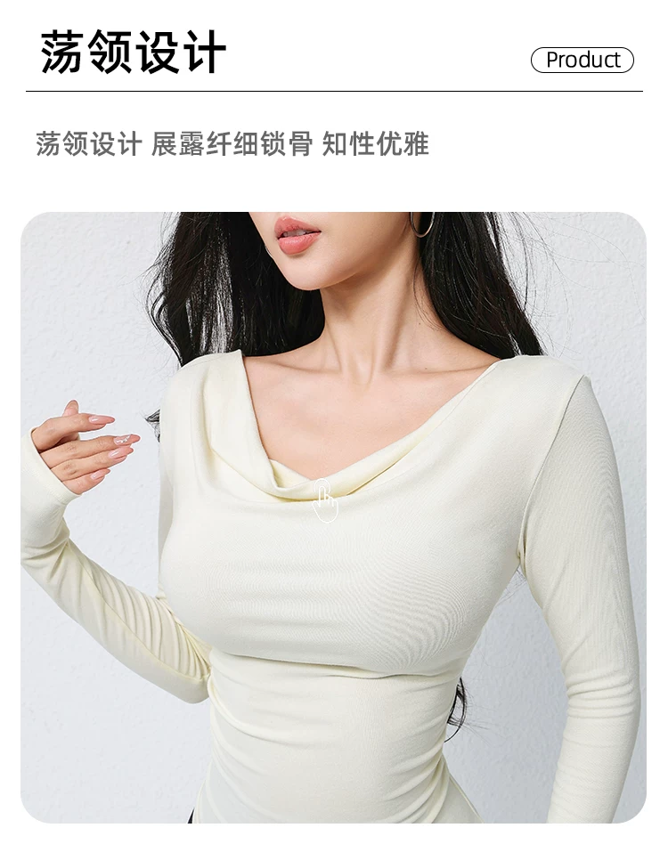 - Áo thun thể thao dài tay mùa thu dành cho nữ, cổ áo xếp nếp, áo tập yoga ôm dáng thời trang, áo tập thể dục ôm sát dài ngang vai.
