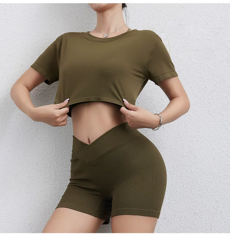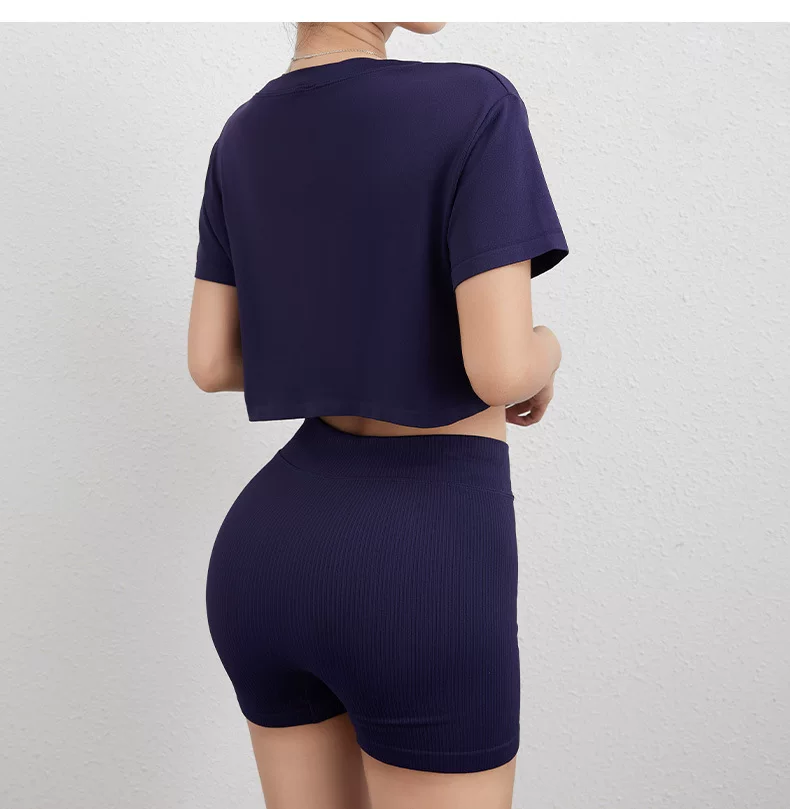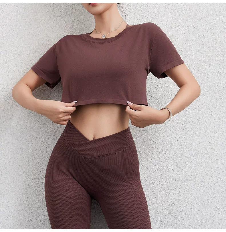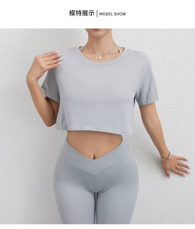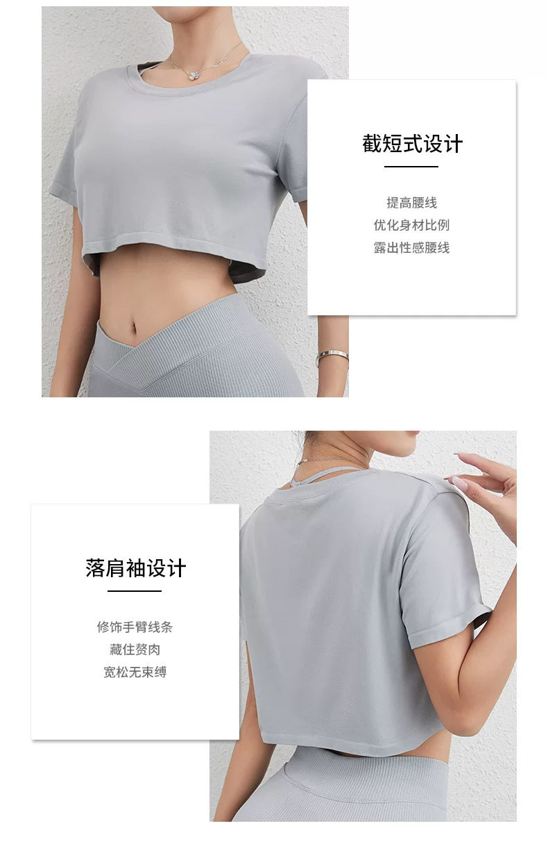 Áo thun thể thao Jiumai Yipin dành cho nữ, áo crop top ngắn rộng rãi, nhanh khô, áo tập yoga, áo chạy bộ ngắn tay.