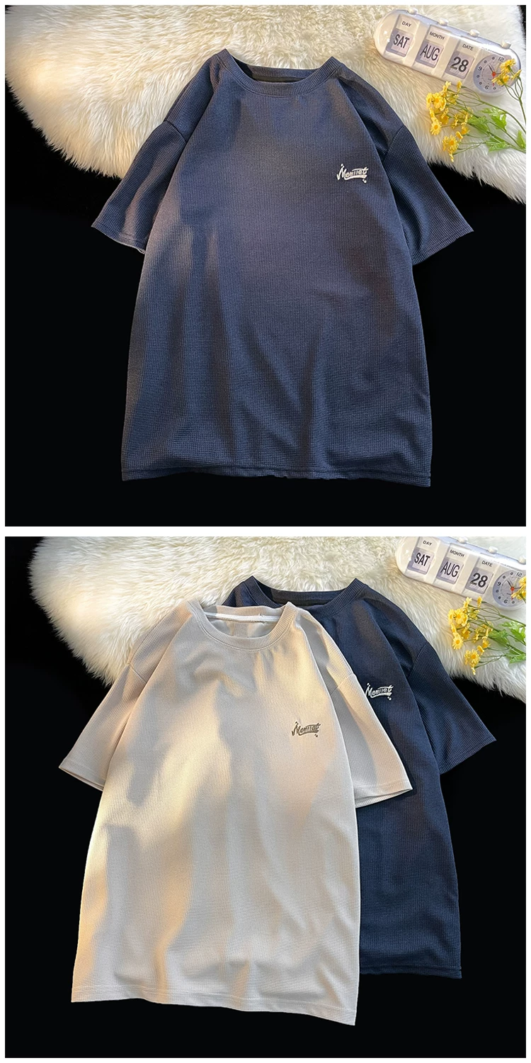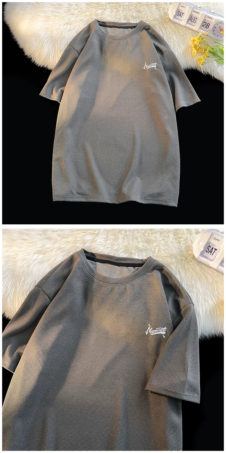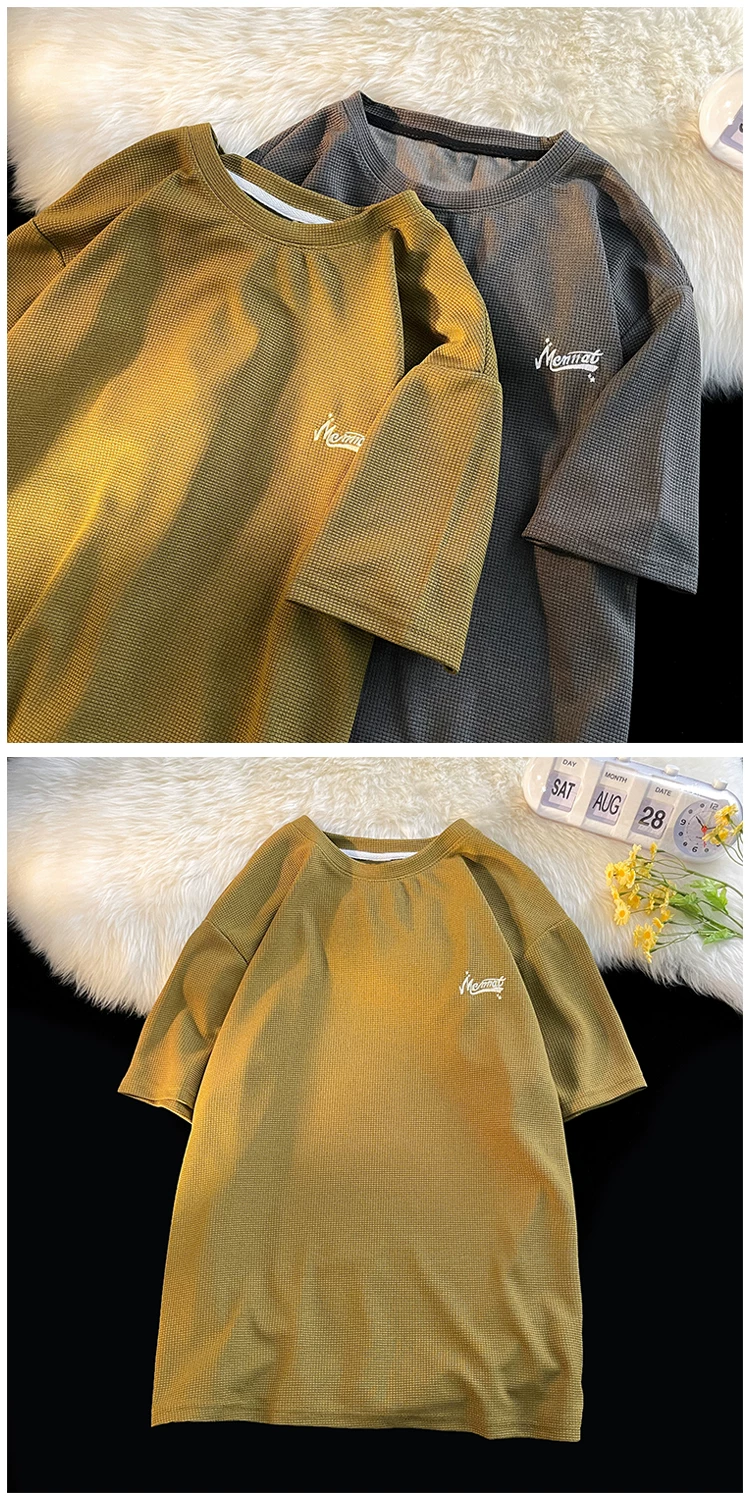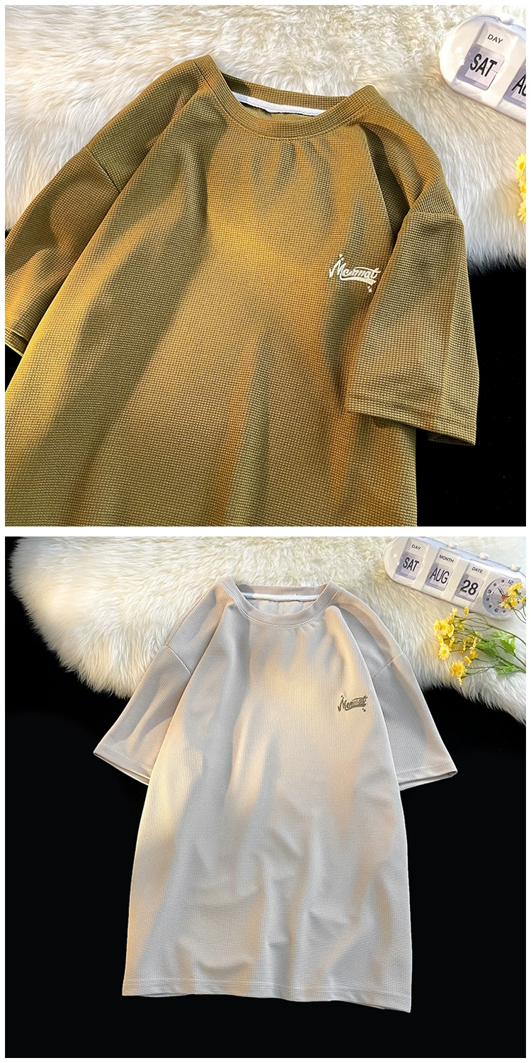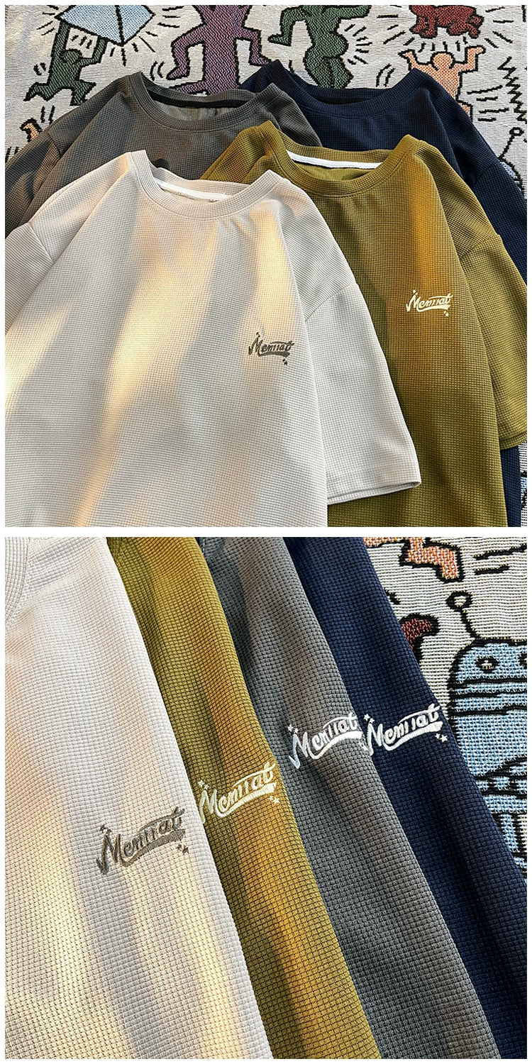 - Áo thun waffle kiểu Hồng Kông dành cho nam, áo thun tay ngắn cổ tròn rộng rãi mùa hè, áo cặp đôi sinh viên thời trang tay lửng.