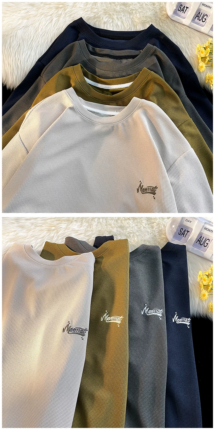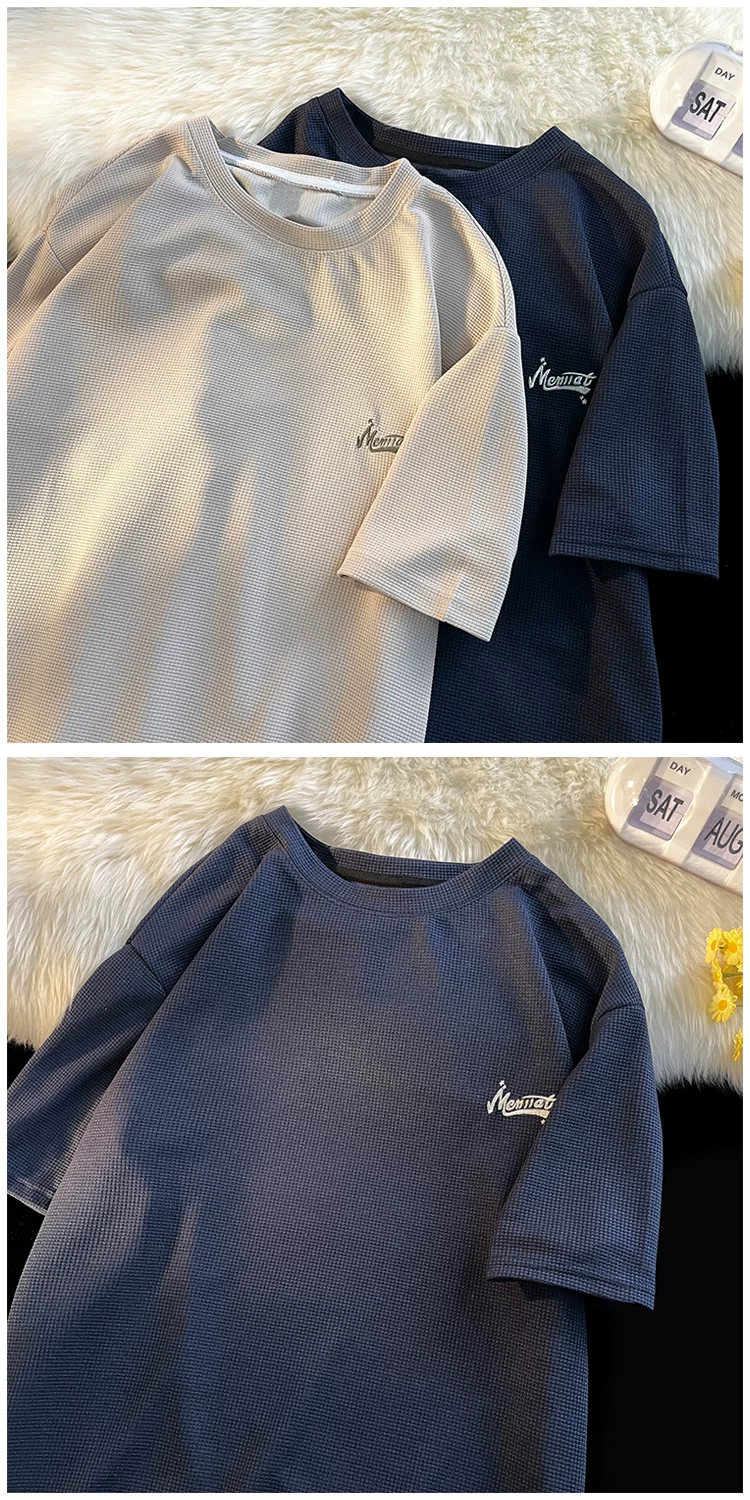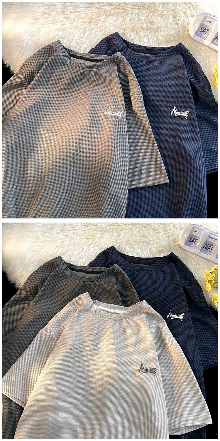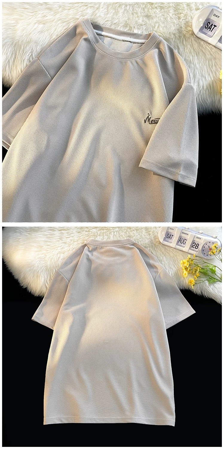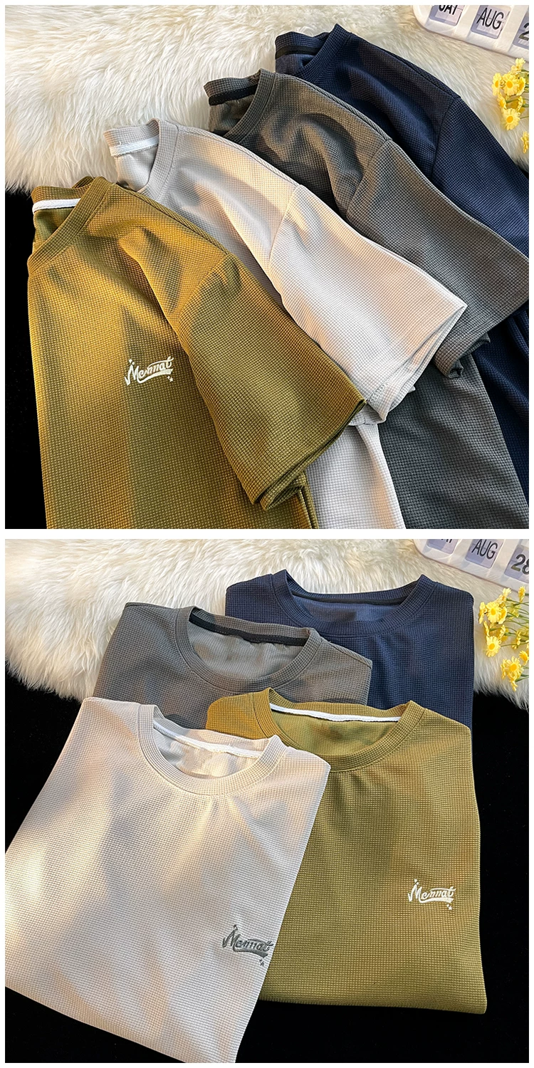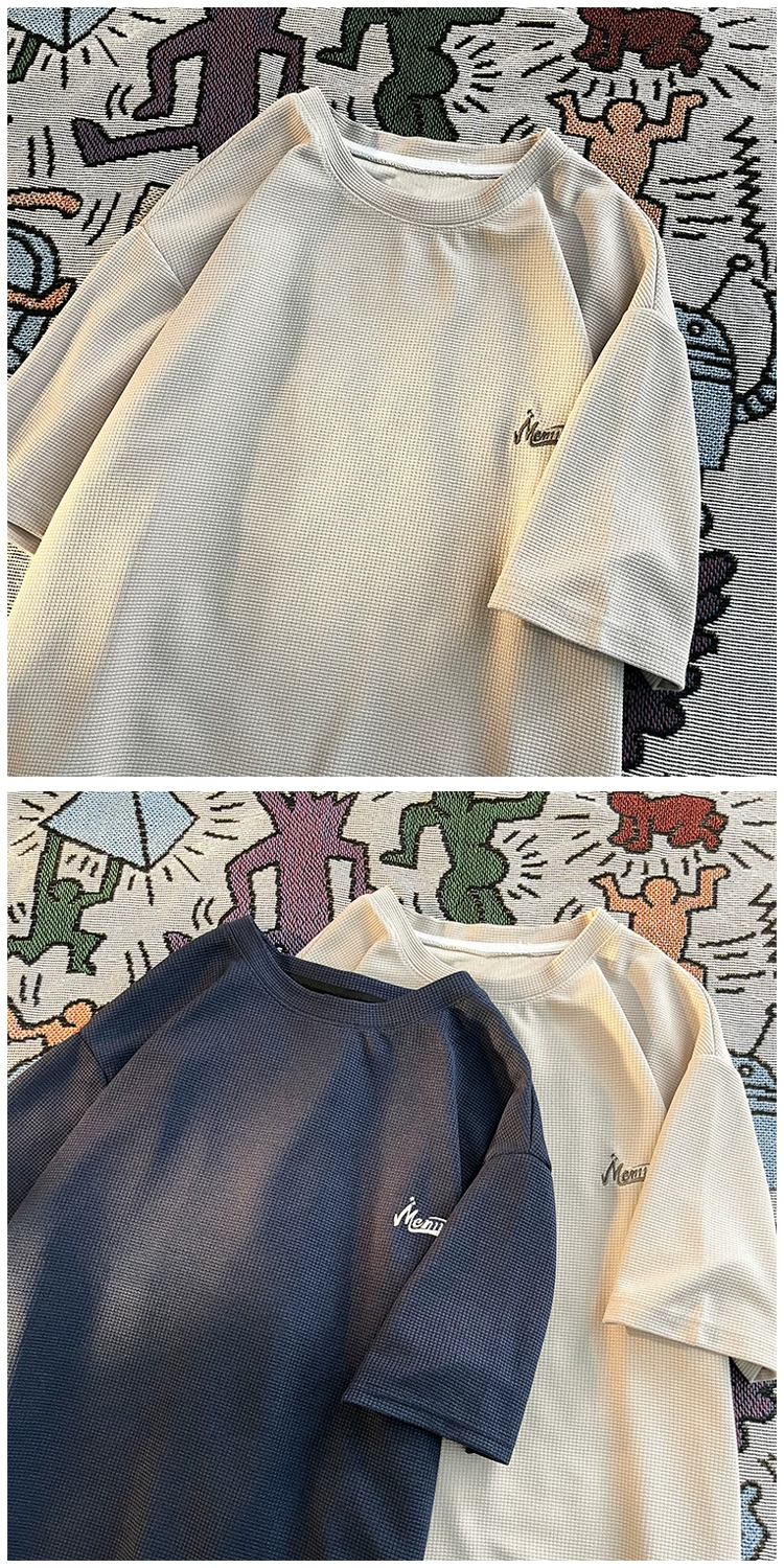 - Áo thun waffle kiểu Hồng Kông dành cho nam, áo thun tay ngắn cổ tròn rộng rãi mùa hè, áo cặp đôi sinh viên thời trang tay lửng.