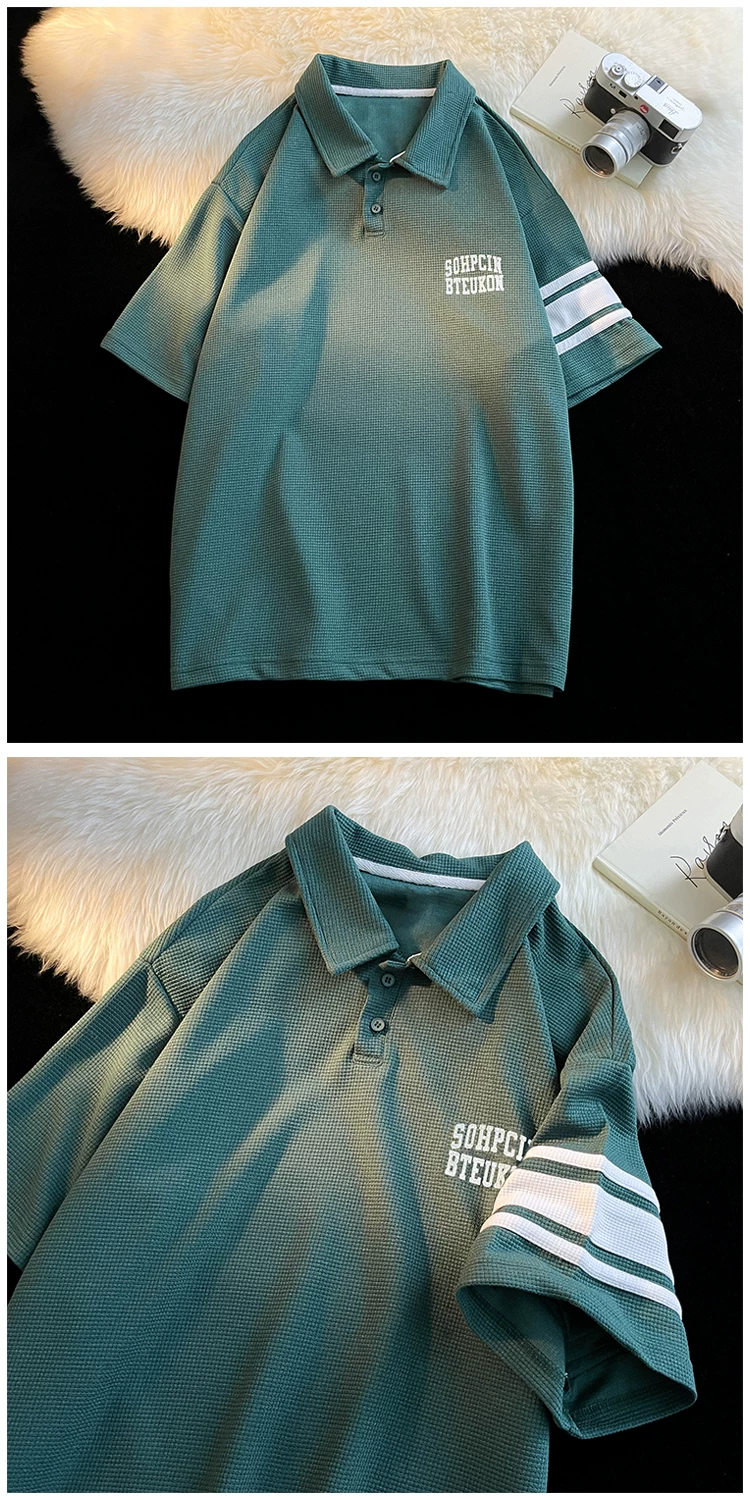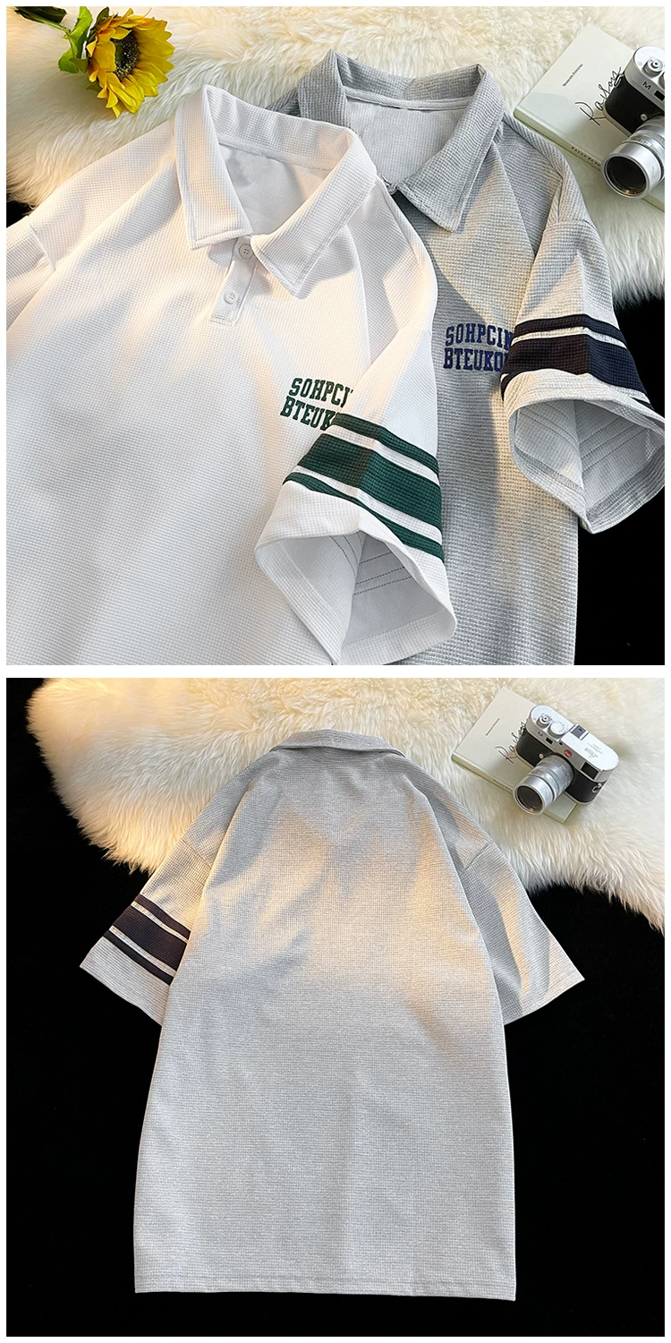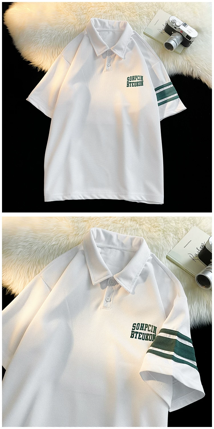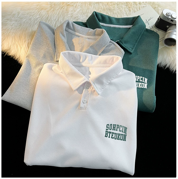Áo thun waffle kiểu Mỹ dành cho nam, áo polo tay ngắn dáng rộng, thời trang mùa hè, đa năng, áo đôi tay lửng.