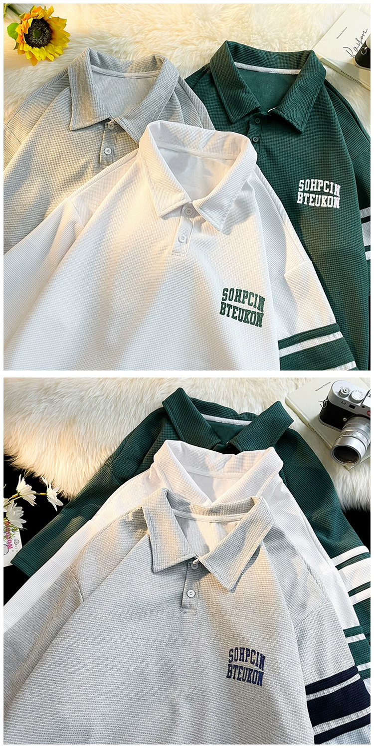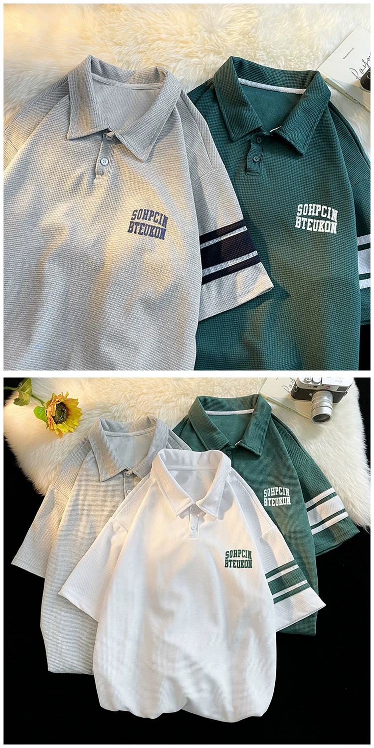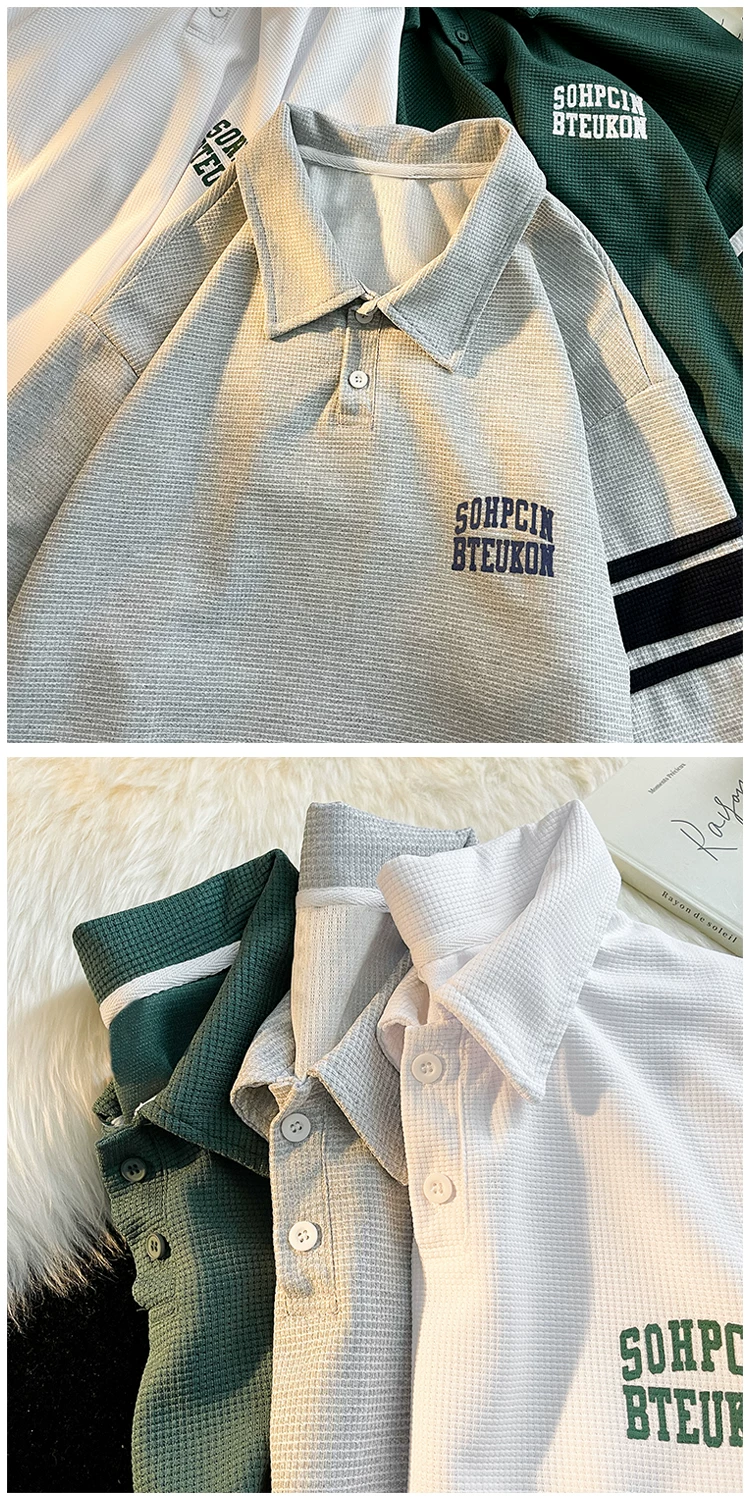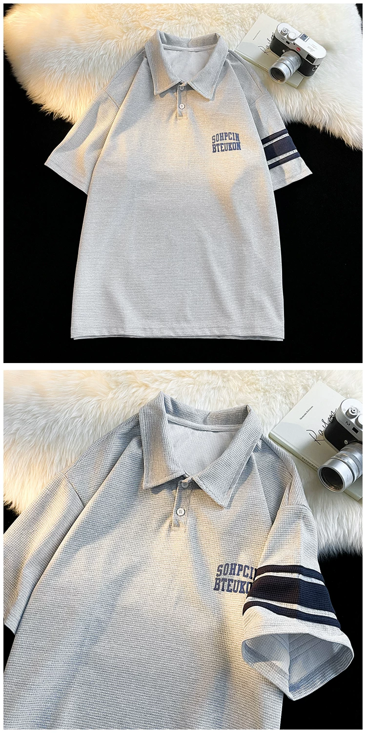 Áo thun waffle kiểu Mỹ dành cho nam, áo polo tay ngắn dáng rộng, thời trang mùa hè, đa năng, áo đôi tay lửng.