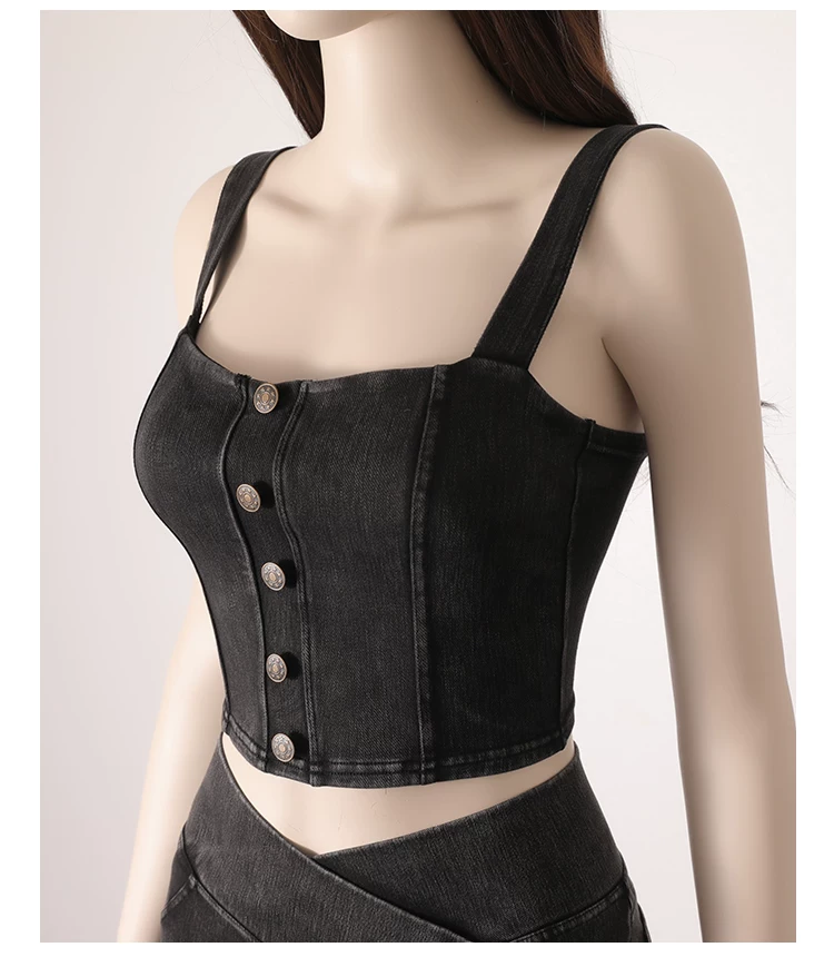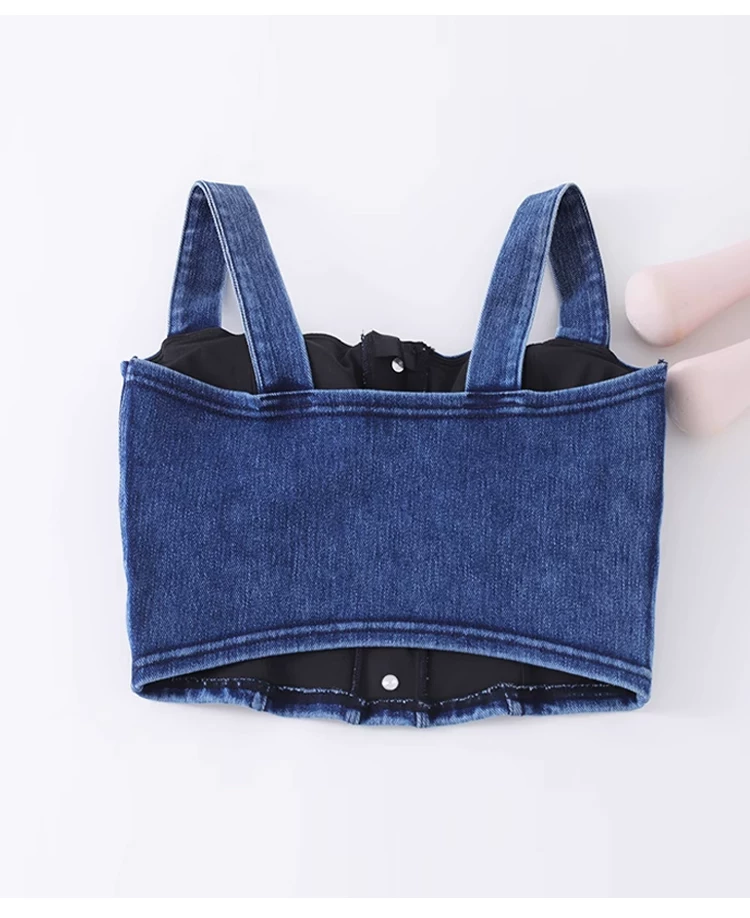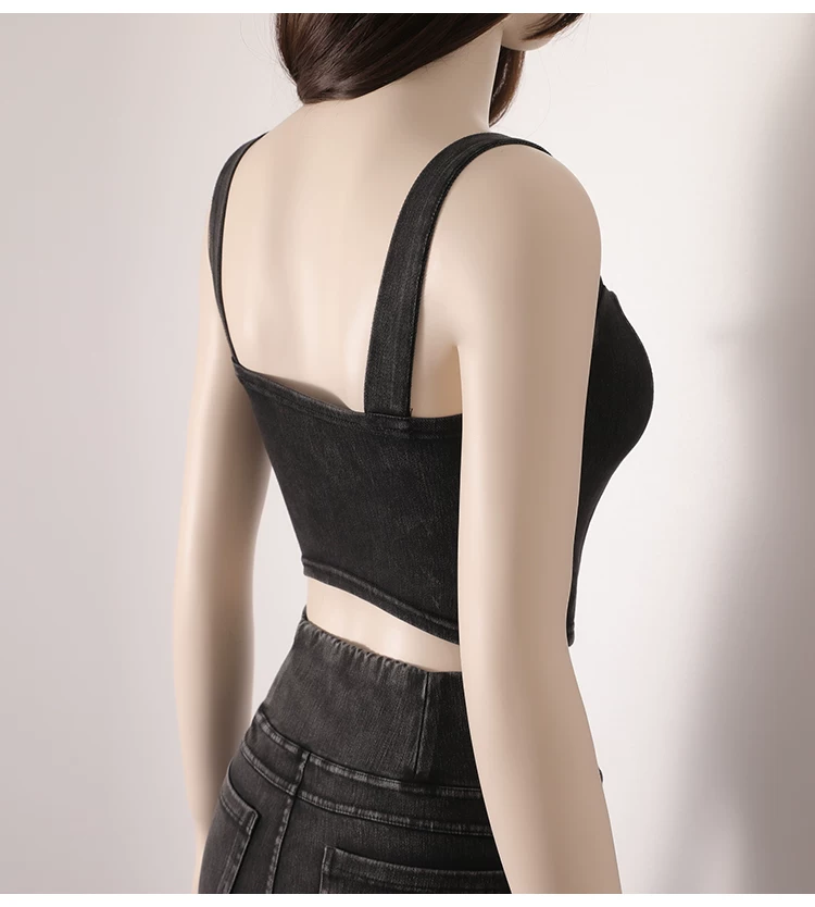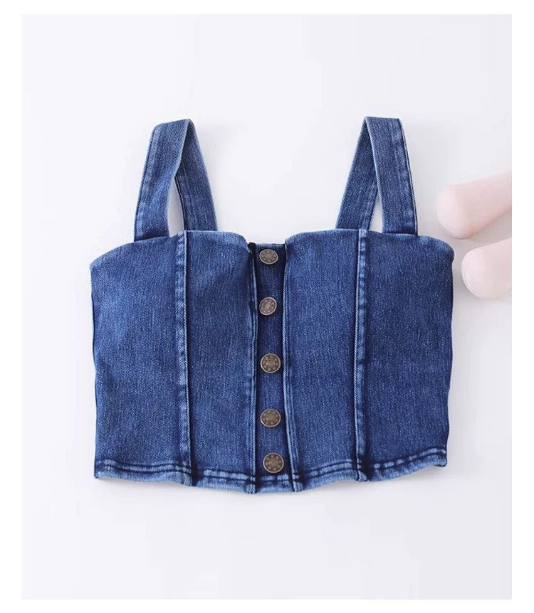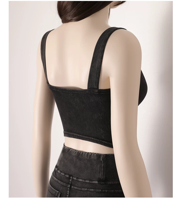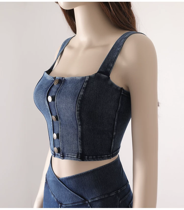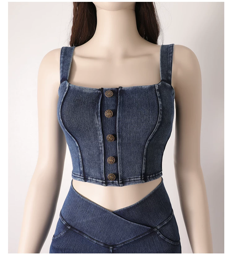 - Áo yếm giả denim có cúc, có đệm ngực, áo lót gợi cảm dành cho trang phục tập yoga mùa hè.