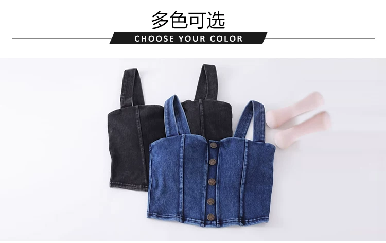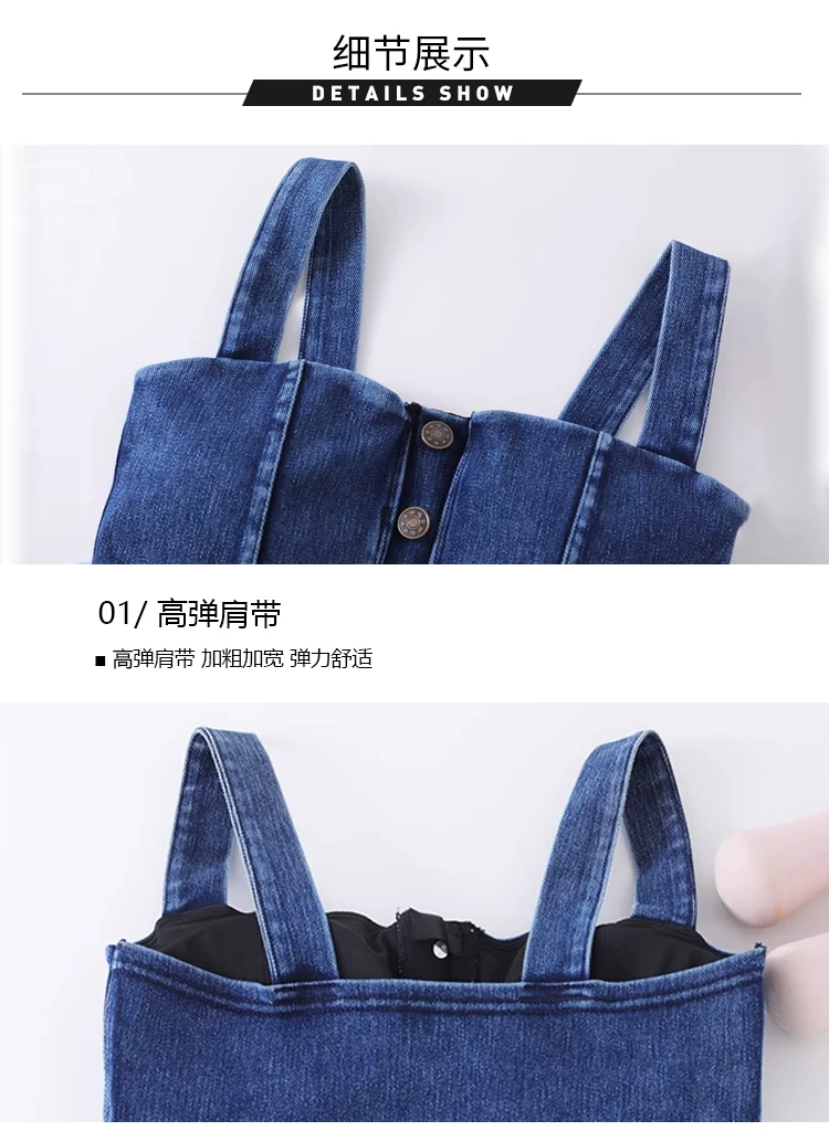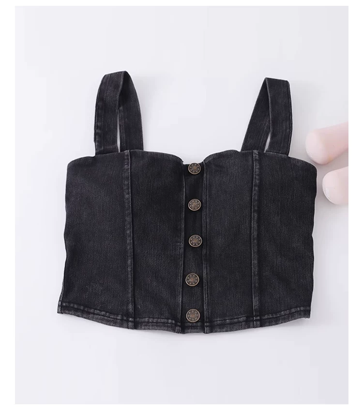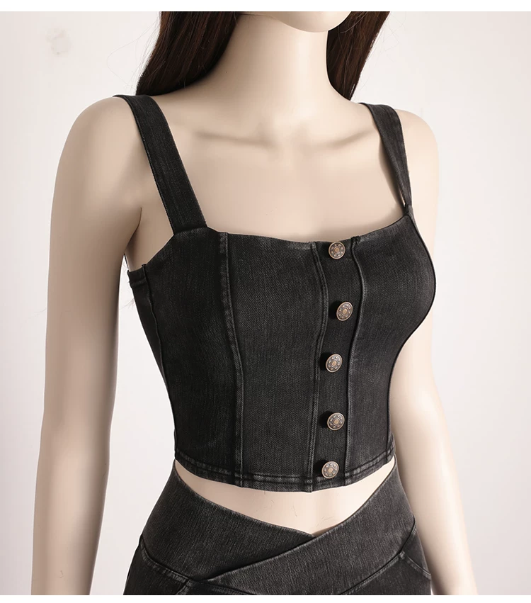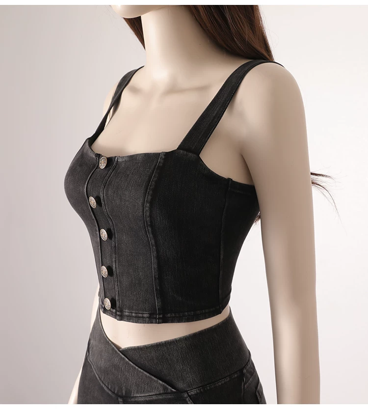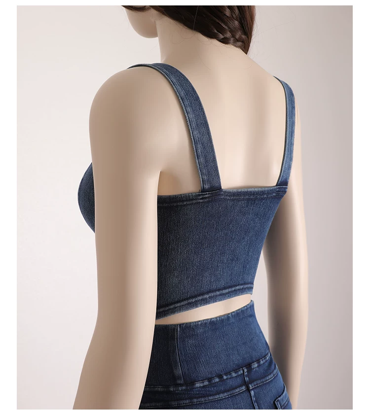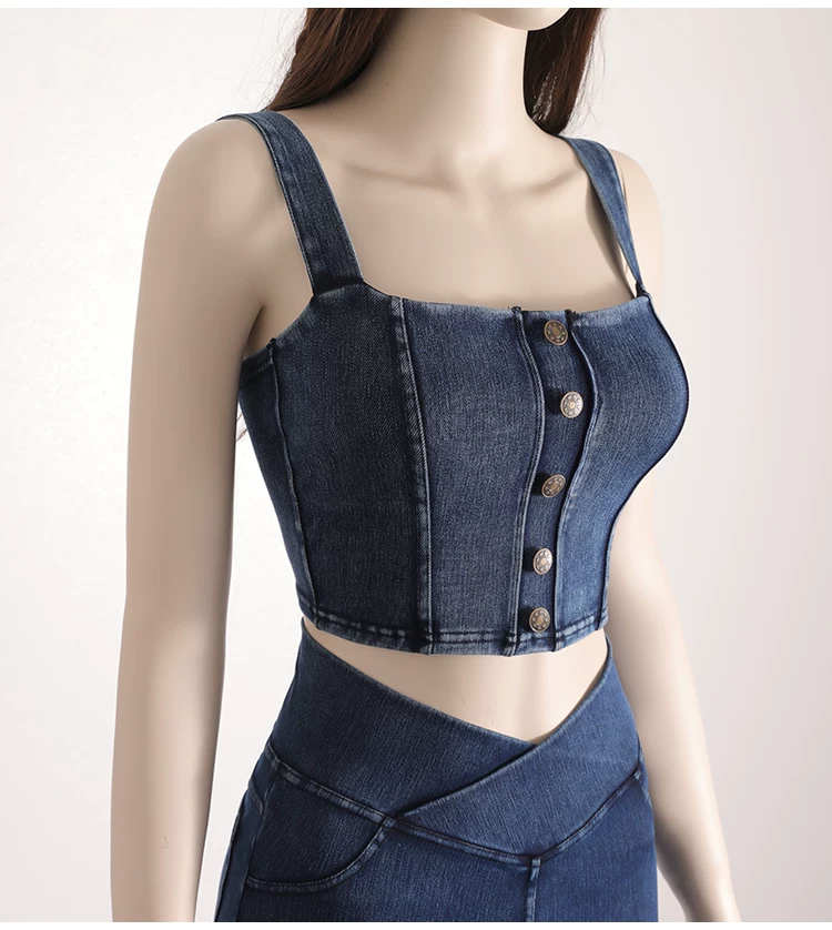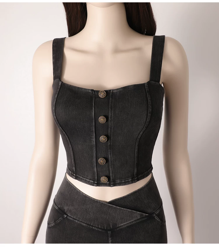 - Áo yếm giả denim có cúc, có đệm ngực, áo lót gợi cảm dành cho trang phục tập yoga mùa hè.