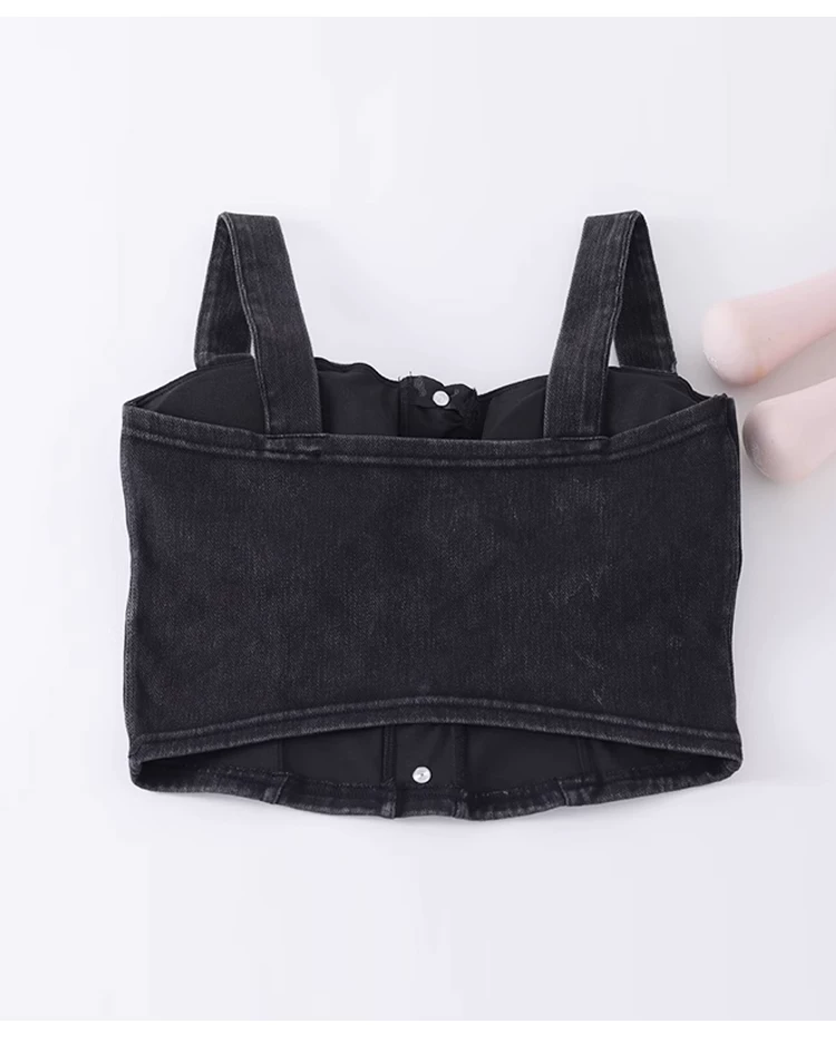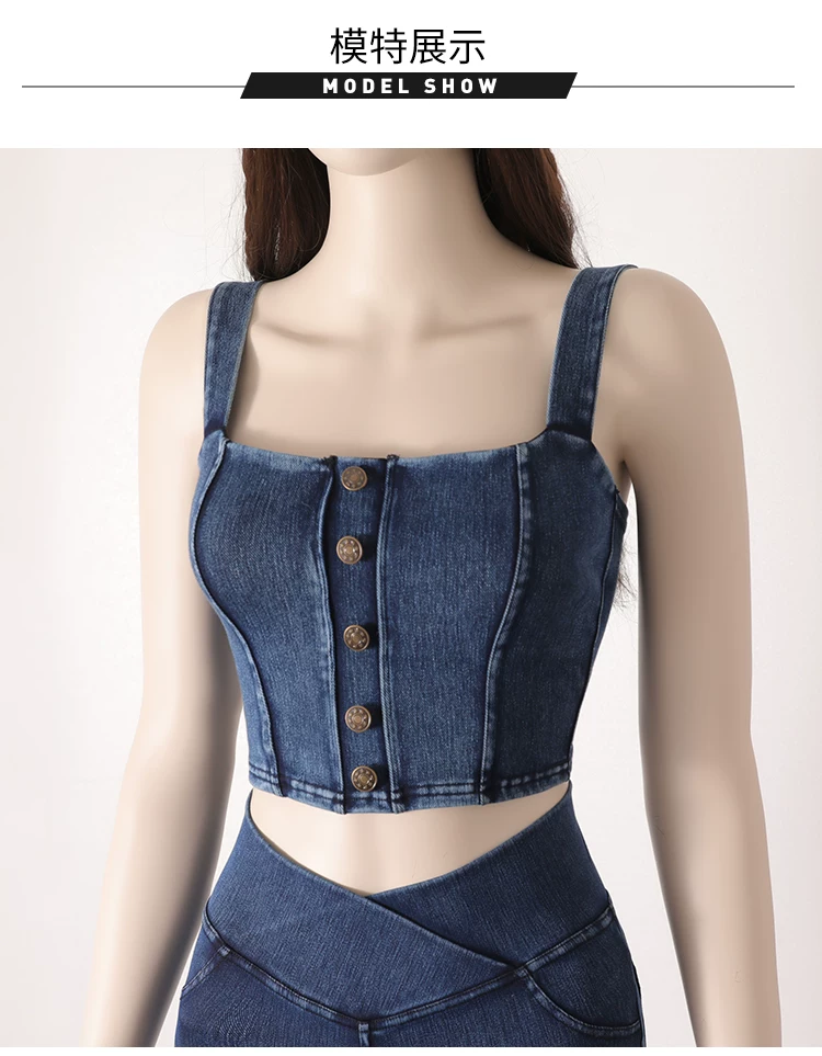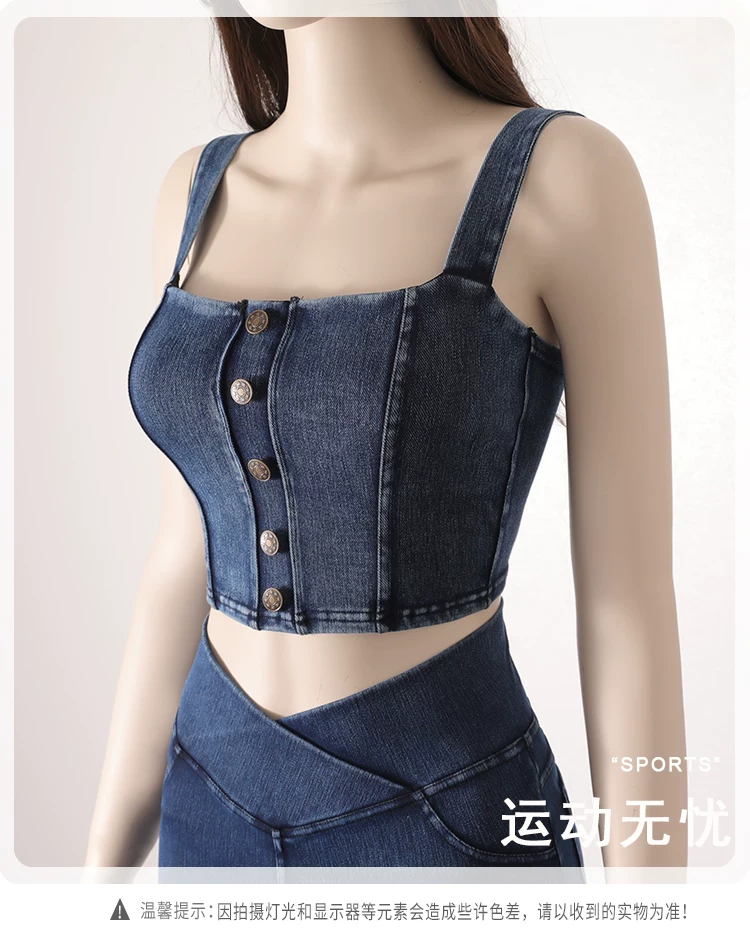 Áo yếm giả denim có cúc, có đệm ngực, áo lót gợi cảm dành cho trang phục tập yoga mùa hè.